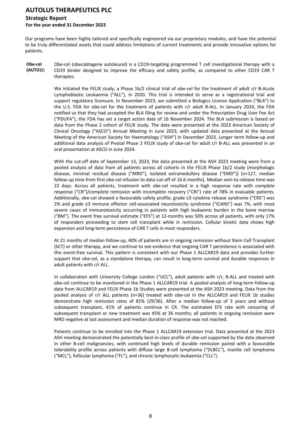 Our programs have been highly tailored and specifically engineered via our proprietary modules, and have the potential to be truly differentiated assets that could address limitations of current treatments and provide innovative options for patients. Obe-cel (AUTO1): Obe-cel (obecabtagene autoleucel) is a CD19-targeting programmed T cell investigational therapy with a CD19 binder designed to improve the efficacy and safety profile, as compared to other CD19 CAR T therapies. We initiated the FELIX study, a Phase 1b/2 clinical trial of obe-cel for the treatment of adult r/r B-Acute Lymphoblastic Leukaemia (“ALL”), in 2020. This trial is intended to serve as a registrational trial and support regulatory licensure. In November 2023, we submitted a Biologics License Application (“BLA”) to the U.S. FDA for obe-cel for the treatment of patients with r/r adult B-ALL. In January 2024, the FDA notified us that they had accepted the BLA filing for review and under the Prescription Drug User Fee Act (“PDUFA”), the FDA has set a target action date of 16 November 2024. The BLA submission is based on data from the Phase 2 cohort of FELIX study. The data were presented at the 2023 American Society of Clinical Oncology (“ASCO”) Annual Meeting in June 2023, with updated data presented at the Annual Meeting of the American Society for Haematology (“ASH”) in December 2023. Longer term follow-up and additional data analysis of Pivotal Phase 2 FELIX study of obe-cel for adult r/r B-ALL was presented in an oral presentation at ASCO in June 2024. With the cut-off date of September 13, 2023, the data presented at the ASH 2023 meeting were from a pooled analysis of data from all patients across all cohorts in the FELIX Phase 1b/2 study (morphologic disease, minimal residual disease (“MRD”), isolated extramedullary disease (“EMD”)) (n=127, median follow-up time from first obe-cel infusion to data cut-off of 16.6 months). Median vein-to-release time was 22 days. Across all patients, treatment with obe-cel resulted in a high response rate with complete response (“CR”)/complete remission with incomplete recovery (“CRi”) rate of 78% in evaluable patients. Additionally, obe-cel showed a favourable safety profile; grade ≥3 cytokine release syndrome (“CRS”) was 2% and grade ≥3 immune effector cell-associated neurotoxicity syndrome (“ICANS”) was 7%, with most severe cases of immunotoxicity occurring in patients with high leukaemic burden in the bone marrow (“BM”). The event free survival estimate (“EFS”) at 12-months was 50% across all patients, with only 17% of responders proceeding to stem cell transplant while in remission. Cellular kinetic data shows high expansion and long-term persistence of CAR T cells in most responders. At 21 months of median follow-up, 40% of patients are in ongoing remission without Stem Cell Transplant (SCT) or other therapy, and we continue to see evidence that ongoing CAR T persistence is associated with this event-free survival. This pattern is consistent with our Phase 1 ALLCAR19 data and provides further support that obe-cel, as a standalone therapy, can result in long-term survival and durable responses in adult patients with r/r ALL. In collaboration with University College London (“UCL”), adult patients with r/r, B-ALL and treated with obe-cel continue to be monitored in the Phase 1 ALLCAR19 trial. A pooled analysis of long-term follow-up data from ALLCAR19 and FELIX Phase 1b Studies were presented at the ASH 2023 meeting. Data from the pooled analysis of r/r ALL patients (n=36) treated with obe-cel in the ALLCAR19 and FELIX 1b studies demonstrate high remission rates of 81% (29/36). After a median follow-up of 3 years and without subsequent transplant, 41% of patients continue in CR. The estimated EFS rate with censoring of subsequent transplant or new treatment was 45% at 36 months; all patients in ongoing remission were MRD negative at last assessment and median duration of response was not reached. Patients continue to be enrolled into the Phase 1 ALLCAR19 extension trial. Data presented at the 2023 ASH meeting demonstrated the potentially best-in-class profile of obe-cel supported by the data observed in other B-cell malignancies, with continued high levels of durable remission paired with a favourable tolerability profile across patients with diffuse large B-cell lymphoma (“DLBCL”), mantle cell lymphoma (“MCL”), follicular lymphoma (“FL”), and chronic lymphocytic leukaemia (“CLL”). AUTOLUS THERAPEUTICS PLC Strategic Report For the year ended 31 December 2023 8
