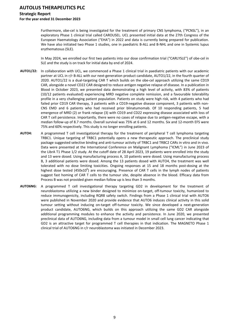Furthermore, obe-cel is being investigated for the treatment of primary CNS lymphoma, (“PCNSL”), in an exploratory Phase 1 clinical trial called CAROUSEL. UCL presented initial data at the 27th Congress of the European Haematology Association (“EHA”) in 2022 and data is currently being prepared for publication. We have also initiated two Phase 1 studies, one in paediatric B-ALL and B-NHL and one in Systemic lupus erythematosus (SLE). In May 2024, we enrolled our first two patients into our dose confirmation trial (“CARLYSLE”) of obe-cel in SLE and the study is on track for initial data by end of 2024. AUTO1/22: In collaboration with UCL, we commenced a Phase 1 clinical trial in paediatric patients with our academic partner at UCL in r/r B-ALL with our next-generation product candidate, AUTO1/22, in the fourth quarter of 2020. AUTO1/22 is a dual-targeting CAR T which builds on the obe-cel approach utilizing the same CD19 CAR, alongside a novel CD22 CAR designed to reduce antigen negative relapse of disease. In a publication in Blood in October 2023, we presented data demonstrating a high level of activity, with 83% of patients (10/12 patients evaluated) experiencing MRD negative complete remission, and a favourable tolerability profile in a very challenging patient population. Patients on study were high risk, with 4 patients who had failed prior CD19 CAR therapy, 3 patients with a CD19-negative disease component, 3 patients with non- CNS EMD and 6 patients who had received prior blinatumomab. Of 10 responding patients, 5 had emergence of MRD (2) or frank relapse (3) with CD19 and CD22 expressing disease associated with loss of CAR T cell persistence. Importantly, there were no cases of relapse due to antigen-negative escape, with a median follow-up of 8.7 months. Overall survival was 75% at 6 and 12 months. Six and 12-month EFS were 75% and 60% respectively. This study is no longer enrolling patients. AUTO4: A programmed T cell investigational therapy for the treatment of peripheral T cell lymphoma targeting TRBC1. Unique targeting of TRBC1 potentially opens a new therapeutic approach. The preclinical study package suggested selective binding and anti-tumour activity of TRBC1 and TRBC2 CARs in vitro and in vivo. Data were presented at the International Conference on Malignant Lymphoma (“ICML”) in June 2023 of the LibrA T1 Phase 1/2 study. At the cutoff date of 28 April 2023, 19 patients were enrolled into the study and 13 were dosed. Using manufacturing process A, 10 patients were dosed. Using manufacturing process B, 3 additional patients were dosed. Among the 13 patients dosed with AUTO4, the treatment was well tolerated with no dose limiting toxicities. Ongoing responses at 15 and 18 months post-dosing at the highest dose tested (450x106) are encouraging. Presence of CAR T cells in the lymph nodes of patients suggest fast homing of CAR T cells to the tumour site, despite absence in the blood. Efficacy data from Process B was not provided given median follow up is less than 3 months. AUTO6NG: A programmed T cell investigational therapy targeting GD2 in development for the treatment of neuroblastoma utilizing a new binder designed to minimize on-target, off-tumour toxicity, humanized to reduce immunogenicity, including RQR8 safety switch. Findings from a Phase 1 clinical trial with AUTO6 were published in November 2020 and provide evidence that AUTO6 induces clinical activity in this solid tumour setting without inducing on-target off-tumour toxicity. We since developed a next-generation product candidate, AUTO6NG, which builds on this approach utilizing the same GD2 CAR alongside additional programming modules to enhance the activity and persistence. In June 2020, we presented preclinical data of AUTO6NG, including data from a tumour model in small cell lung cancer indicating that GD2 is an attractive target for programmed T cell therapies in that indication. The MAGNETO Phase 1 clinical trial of AUTO6NG in r/r neuroblastoma was initiated in December 2023. AUTOLUS THERAPEUTICS PLC Strategic Report For the year ended 31 December 2023 9