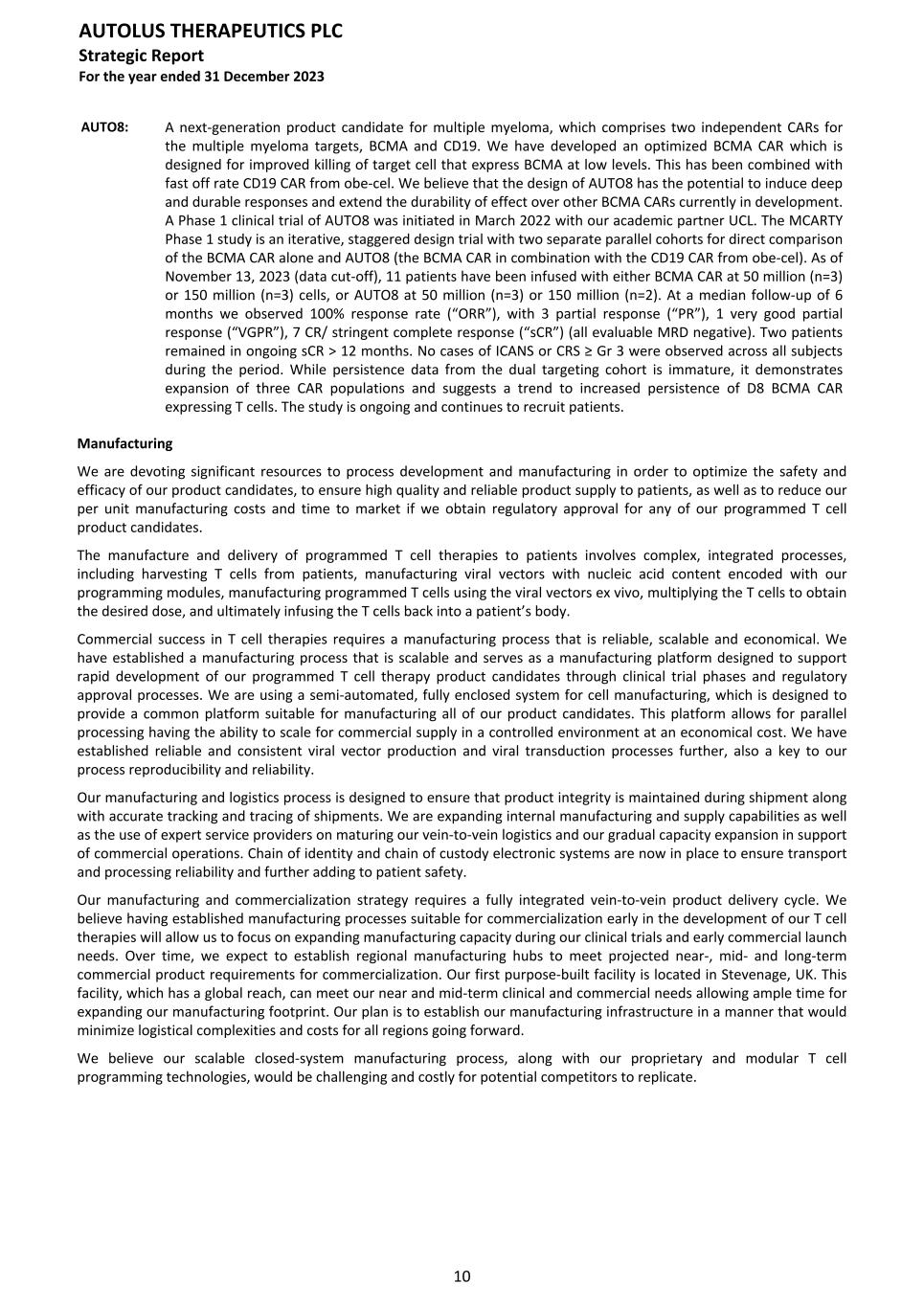 AUTO8: A next-generation product candidate for multiple myeloma, which comprises two independent CARs for the multiple myeloma targets, BCMA and CD19. We have developed an optimized BCMA CAR which is designed for improved killing of target cell that express BCMA at low levels. This has been combined with fast off rate CD19 CAR from obe-cel. We believe that the design of AUTO8 has the potential to induce deep and durable responses and extend the durability of effect over other BCMA CARs currently in development. A Phase 1 clinical trial of AUTO8 was initiated in March 2022 with our academic partner UCL. The MCARTY Phase 1 study is an iterative, staggered design trial with two separate parallel cohorts for direct comparison of the BCMA CAR alone and AUTO8 (the BCMA CAR in combination with the CD19 CAR from obe-cel). As of November 13, 2023 (data cut-off), 11 patients have been infused with either BCMA CAR at 50 million (n=3) or 150 million (n=3) cells, or AUTO8 at 50 million (n=3) or 150 million (n=2). At a median follow-up of 6 months we observed 100% response rate (“ORR”), with 3 partial response (“PR”), 1 very good partial response (“VGPR”), 7 CR/ stringent complete response (“sCR”) (all evaluable MRD negative). Two patients remained in ongoing sCR > 12 months. No cases of ICANS or CRS ≥ Gr 3 were observed across all subjects during the period. While persistence data from the dual targeting cohort is immature, it demonstrates expansion of three CAR populations and suggests a trend to increased persistence of D8 BCMA CAR expressing T cells. The study is ongoing and continues to recruit patients. Manufacturing We are devoting significant resources to process development and manufacturing in order to optimize the safety and efficacy of our product candidates, to ensure high quality and reliable product supply to patients, as well as to reduce our per unit manufacturing costs and time to market if we obtain regulatory approval for any of our programmed T cell product candidates. The manufacture and delivery of programmed T cell therapies to patients involves complex, integrated processes, including harvesting T cells from patients, manufacturing viral vectors with nucleic acid content encoded with our programming modules, manufacturing programmed T cells using the viral vectors ex vivo, multiplying the T cells to obtain the desired dose, and ultimately infusing the T cells back into a patient’s body. Commercial success in T cell therapies requires a manufacturing process that is reliable, scalable and economical. We have established a manufacturing process that is scalable and serves as a manufacturing platform designed to support rapid development of our programmed T cell therapy product candidates through clinical trial phases and regulatory approval processes. We are using a semi-automated, fully enclosed system for cell manufacturing, which is designed to provide a common platform suitable for manufacturing all of our product candidates. This platform allows for parallel processing having the ability to scale for commercial supply in a controlled environment at an economical cost. We have established reliable and consistent viral vector production and viral transduction processes further, also a key to our process reproducibility and reliability. Our manufacturing and logistics process is designed to ensure that product integrity is maintained during shipment along with accurate tracking and tracing of shipments. We are expanding internal manufacturing and supply capabilities as well as the use of expert service providers on maturing our vein-to-vein logistics and our gradual capacity expansion in support of commercial operations. Chain of identity and chain of custody electronic systems are now in place to ensure transport and processing reliability and further adding to patient safety. Our manufacturing and commercialization strategy requires a fully integrated vein-to-vein product delivery cycle. We believe having established manufacturing processes suitable for commercialization early in the development of our T cell therapies will allow us to focus on expanding manufacturing capacity during our clinical trials and early commercial launch needs. Over time, we expect to establish regional manufacturing hubs to meet projected near-, mid- and long-term commercial product requirements for commercialization. Our first purpose-built facility is located in Stevenage, UK. This facility, which has a global reach, can meet our near and mid-term clinical and commercial needs allowing ample time for expanding our manufacturing footprint. Our plan is to establish our manufacturing infrastructure in a manner that would minimize logistical complexities and costs for all regions going forward. We believe our scalable closed-system manufacturing process, along with our proprietary and modular T cell programming technologies, would be challenging and costly for potential competitors to replicate. AUTOLUS THERAPEUTICS PLC Strategic Report For the year ended 31 December 2023 10