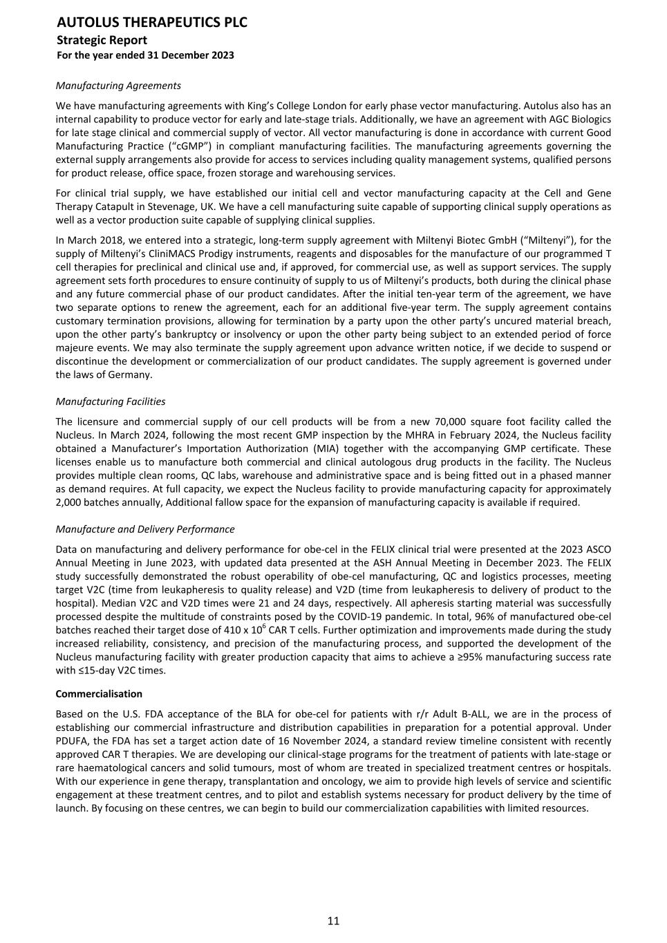 Manufacturing Agreements We have manufacturing agreements with King’s College London for early phase vector manufacturing. Autolus also has an internal capability to produce vector for early and late-stage trials. Additionally, we have an agreement with AGC Biologics for late stage clinical and commercial supply of vector. All vector manufacturing is done in accordance with current Good Manufacturing Practice (“cGMP”) in compliant manufacturing facilities. The manufacturing agreements governing the external supply arrangements also provide for access to services including quality management systems, qualified persons for product release, office space, frozen storage and warehousing services. For clinical trial supply, we have established our initial cell and vector manufacturing capacity at the Cell and Gene Therapy Catapult in Stevenage, UK. We have a cell manufacturing suite capable of supporting clinical supply operations as well as a vector production suite capable of supplying clinical supplies. In March 2018, we entered into a strategic, long-term supply agreement with Miltenyi Biotec GmbH (“Miltenyi”), for the supply of Miltenyi’s CliniMACS Prodigy instruments, reagents and disposables for the manufacture of our programmed T cell therapies for preclinical and clinical use and, if approved, for commercial use, as well as support services. The supply agreement sets forth procedures to ensure continuity of supply to us of Miltenyi’s products, both during the clinical phase and any future commercial phase of our product candidates. After the initial ten-year term of the agreement, we have two separate options to renew the agreement, each for an additional five-year term. The supply agreement contains customary termination provisions, allowing for termination by a party upon the other party’s uncured material breach, upon the other party’s bankruptcy or insolvency or upon the other party being subject to an extended period of force majeure events. We may also terminate the supply agreement upon advance written notice, if we decide to suspend or discontinue the development or commercialization of our product candidates. The supply agreement is governed under the laws of Germany. Manufacturing Facilities The licensure and commercial supply of our cell products will be from a new 70,000 square foot facility called the Nucleus. In March 2024, following the most recent GMP inspection by the MHRA in February 2024, the Nucleus facility obtained a Manufacturer’s Importation Authorization (MIA) together with the accompanying GMP certificate. These licenses enable us to manufacture both commercial and clinical autologous drug products in the facility. The Nucleus provides multiple clean rooms, QC labs, warehouse and administrative space and is being fitted out in a phased manner as demand requires. At full capacity, we expect the Nucleus facility to provide manufacturing capacity for approximately 2,000 batches annually, Additional fallow space for the expansion of manufacturing capacity is available if required. Manufacture and Delivery Performance Data on manufacturing and delivery performance for obe-cel in the FELIX clinical trial were presented at the 2023 ASCO Annual Meeting in June 2023, with updated data presented at the ASH Annual Meeting in December 2023. The FELIX study successfully demonstrated the robust operability of obe-cel manufacturing, QC and logistics processes, meeting target V2C (time from leukapheresis to quality release) and V2D (time from leukapheresis to delivery of product to the hospital). Median V2C and V2D times were 21 and 24 days, respectively. All apheresis starting material was successfully processed despite the multitude of constraints posed by the COVID-19 pandemic. In total, 96% of manufactured obe-cel batches reached their target dose of 410 x 106 CAR T cells. Further optimization and improvements made during the study increased reliability, consistency, and precision of the manufacturing process, and supported the development of the Nucleus manufacturing facility with greater production capacity that aims to achieve a ≥95% manufacturing success rate with ≤15-day V2C times. Commercialisation Based on the U.S. FDA acceptance of the BLA for obe-cel for patients with r/r Adult B-ALL, we are in the process of establishing our commercial infrastructure and distribution capabilities in preparation for a potential approval. Under PDUFA, the FDA has set a target action date of 16 November 2024, a standard review timeline consistent with recently approved CAR T therapies. We are developing our clinical-stage programs for the treatment of patients with late-stage or rare haematological cancers and solid tumours, most of whom are treated in specialized treatment centres or hospitals. With our experience in gene therapy, transplantation and oncology, we aim to provide high levels of service and scientific engagement at these treatment centres, and to pilot and establish systems necessary for product delivery by the time of launch. By focusing on these centres, we can begin to build our commercialization capabilities with limited resources. AUTOLUS THERAPEUTICS PLC Strategic Report For the year ended 31 December 2023 11