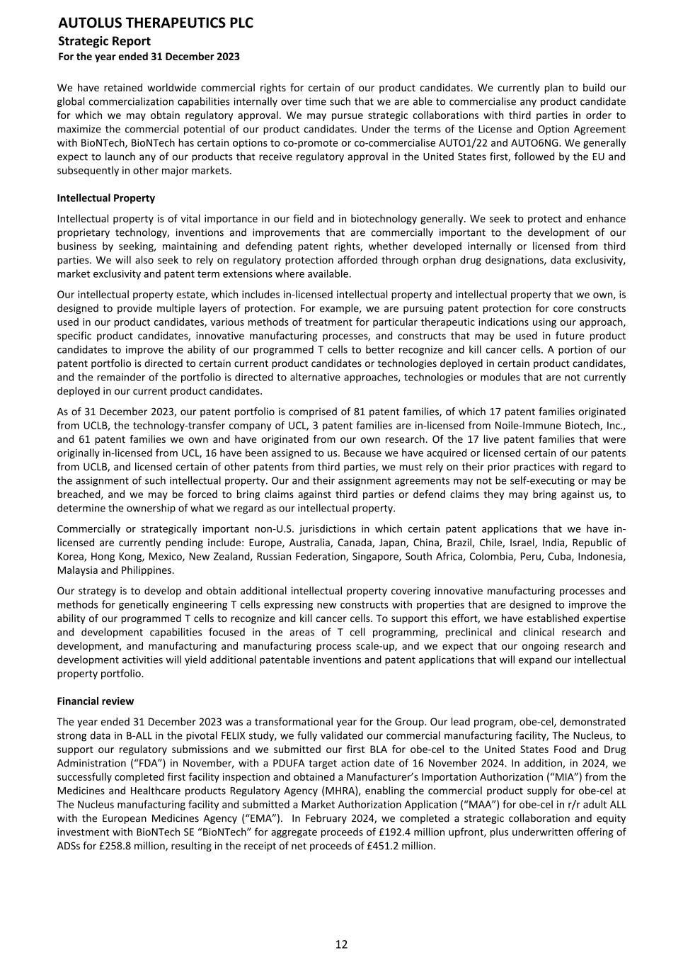 We have retained worldwide commercial rights for certain of our product candidates. We currently plan to build our global commercialization capabilities internally over time such that we are able to commercialise any product candidate for which we may obtain regulatory approval. We may pursue strategic collaborations with third parties in order to maximize the commercial potential of our product candidates. Under the terms of the License and Option Agreement with BioNTech, BioNTech has certain options to co-promote or co-commercialise AUTO1/22 and AUTO6NG. We generally expect to launch any of our products that receive regulatory approval in the United States first, followed by the EU and subsequently in other major markets. Intellectual Property Intellectual property is of vital importance in our field and in biotechnology generally. We seek to protect and enhance proprietary technology, inventions and improvements that are commercially important to the development of our business by seeking, maintaining and defending patent rights, whether developed internally or licensed from third parties. We will also seek to rely on regulatory protection afforded through orphan drug designations, data exclusivity, market exclusivity and patent term extensions where available. Our intellectual property estate, which includes in-licensed intellectual property and intellectual property that we own, is designed to provide multiple layers of protection. For example, we are pursuing patent protection for core constructs used in our product candidates, various methods of treatment for particular therapeutic indications using our approach, specific product candidates, innovative manufacturing processes, and constructs that may be used in future product candidates to improve the ability of our programmed T cells to better recognize and kill cancer cells. A portion of our patent portfolio is directed to certain current product candidates or technologies deployed in certain product candidates, and the remainder of the portfolio is directed to alternative approaches, technologies or modules that are not currently deployed in our current product candidates. As of 31 December 2023, our patent portfolio is comprised of 81 patent families, of which 17 patent families originated from UCLB, the technology-transfer company of UCL, 3 patent families are in-licensed from Noile-Immune Biotech, Inc., and 61 patent families we own and have originated from our own research. Of the 17 live patent families that were originally in-licensed from UCL, 16 have been assigned to us. Because we have acquired or licensed certain of our patents from UCLB, and licensed certain of other patents from third parties, we must rely on their prior practices with regard to the assignment of such intellectual property. Our and their assignment agreements may not be self-executing or may be breached, and we may be forced to bring claims against third parties or defend claims they may bring against us, to determine the ownership of what we regard as our intellectual property. Commercially or strategically important non-U.S. jurisdictions in which certain patent applications that we have in- licensed are currently pending include: Europe, Australia, Canada, Japan, China, Brazil, Chile, Israel, India, Republic of Korea, Hong Kong, Mexico, New Zealand, Russian Federation, Singapore, South Africa, Colombia, Peru, Cuba, Indonesia, Malaysia and Philippines. Our strategy is to develop and obtain additional intellectual property covering innovative manufacturing processes and methods for genetically engineering T cells expressing new constructs with properties that are designed to improve the ability of our programmed T cells to recognize and kill cancer cells. To support this effort, we have established expertise and development capabilities focused in the areas of T cell programming, preclinical and clinical research and development, and manufacturing and manufacturing process scale-up, and we expect that our ongoing research and development activities will yield additional patentable inventions and patent applications that will expand our intellectual property portfolio. Financial review The year ended 31 December 2023 was a transformational year for the Group. Our lead program, obe-cel, demonstrated strong data in B-ALL in the pivotal FELIX study, we fully validated our commercial manufacturing facility, The Nucleus, to support our regulatory submissions and we submitted our first BLA for obe-cel to the United States Food and Drug Administration (“FDA”) in November, with a PDUFA target action date of 16 November 2024. In addition, in 2024, we successfully completed first facility inspection and obtained a Manufacturer’s Importation Authorization (“MIA”) from the Medicines and Healthcare products Regulatory Agency (MHRA), enabling the commercial product supply for obe-cel at The Nucleus manufacturing facility and submitted a Market Authorization Application (“MAA”) for obe-cel in r/r adult ALL with the European Medicines Agency (“EMA”). In February 2024, we completed a strategic collaboration and equity investment with BioNTech SE “BioNTech” for aggregate proceeds of £192.4 million upfront, plus underwritten offering of ADSs for £258.8 million, resulting in the receipt of net proceeds of £451.2 million. AUTOLUS THERAPEUTICS PLC Strategic Report For the year ended 31 December 2023 12