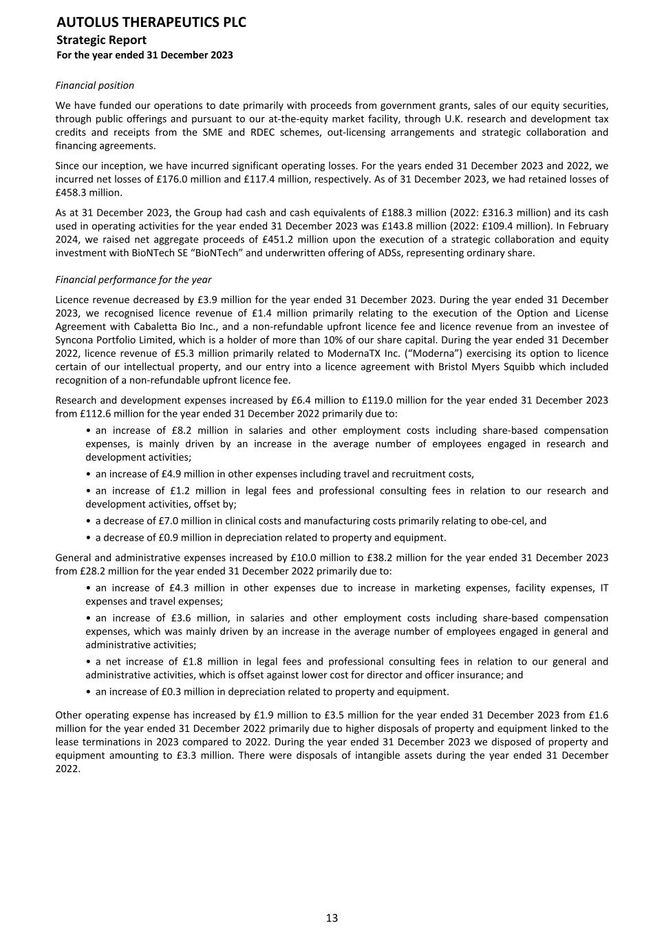 Financial position We have funded our operations to date primarily with proceeds from government grants, sales of our equity securities, through public offerings and pursuant to our at-the-equity market facility, through U.K. research and development tax credits and receipts from the SME and RDEC schemes, out-licensing arrangements and strategic collaboration and financing agreements. Since our inception, we have incurred significant operating losses. For the years ended 31 December 2023 and 2022, we incurred net losses of £176.0 million and £117.4 million, respectively. As of 31 December 2023, we had retained losses of £458.3 million. As at 31 December 2023, the Group had cash and cash equivalents of £188.3 million (2022: £316.3 million) and its cash used in operating activities for the year ended 31 December 2023 was £143.8 million (2022: £109.4 million). In February 2024, we raised net aggregate proceeds of £451.2 million upon the execution of a strategic collaboration and equity investment with BioNTech SE “BioNTech” and underwritten offering of ADSs, representing ordinary share. Financial performance for the year Licence revenue decreased by £3.9 million for the year ended 31 December 2023. During the year ended 31 December 2023, we recognised licence revenue of £1.4 million primarily relating to the execution of the Option and License Agreement with Cabaletta Bio Inc., and a non-refundable upfront licence fee and licence revenue from an investee of Syncona Portfolio Limited, which is a holder of more than 10% of our share capital. During the year ended 31 December 2022, licence revenue of £5.3 million primarily related to ModernaTX Inc. (“Moderna”) exercising its option to licence certain of our intellectual property, and our entry into a licence agreement with Bristol Myers Squibb which included recognition of a non-refundable upfront licence fee. Research and development expenses increased by £6.4 million to £119.0 million for the year ended 31 December 2023 from £112.6 million for the year ended 31 December 2022 primarily due to: • an increase of £8.2 million in salaries and other employment costs including share-based compensation expenses, is mainly driven by an increase in the average number of employees engaged in research and development activities; • an increase of £4.9 million in other expenses including travel and recruitment costs, • an increase of £1.2 million in legal fees and professional consulting fees in relation to our research and development activities, offset by; • a decrease of £7.0 million in clinical costs and manufacturing costs primarily relating to obe-cel, and • a decrease of £0.9 million in depreciation related to property and equipment. General and administrative expenses increased by £10.0 million to £38.2 million for the year ended 31 December 2023 from £28.2 million for the year ended 31 December 2022 primarily due to: • an increase of £4.3 million in other expenses due to increase in marketing expenses, facility expenses, IT expenses and travel expenses; • an increase of £3.6 million, in salaries and other employment costs including share-based compensation expenses, which was mainly driven by an increase in the average number of employees engaged in general and administrative activities; • a net increase of £1.8 million in legal fees and professional consulting fees in relation to our general and administrative activities, which is offset against lower cost for director and officer insurance; and • an increase of £0.3 million in depreciation related to property and equipment. Other operating expense has increased by £1.9 million to £3.5 million for the year ended 31 December 2023 from £1.6 million for the year ended 31 December 2022 primarily due to higher disposals of property and equipment linked to the lease terminations in 2023 compared to 2022. During the year ended 31 December 2023 we disposed of property and equipment amounting to £3.3 million. There were disposals of intangible assets during the year ended 31 December 2022. AUTOLUS THERAPEUTICS PLC Strategic Report For the year ended 31 December 2023 13