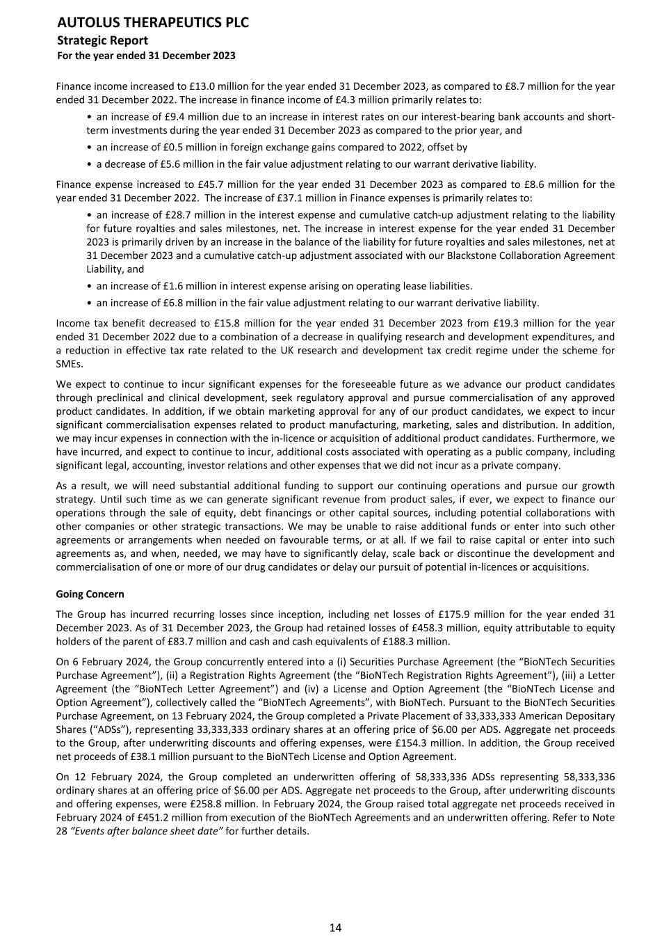 Finance income increased to £13.0 million for the year ended 31 December 2023, as compared to £8.7 million for the year ended 31 December 2022. The increase in finance income of £4.3 million primarily relates to: • an increase of £9.4 million due to an increase in interest rates on our interest-bearing bank accounts and short- term investments during the year ended 31 December 2023 as compared to the prior year, and • an increase of £0.5 million in foreign exchange gains compared to 2022, offset by • a decrease of £5.6 million in the fair value adjustment relating to our warrant derivative liability. Finance expense increased to £45.7 million for the year ended 31 December 2023 as compared to £8.6 million for the year ended 31 December 2022. The increase of £37.1 million in Finance expenses is primarily relates to: • an increase of £28.7 million in the interest expense and cumulative catch-up adjustment relating to the liability for future royalties and sales milestones, net. The increase in interest expense for the year ended 31 December 2023 is primarily driven by an increase in the balance of the liability for future royalties and sales milestones, net at 31 December 2023 and a cumulative catch-up adjustment associated with our Blackstone Collaboration Agreement Liability, and • an increase of £1.6 million in interest expense arising on operating lease liabilities. • an increase of £6.8 million in the fair value adjustment relating to our warrant derivative liability. Income tax benefit decreased to £15.8 million for the year ended 31 December 2023 from £19.3 million for the year ended 31 December 2022 due to a combination of a decrease in qualifying research and development expenditures, and a reduction in effective tax rate related to the UK research and development tax credit regime under the scheme for SMEs. We expect to continue to incur significant expenses for the foreseeable future as we advance our product candidates through preclinical and clinical development, seek regulatory approval and pursue commercialisation of any approved product candidates. In addition, if we obtain marketing approval for any of our product candidates, we expect to incur significant commercialisation expenses related to product manufacturing, marketing, sales and distribution. In addition, we may incur expenses in connection with the in-licence or acquisition of additional product candidates. Furthermore, we have incurred, and expect to continue to incur, additional costs associated with operating as a public company, including significant legal, accounting, investor relations and other expenses that we did not incur as a private company. As a result, we will need substantial additional funding to support our continuing operations and pursue our growth strategy. Until such time as we can generate significant revenue from product sales, if ever, we expect to finance our operations through the sale of equity, debt financings or other capital sources, including potential collaborations with other companies or other strategic transactions. We may be unable to raise additional funds or enter into such other agreements or arrangements when needed on favourable terms, or at all. If we fail to raise capital or enter into such agreements as, and when, needed, we may have to significantly delay, scale back or discontinue the development and commercialisation of one or more of our drug candidates or delay our pursuit of potential in-licences or acquisitions. Going Concern The Group has incurred recurring losses since inception, including net losses of £175.9 million for the year ended 31 December 2023. As of 31 December 2023, the Group had retained losses of £458.3 million, equity attributable to equity holders of the parent of £83.7 million and cash and cash equivalents of £188.3 million. On 6 February 2024, the Group concurrently entered into a (i) Securities Purchase Agreement (the “BioNTech Securities Purchase Agreement”), (ii) a Registration Rights Agreement (the “BioNTech Registration Rights Agreement”), (iii) a Letter Agreement (the “BioNTech Letter Agreement”) and (iv) a License and Option Agreement (the “BioNTech License and Option Agreement”), collectively called the “BioNTech Agreements”, with BioNTech. Pursuant to the BioNTech Securities Purchase Agreement, on 13 February 2024, the Group completed a Private Placement of 33,333,333 American Depositary Shares (“ADSs”), representing 33,333,333 ordinary shares at an offering price of $6.00 per ADS. Aggregate net proceeds to the Group, after underwriting discounts and offering expenses, were £154.3 million. In addition, the Group received net proceeds of £38.1 million pursuant to the BioNTech License and Option Agreement. On 12 February 2024, the Group completed an underwritten offering of 58,333,336 ADSs representing 58,333,336 ordinary shares at an offering price of $6.00 per ADS. Aggregate net proceeds to the Group, after underwriting discounts and offering expenses, were £258.8 million. In February 2024, the Group raised total aggregate net proceeds received in February 2024 of £451.2 million from execution of the BioNTech Agreements and an underwritten offering. Refer to Note 28 “Events after balance sheet date” for further details. AUTOLUS THERAPEUTICS PLC Strategic Report For the year ended 31 December 2023 14