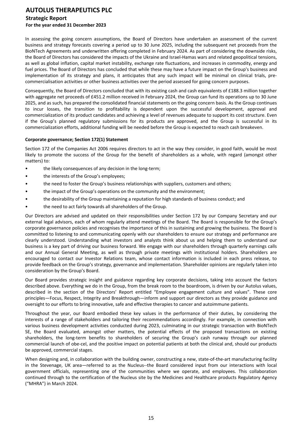 In assessing the going concern assumptions, the Board of Directors have undertaken an assessment of the current business and strategy forecasts covering a period up to 30 June 2025, including the subsequent net proceeds from the BioNTech Agreements and underwritten offering completed in February 2024. As part of considering the downside risks, the Board of Directors has considered the impacts of the Ukraine and Israel-Hamas wars and related geopolitical tensions, as well as global inflation, capital market instability, exchange rate fluctuations, and increases in commodity, energy and fuel prices. The Board of Directors has concluded that while these may have a future impact on the Group's business and implementation of its strategy and plans, it anticipates that any such impact will be minimal on clinical trials, pre- commercialisation activities or other business activities over the period assessed for going concern purposes. Consequently, the Board of Directors concluded that with its existing cash and cash equivalents of £188.3 million together with aggregate net proceeds of £451.2 million received in February 2024, the Group can fund its operations up to 30 June 2025, and as such, has prepared the consolidated financial statements on the going concern basis. As the Group continues to incur losses, the transition to profitability is dependent upon the successful development, approval and commercialization of its product candidates and achieving a level of revenues adequate to support its cost structure. Even if the Group’s planned regulatory submissions for its products are approved, and the Group is successful in its commercialization efforts, additional funding will be needed before the Group is expected to reach cash breakeven. Corporate governance; Section 172(1) Statement Section 172 of the Companies Act 2006 requires directors to act in the way they consider, in good faith, would be most likely to promote the success of the Group for the benefit of shareholders as a whole, with regard (amongst other matters) to: • the likely consequences of any decision in the long-term; • the interests of the Group’s employees; • the need to foster the Group’s business relationships with suppliers, customers and others; • the impact of the Group’s operations on the community and the environment; • the desirability of the Group maintaining a reputation for high standards of business conduct; and • the need to act fairly towards all shareholders of the Group. Our Directors are advised and updated on their responsibilities under Section 172 by our Company Secretary and our external legal advisors, each of whom regularly attend meetings of the Board. The Board is responsible for the Group’s corporate governance policies and recognises the importance of this in sustaining and growing the business. The Board is committed to listening to and communicating openly with our shareholders to ensure our strategy and performance are clearly understood. Understanding what investors and analysts think about us and helping them to understand our business is a key part of driving our business forward. We engage with our shareholders through quarterly earnings calls and our Annual General Meeting, as well as through private meetings with institutional holders. Shareholders are encouraged to contact our Investor Relations team, whose contact information is included in each press release, to provide feedback on the Group’s strategy, governance and implementation. Shareholder opinions are regularly taken into consideration by the Group’s Board. Our Board provides strategic insight and guidance regarding key corporate decisions, taking into account the factors described above. Everything we do in the Group, from the break room to the boardroom, is driven by our Autolus values, described in the section of the Directors’ Report entitled “Employee engagement culture and values”. These core principles—Focus, Respect, Integrity and Breakthrough—inform and support our directors as they provide guidance and oversight to our efforts to bring innovative, safe and effective therapies to cancer and autoimmune patients. Throughout the year, our Board embodied these key values in the performance of their duties, by considering the interests of a range of stakeholders and tailoring their recommendations accordingly. For example, in connection with various business development activities conducted during 2023, culminating in our strategic transaction with BioNTech SE, the Board evaluated, amongst other matters, the potential effects of the proposed transactions on existing shareholders, the long-term benefits to shareholders of securing the Group’s cash runway through our planned commercial launch of obe-cel, and the positive impact on potential patients at both the clinical and, should our products be approved, commercial stages. When designing and, in collaboration with the building owner, constructing a new, state-of-the-art manufacturing facility in the Stevenage, UK area—referred to as the Nucleus--the Board considered input from our interactions with local government officials, representing one of the communities where we operate, and employees. This collaboration continued through to the certification of the Nucleus site by the Medicines and Healthcare products Regulatory Agency (“MHRA”) in March 2024. AUTOLUS THERAPEUTICS PLC Strategic Report For the year ended 31 December 2023 15