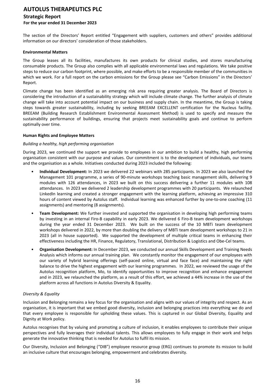 The section of the Directors’ Report entitled “Engagement with suppliers, customers and others” provides additional information on our directors’ consideration of those stakeholders. Environmental Matters The Group leases all its facilities, manufactures its own products for clinical studies, and stores manufacturing consumable products. The Group also complies with all applicable environmental laws and regulations. We take positive steps to reduce our carbon footprint, where possible, and make efforts to be a responsible member of the communities in which we work. For a full report on the carbon emissions for the Group please see “Carbon Emissions” in the Directors’ Report. Climate change has been identified as an emerging risk area requiring greater analysis. The Board of Directors is considering the introduction of a sustainability strategy which will include climate change. The further analysis of climate change will take into account potential impact on our business and supply chain. In the meantime, the Group is taking steps towards greater sustainability, including by seeking BREEAM EXCELLENT certification for the Nucleus facility. BREEAM (Building Research Establishment Environmental Assessment Method) is used to specify and measure the sustainability performance of buildings, ensuring that projects meet sustainability goals and continue to perform optimally over time. Human Rights and Employee Matters Building a healthy, high performing organisation During 2023, we continued the support we provide to employees in our ambition to build a healthy, high performing organisation consistent with our purpose and values. Our commitment is to the development of individuals, our teams and the organisation as a whole. Initiatives conducted during 2023 included the following: • Individual Development: In 2023 we delivered 22 webinars with 285 participants. In 2023 we also launched the Management 101 programme, a series of 90-minute workshops teaching basic management skills, delivering 9 modules with 126 attendances, in 2023 we built on this success delivering a further 11 modules with 108 attendances. In 2023 we delivered 2 leadership development programmes with 20 participants. We relaunched LinkedIn learning and created a stronger engagement with the learning platform, achieving an impressive 310 hours of content viewed by Autolus staff. Individual learning was enhanced further by one-to-one coaching (11 assignments) and mentoring (8 assignments). • Team Development: We further invested and supported the organisation in developing high performing teams by investing in an internal Firo-B capability in early 2023. We delivered 6 Firo-B team development workshops during the year ended 31 December 2023. We built on the success of the 10 MBTi team development workshops delivered in 2022, by more than doubling the delivery of MBTi team development workshops to 21 in 2023 (all in house supported). We supported the development of multiple critical teams in enhancing their effectiveness including the HR, Finance, Regulatory, Translational, Distribution & Logistics and Obe-Cel teams. • Organisation Development: In December 2023, we conducted our annual Skills Development and Training Needs Analysis which informs our annual training plan. We constantly monitor the engagement of our employees with our variety of hybrid learning offerings (self-paced online, virtual and face face) and maintaining the right balance to drive the highest engagement with our learning programmes. In 2022, we reviewed the usage of the Autolus recognition platform, Mo, to identify opportunities to improve recognition and enhance engagement and in 2023, we relaunched the platform, as a result of this effort, we achieved a 44% increase in the use of the platform across all functions in Autolus Diversity & Equality. Diversity & Equality Inclusion and Belonging remains a key focus for the organisation and aligns with our values of integrity and respect. As an organisation, it is important that we embed good diversity, inclusion and belonging practices into everything we do and that every employee is responsible for upholding these values. This is captured in our Global Diversity, Equality and Dignity at Work policy. Autolus recognises that by valuing and promoting a culture of inclusion, it enables employees to contribute their unique perspectives and fully leverages their individual talents. This allows employees to fully engage in their work and helps generate the innovative thinking that is needed for Autolus to fulfil its mission. Our Diversity, Inclusion and Belonging (“DIB”) employee resource group (ERG) continues to promote its mission to build an inclusive culture that encourages belonging, empowerment and celebrates diversity. AUTOLUS THERAPEUTICS PLC Strategic Report For the year ended 31 December 2023 16