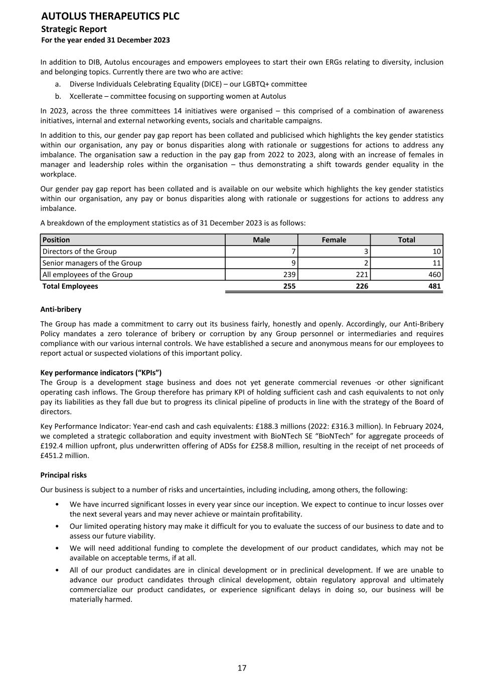 In addition to DIB, Autolus encourages and empowers employees to start their own ERGs relating to diversity, inclusion and belonging topics. Currently there are two who are active: a. Diverse Individuals Celebrating Equality (DICE) – our LGBTQ+ committee b. Xcellerate – committee focusing on supporting women at Autolus In 2023, across the three committees 14 initiatives were organised – this comprised of a combination of awareness initiatives, internal and external networking events, socials and charitable campaigns. In addition to this, our gender pay gap report has been collated and publicised which highlights the key gender statistics within our organisation, any pay or bonus disparities along with rationale or suggestions for actions to address any imbalance. The organisation saw a reduction in the pay gap from 2022 to 2023, along with an increase of females in manager and leadership roles within the organisation – thus demonstrating a shift towards gender equality in the workplace. Our gender pay gap report has been collated and is available on our website which highlights the key gender statistics within our organisation, any pay or bonus disparities along with rationale or suggestions for actions to address any imbalance. A breakdown of the employment statistics as of 31 December 2023 is as follows: Position Male Female Total Directors of the Group 7 3 10 Senior managers of the Group 9 2 11 All employees of the Group 239 221 460 Total Employees 255 226 481 Anti-bribery The Group has made a commitment to carry out its business fairly, honestly and openly. Accordingly, our Anti-Bribery Policy mandates a zero tolerance of bribery or corruption by any Group personnel or intermediaries and requires compliance with our various internal controls. We have established a secure and anonymous means for our employees to report actual or suspected violations of this important policy. Key performance indicators (“KPIs”) The Group is a development stage business and does not yet generate commercial revenues ·or other significant operating cash inflows. The Group therefore has primary KPI of holding sufficient cash and cash equivalents to not only pay its liabilities as they fall due but to progress its clinical pipeline of products in line with the strategy of the Board of directors. Key Performance Indicator: Year-end cash and cash equivalents: £188.3 millions (2022: £316.3 million). In February 2024, we completed a strategic collaboration and equity investment with BioNTech SE “BioNTech” for aggregate proceeds of £192.4 million upfront, plus underwritten offering of ADSs for £258.8 million, resulting in the receipt of net proceeds of £451.2 million. Principal risks Our business is subject to a number of risks and uncertainties, including including, among others, the following: • We have incurred significant losses in every year since our inception. We expect to continue to incur losses over the next several years and may never achieve or maintain profitability. • Our limited operating history may make it difficult for you to evaluate the success of our business to date and to assess our future viability. • We will need additional funding to complete the development of our product candidates, which may not be available on acceptable terms, if at all. • All of our product candidates are in clinical development or in preclinical development. If we are unable to advance our product candidates through clinical development, obtain regulatory approval and ultimately commercialize our product candidates, or experience significant delays in doing so, our business will be materially harmed. AUTOLUS THERAPEUTICS PLC Strategic Report For the year ended 31 December 2023 17