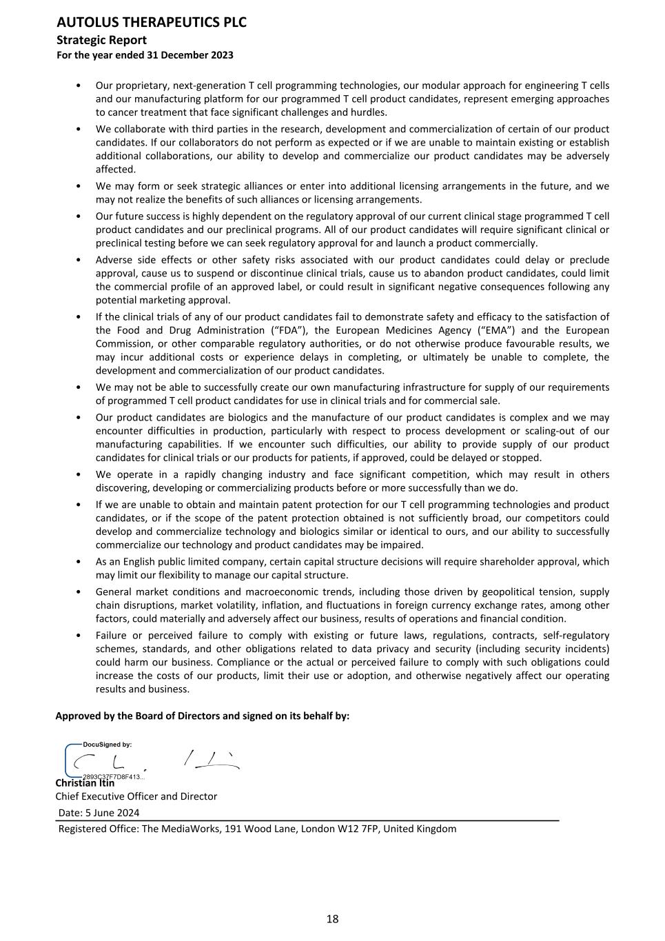 • Our proprietary, next-generation T cell programming technologies, our modular approach for engineering T cells and our manufacturing platform for our programmed T cell product candidates, represent emerging approaches to cancer treatment that face significant challenges and hurdles. • We collaborate with third parties in the research, development and commercialization of certain of our product candidates. If our collaborators do not perform as expected or if we are unable to maintain existing or establish additional collaborations, our ability to develop and commercialize our product candidates may be adversely affected. • We may form or seek strategic alliances or enter into additional licensing arrangements in the future, and we may not realize the benefits of such alliances or licensing arrangements. • Our future success is highly dependent on the regulatory approval of our current clinical stage programmed T cell product candidates and our preclinical programs. All of our product candidates will require significant clinical or preclinical testing before we can seek regulatory approval for and launch a product commercially. • Adverse side effects or other safety risks associated with our product candidates could delay or preclude approval, cause us to suspend or discontinue clinical trials, cause us to abandon product candidates, could limit the commercial profile of an approved label, or could result in significant negative consequences following any potential marketing approval. • If the clinical trials of any of our product candidates fail to demonstrate safety and efficacy to the satisfaction of the Food and Drug Administration (“FDA”), the European Medicines Agency (“EMA”) and the European Commission, or other comparable regulatory authorities, or do not otherwise produce favourable results, we may incur additional costs or experience delays in completing, or ultimately be unable to complete, the development and commercialization of our product candidates. • We may not be able to successfully create our own manufacturing infrastructure for supply of our requirements of programmed T cell product candidates for use in clinical trials and for commercial sale. • Our product candidates are biologics and the manufacture of our product candidates is complex and we may encounter difficulties in production, particularly with respect to process development or scaling-out of our manufacturing capabilities. If we encounter such difficulties, our ability to provide supply of our product candidates for clinical trials or our products for patients, if approved, could be delayed or stopped. • We operate in a rapidly changing industry and face significant competition, which may result in others discovering, developing or commercializing products before or more successfully than we do. • If we are unable to obtain and maintain patent protection for our T cell programming technologies and product candidates, or if the scope of the patent protection obtained is not sufficiently broad, our competitors could develop and commercialize technology and biologics similar or identical to ours, and our ability to successfully commercialize our technology and product candidates may be impaired. • As an English public limited company, certain capital structure decisions will require shareholder approval, which may limit our flexibility to manage our capital structure. • General market conditions and macroeconomic trends, including those driven by geopolitical tension, supply chain disruptions, market volatility, inflation, and fluctuations in foreign currency exchange rates, among other factors, could materially and adversely affect our business, results of operations and financial condition. • Failure or perceived failure to comply with existing or future laws, regulations, contracts, self-regulatory schemes, standards, and other obligations related to data privacy and security (including security incidents) could harm our business. Compliance or the actual or perceived failure to comply with such obligations could increase the costs of our products, limit their use or adoption, and otherwise negatively affect our operating results and business. Approved by the Board of Directors and signed on its behalf by: Christian Itin Chief Executive Officer and Director Date: 5 June 2024 Registered Office: The MediaWorks, 191 Wood Lane, London W12 7FP, United Kingdom AUTOLUS THERAPEUTICS PLC Strategic Report For the year ended 31 December 2023 18