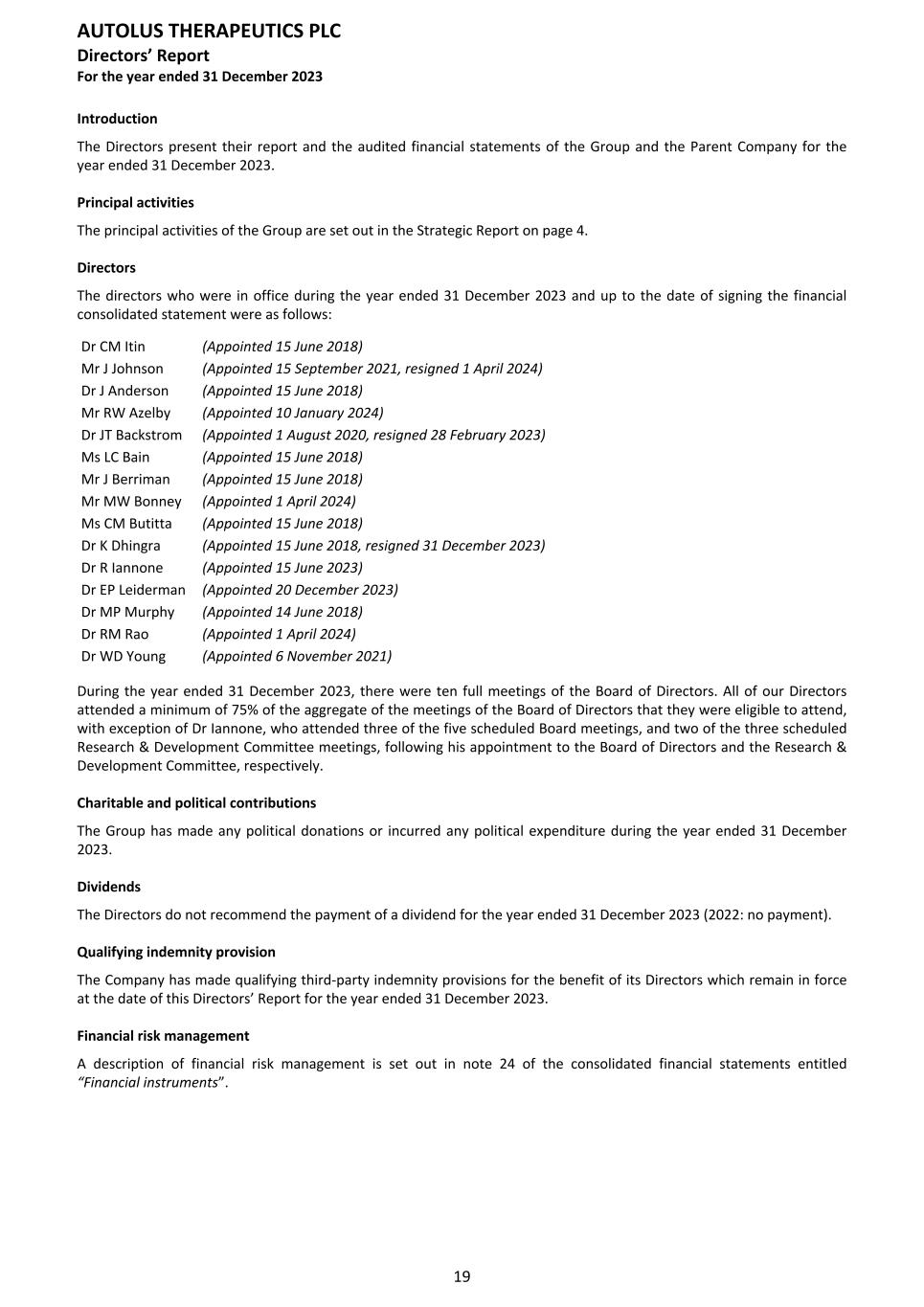 Introduction The Directors present their report and the audited financial statements of the Group and the Parent Company for the year ended 31 December 2023. Principal activities The principal activities of the Group are set out in the Strategic Report on page 4. Directors The directors who were in office during the year ended 31 December 2023 and up to the date of signing the financial consolidated statement were as follows: Dr CM Itin (Appointed 15 June 2018) Mr J Johnson (Appointed 15 September 2021, resigned 1 April 2024) Dr J Anderson (Appointed 15 June 2018) Mr RW Azelby (Appointed 10 January 2024) Dr JT Backstrom (Appointed 1 August 2020, resigned 28 February 2023) Ms LC Bain (Appointed 15 June 2018) Mr J Berriman (Appointed 15 June 2018) Mr MW Bonney (Appointed 1 April 2024) Ms CM Butitta (Appointed 15 June 2018) Dr K Dhingra (Appointed 15 June 2018, resigned 31 December 2023) Dr R Iannone (Appointed 15 June 2023) Dr EP Leiderman (Appointed 20 December 2023) Dr MP Murphy (Appointed 14 June 2018) Dr RM Rao (Appointed 1 April 2024) Dr WD Young (Appointed 6 November 2021) During the year ended 31 December 2023, there were ten full meetings of the Board of Directors. All of our Directors attended a minimum of 75% of the aggregate of the meetings of the Board of Directors that they were eligible to attend, with exception of Dr Iannone, who attended three of the five scheduled Board meetings, and two of the three scheduled Research & Development Committee meetings, following his appointment to the Board of Directors and the Research & Development Committee, respectively. Charitable and political contributions The Group has made any political donations or incurred any political expenditure during the year ended 31 December 2023. Dividends The Directors do not recommend the payment of a dividend for the year ended 31 December 2023 (2022: no payment). Qualifying indemnity provision The Company has made qualifying third-party indemnity provisions for the benefit of its Directors which remain in force at the date of this Directors’ Report for the year ended 31 December 2023. Financial risk management A description of financial risk management is set out in note 24 of the consolidated financial statements entitled “Financial instruments”. AUTOLUS THERAPEUTICS PLC Directors’ Report For the year ended 31 December 2023 19