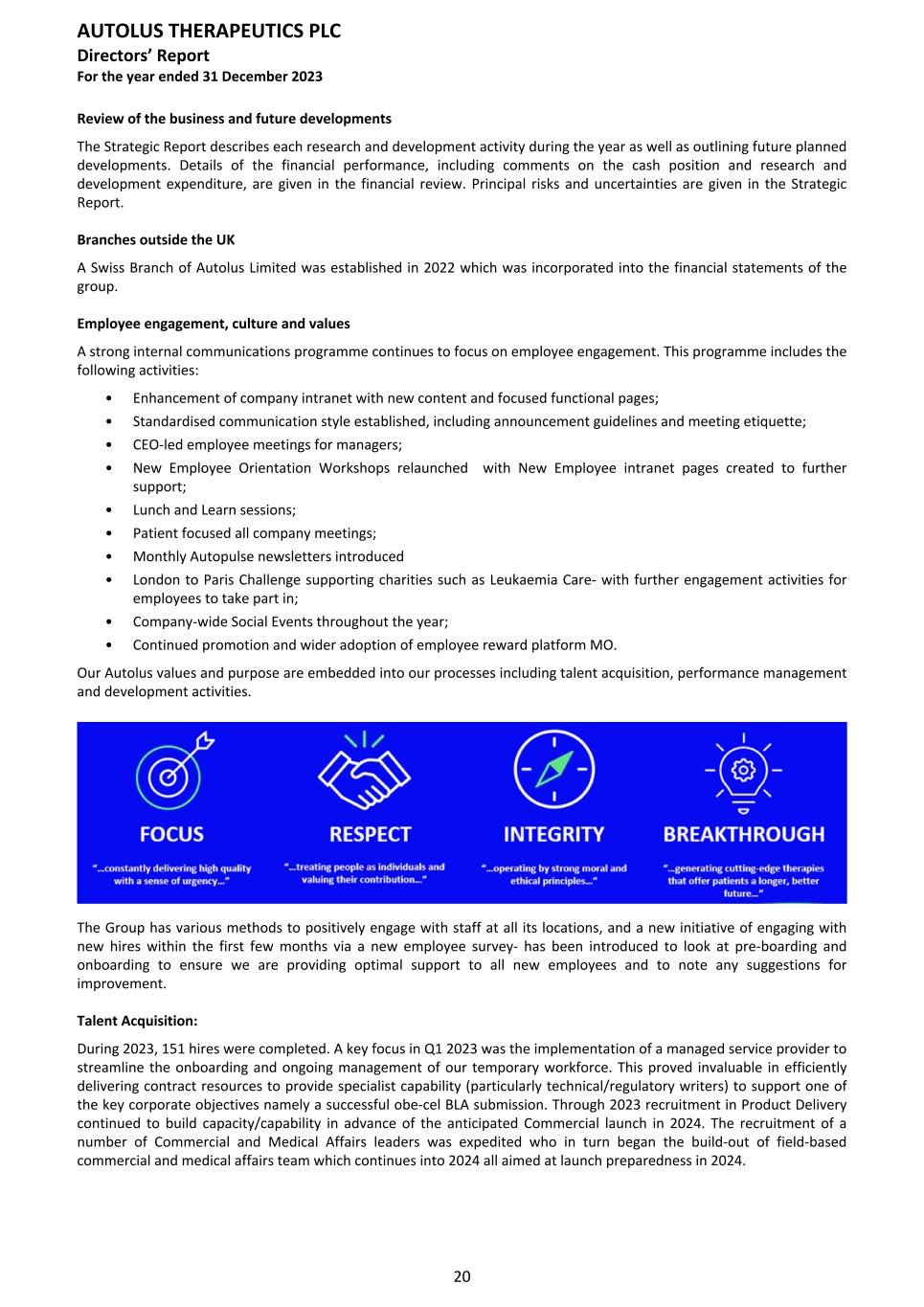 Review of the business and future developments The Strategic Report describes each research and development activity during the year as well as outlining future planned developments. Details of the financial performance, including comments on the cash position and research and development expenditure, are given in the financial review. Principal risks and uncertainties are given in the Strategic Report. Branches outside the UK A Swiss Branch of Autolus Limited was established in 2022 which was incorporated into the financial statements of the group. Employee engagement, culture and values A strong internal communications programme continues to focus on employee engagement. This programme includes the following activities: • Enhancement of company intranet with new content and focused functional pages; • Standardised communication style established, including announcement guidelines and meeting etiquette; • CEO-led employee meetings for managers; • New Employee Orientation Workshops relaunched with New Employee intranet pages created to further support; • Lunch and Learn sessions; • Patient focused all company meetings; • Monthly Autopulse newsletters introduced • London to Paris Challenge supporting charities such as Leukaemia Care- with further engagement activities for employees to take part in; • Company-wide Social Events throughout the year; • Continued promotion and wider adoption of employee reward platform MO. Our Autolus values and purpose are embedded into our processes including talent acquisition, performance management and development activities. The Group has various methods to positively engage with staff at all its locations, and a new initiative of engaging with new hires within the first few months via a new employee survey- has been introduced to look at pre-boarding and onboarding to ensure we are providing optimal support to all new employees and to note any suggestions for improvement. Talent Acquisition: During 2023, 151 hires were completed. A key focus in Q1 2023 was the implementation of a managed service provider to streamline the onboarding and ongoing management of our temporary workforce. This proved invaluable in efficiently delivering contract resources to provide specialist capability (particularly technical/regulatory writers) to support one of the key corporate objectives namely a successful obe-cel BLA submission. Through 2023 recruitment in Product Delivery continued to build capacity/capability in advance of the anticipated Commercial launch in 2024. The recruitment of a number of Commercial and Medical Affairs leaders was expedited who in turn began the build-out of field-based commercial and medical affairs team which continues into 2024 all aimed at launch preparedness in 2024. AUTOLUS THERAPEUTICS PLC Directors’ Report For the year ended 31 December 2023 20