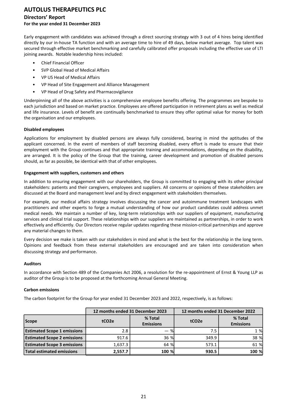 Early engagement with candidates was achieved through a direct sourcing strategy with 3 out of 4 hires being identified directly by our in-house TA function and with an average time to hire of 49 days, below market average. Top talent was secured through effective market benchmarking and carefully calibrated offer proposals including the effective use of LTI joining awards. Notable leadership hires included: • Chief Financial Officer • SVP Global Head of Medical Affairs • VP US Head of Medical Affairs • VP Head of Site Engagement and Alliance Management • VP Head of Drug Safety and Pharmacovigilance Underpinning all of the above activities is a comprehensive employee benefits offering. The programmes are bespoke to each jurisdiction and based on market practice. Employees are offered participation in retirement plans as well as medical and life insurance. Levels of benefit are continually benchmarked to ensure they offer optimal value for money for both the organisation and our employees. Disabled employees Applications for employment by disabled persons are always fully considered, bearing in mind the aptitudes of the applicant concerned. In the event of members of staff becoming disabled, every effort is made to ensure that their employment with the Group continues and that appropriate training and accommodations, depending on the disability, are arranged. It is the policy of the Group that the training, career development and promotion of disabled persons should, as far as possible, be identical with that of other employees. Engagement with suppliers, customers and others In addition to ensuring engagement with our shareholders, the Group is committed to engaging with its other principal stakeholders: patients and their caregivers, employees and suppliers. All concerns or opinions of these stakeholders are discussed at the Board and management level and by direct engagement with stakeholders themselves. For example, our medical affairs strategy involves discussing the cancer and autoimmune treatment landscapes with practitioners and other experts to forge a mutual understanding of how our product candidates could address unmet medical needs. We maintain a number of key, long-term relationships with our suppliers of equipment, manufacturing services and clinical trial support. These relationships with our suppliers are maintained as partnerships, in order to work effectively and efficiently. Our Directors receive regular updates regarding these mission-critical partnerships and approve any material changes to them. Every decision we make is taken with our stakeholders in mind and what is the best for the relationship in the long term. Opinions and feedback from these external stakeholders are encouraged and are taken into consideration when discussing strategy and performance. Auditors In accordance with Section 489 of the Companies Act 2006, a resolution for the re-appointment of Ernst & Young LLP as auditor of the Group is to be proposed at the forthcoming Annual General Meeting. Carbon emissions The carbon footprint for the Group for year ended 31 December 2023 and 2022, respectively, is as follows: 12 months ended 31 December 2023 12 months ended 31 December 2022 Scope tCO2e % Total Emissions tCO2e % Total Emissions Estimated Scope 1 emissions 2.8 — % 7.5 1 % Estimated Scope 2 emissions 917.6 36 % 349.9 38 % Estimated Scope 3 emissions 1,637.3 64 % 573.1 61 % Total estimated emissions 2,557.7 100 % 930.5 100 % AUTOLUS THERAPEUTICS PLC Directors’ Report For the year ended 31 December 2023 21