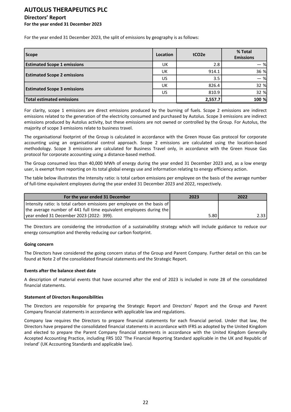 For the year ended 31 December 2023, the split of emissions by geography is as follows: Scope Location tCO2e % Total Emissions Estimated Scope 1 emissions UK 2.8 — % Estimated Scope 2 emissions UK 914.1 36 % US 3.5 — % Estimated Scope 3 emissions UK 826.4 32 % US 810.9 32 % Total estimated emissions 2,557.7 100 % For clarity, scope 1 emissions are direct emissions produced by the burning of fuels. Scope 2 emissions are indirect emissions related to the generation of the electricity consumed and purchased by Autolus. Scope 3 emissions are indirect emissions produced by Autolus activity, but these emissions are not owned or controlled by the Group. For Autolus, the majority of scope 3 emissions relate to business travel. The organisational footprint of the Group is calculated in accordance with the Green House Gas protocol for corporate accounting using an organisational control approach. Scope 2 emissions are calculated using the location-based methodology. Scope 3 emissions are calculated for Business Travel only, in accordance with the Green House Gas protocol for corporate accounting using a distance-based method. The Group consumed less than 40,000 MWh of energy during the year ended 31 December 2023 and, as a low energy user, is exempt from reporting on its total global energy use and information relating to energy efficiency action. The table below illustrates the Intensity ratio: is total carbon emissions per employee on the basis of the average number of full-time equivalent employees during the year ended 31 December 2023 and 2022, respectively. For the year ended 31 December 2023 2022 Intensity ratio: is total carbon emissions per employee on the basis of the average number of 441 full time equivalent employees during the year ended 31 December 2023 (2022: 399). 5.80 2.33 The Directors are considering the introduction of a sustainability strategy which will include guidance to reduce our energy consumption and thereby reducing our carbon footprint. Going concern The Directors have considered the going concern status of the Group and Parent Company. Further detail on this can be found at Note 2 of the consolidated financial statements and the Strategic Report. Events after the balance sheet date A description of material events that have occurred after the end of 2023 is included in note 28 of the consolidated financial statements. Statement of Directors Responsibilities The Directors are responsible for preparing the Strategic Report and Directors’ Report and the Group and Parent Company financial statements in accordance with applicable law and regulations. Company law requires the Directors to prepare financial statements for each financial period. Under that law, the Directors have prepared the consolidated financial statements in accordance with IFRS as adopted by the United Kingdom and elected to prepare the Parent Company financial statements in accordance with the United Kingdom Generally Accepted Accounting Practice, including FRS 102 ‘The Financial Reporting Standard applicable in the UK and Republic of Ireland’ (UK Accounting Standards and applicable law). AUTOLUS THERAPEUTICS PLC Directors’ Report For the year ended 31 December 2023 22