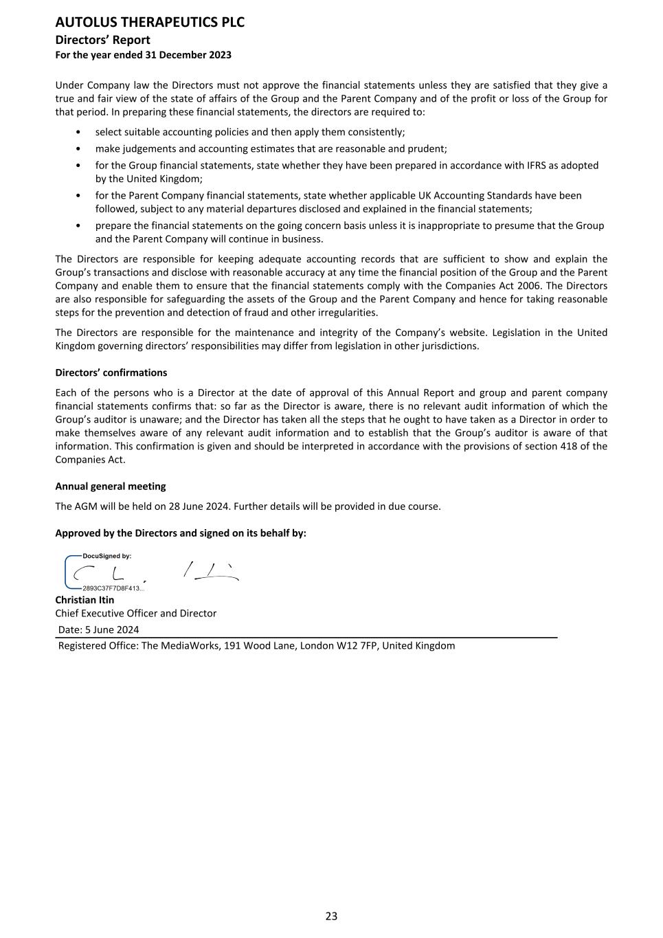 Under Company law the Directors must not approve the financial statements unless they are satisfied that they give a true and fair view of the state of affairs of the Group and the Parent Company and of the profit or loss of the Group for that period. In preparing these financial statements, the directors are required to: • select suitable accounting policies and then apply them consistently; • make judgements and accounting estimates that are reasonable and prudent; • for the Group financial statements, state whether they have been prepared in accordance with IFRS as adopted by the United Kingdom; • for the Parent Company financial statements, state whether applicable UK Accounting Standards have been followed, subject to any material departures disclosed and explained in the financial statements; • prepare the financial statements on the going concern basis unless it is inappropriate to presume that the Group and the Parent Company will continue in business. The Directors are responsible for keeping adequate accounting records that are sufficient to show and explain the Group’s transactions and disclose with reasonable accuracy at any time the financial position of the Group and the Parent Company and enable them to ensure that the financial statements comply with the Companies Act 2006. The Directors are also responsible for safeguarding the assets of the Group and the Parent Company and hence for taking reasonable steps for the prevention and detection of fraud and other irregularities. The Directors are responsible for the maintenance and integrity of the Company’s website. Legislation in the United Kingdom governing directors’ responsibilities may differ from legislation in other jurisdictions. Directors’ confirmations Each of the persons who is a Director at the date of approval of this Annual Report and group and parent company financial statements confirms that: so far as the Director is aware, there is no relevant audit information of which the Group’s auditor is unaware; and the Director has taken all the steps that he ought to have taken as a Director in order to make themselves aware of any relevant audit information and to establish that the Group’s auditor is aware of that information. This confirmation is given and should be interpreted in accordance with the provisions of section 418 of the Companies Act. Annual general meeting The AGM will be held on 28 June 2024. Further details will be provided in due course. Approved by the Directors and signed on its behalf by: Christian Itin Chief Executive Officer and Director Date: 5 June 2024 Registered Office: The MediaWorks, 191 Wood Lane, London W12 7FP, United Kingdom AUTOLUS THERAPEUTICS PLC Directors’ Report For the year ended 31 December 2023 23