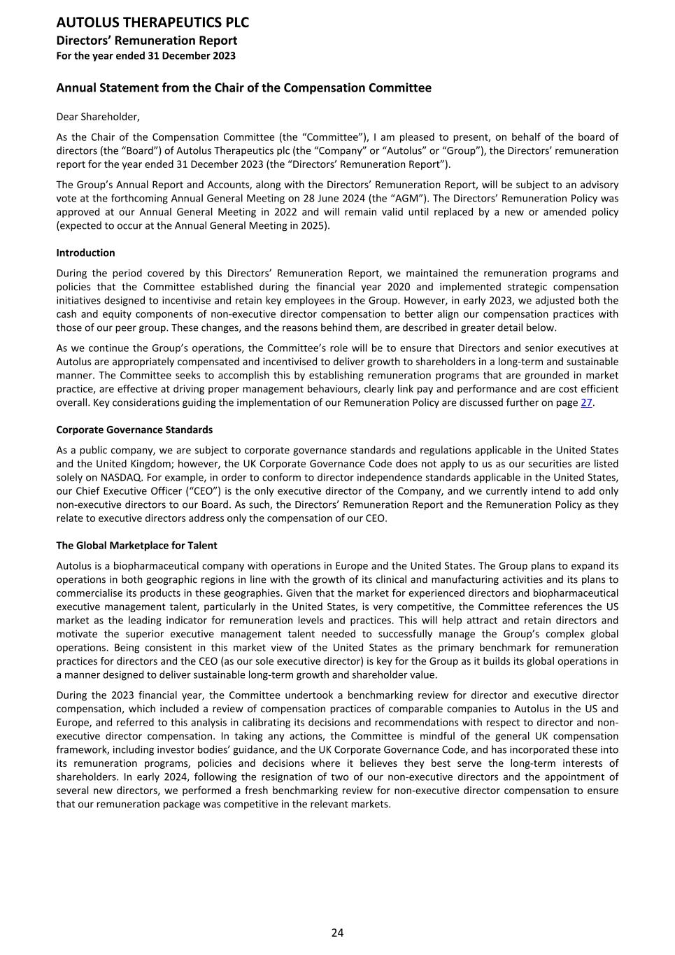 Annual Statement from the Chair of the Compensation Committee Dear Shareholder, As the Chair of the Compensation Committee (the “Committee”), I am pleased to present, on behalf of the board of directors (the “Board”) of Autolus Therapeutics plc (the “Company” or “Autolus” or “Group”), the Directors’ remuneration report for the year ended 31 December 2023 (the “Directors’ Remuneration Report”). The Group’s Annual Report and Accounts, along with the Directors’ Remuneration Report, will be subject to an advisory vote at the forthcoming Annual General Meeting on 28 June 2024 (the “AGM”). The Directors’ Remuneration Policy was approved at our Annual General Meeting in 2022 and will remain valid until replaced by a new or amended policy (expected to occur at the Annual General Meeting in 2025). Introduction During the period covered by this Directors’ Remuneration Report, we maintained the remuneration programs and policies that the Committee established during the financial year 2020 and implemented strategic compensation initiatives designed to incentivise and retain key employees in the Group. However, in early 2023, we adjusted both the cash and equity components of non-executive director compensation to better align our compensation practices with those of our peer group. These changes, and the reasons behind them, are described in greater detail below. As we continue the Group’s operations, the Committee’s role will be to ensure that Directors and senior executives at Autolus are appropriately compensated and incentivised to deliver growth to shareholders in a long-term and sustainable manner. The Committee seeks to accomplish this by establishing remuneration programs that are grounded in market practice, are effective at driving proper management behaviours, clearly link pay and performance and are cost efficient overall. Key considerations guiding the implementation of our Remuneration Policy are discussed further on page 27. Corporate Governance Standards As a public company, we are subject to corporate governance standards and regulations applicable in the United States and the United Kingdom; however, the UK Corporate Governance Code does not apply to us as our securities are listed solely on NASDAQ. For example, in order to conform to director independence standards applicable in the United States, our Chief Executive Officer (“CEO”) is the only executive director of the Company, and we currently intend to add only non-executive directors to our Board. As such, the Directors’ Remuneration Report and the Remuneration Policy as they relate to executive directors address only the compensation of our CEO. The Global Marketplace for Talent Autolus is a biopharmaceutical company with operations in Europe and the United States. The Group plans to expand its operations in both geographic regions in line with the growth of its clinical and manufacturing activities and its plans to commercialise its products in these geographies. Given that the market for experienced directors and biopharmaceutical executive management talent, particularly in the United States, is very competitive, the Committee references the US market as the leading indicator for remuneration levels and practices. This will help attract and retain directors and motivate the superior executive management talent needed to successfully manage the Group’s complex global operations. Being consistent in this market view of the United States as the primary benchmark for remuneration practices for directors and the CEO (as our sole executive director) is key for the Group as it builds its global operations in a manner designed to deliver sustainable long-term growth and shareholder value. During the 2023 financial year, the Committee undertook a benchmarking review for director and executive director compensation, which included a review of compensation practices of comparable companies to Autolus in the US and Europe, and referred to this analysis in calibrating its decisions and recommendations with respect to director and non- executive director compensation. In taking any actions, the Committee is mindful of the general UK compensation framework, including investor bodies’ guidance, and the UK Corporate Governance Code, and has incorporated these into its remuneration programs, policies and decisions where it believes they best serve the long-term interests of shareholders. In early 2024, following the resignation of two of our non-executive directors and the appointment of several new directors, we performed a fresh benchmarking review for non-executive director compensation to ensure that our remuneration package was competitive in the relevant markets. AUTOLUS THERAPEUTICS PLC Directors’ Remuneration Report For the year ended 31 December 2023 24