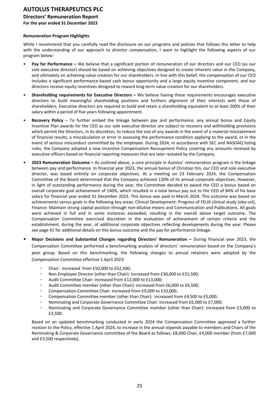 Remuneration Program Highlights While I recommend that you carefully read the disclosure on our programs and policies that follows this letter to help with the understanding of our approach to director compensation, I want to highlight the following aspects of our program below: • Pay for Performance – We believe that a significant portion of remuneration of our directors and our CEO (as our sole executive director) should be based on achieving objectives designed to create inherent value in the Company, and ultimately on achieving value creation for our shareholders. In line with this belief, the compensation of our CEO includes a significant performance-based cash bonus opportunity and a large equity incentive component, and our directors receive equity incentives designed to reward long-term value creation for our shareholders. • Shareholding requirements for Executive Directors – We believe having these requirements encourages executive directors to build meaningful shareholding positions and furthers alignment of their interests with those of shareholders. Executive directors are required to build and retain a shareholding equivalent to at least 200% of their salary within a period of five years following appointment. • Recovery Policy – To further embed the linkage between pay and performance, any annual bonus and Equity Incentive Plan awards for the CEO as our sole executive director are subject to recovery and withholding provisions which permit the Directors, in its discretion, to reduce the size of any awards in the event of a material misstatement of financial results, a miscalculation or error in assessing the performance condition applying to the award, or in the event of serious misconduct committed by the employee. During 2024, in accordance with SEC and NASDAQ listing rules, the Company adopted a new Incentive Compensation Recoupment Policy covering any amounts received by executive officers based on financial reporting measures that are later restated by the Company. • 2023 Remuneration Outcome – As outlined above, a core principle in Autolus’ remuneration program is the linkage between pay and performance. In financial year 2023, the annual bonus of Christian Itin, our CEO and sole executive director, was based entirely on corporate objectives. At a meeting on 23 February 2024, the Compensation Committee of the Board determined that the Company achieved 120% of its annual corporate objectives. However, in light of outstanding performance during the year, the Committee decided to award the CEO a bonus based on overall corporate goal achievement of 140%, which resulted in a total bonus pay out to the CEO of 84% of his base salary for financial year ended 31 December 2023. This bonus was paid in March 2024. This outcome was based on achievements versus goals in the following key areas: Clinical Development: Progress of FELIX clinical study (obe-cel), Finance: Maintain strong capital position through non-dilutive means and Communication and Publications. All goals were achieved in full and in some instances exceeded, resulting in the overall above target outcome. The Compensation Committee exercised discretion in the evaluation of achievement of certain criteria and the establishment, during the year, of additional corporate objectives reflecting developments during the year. Please see page 41 for additional details on this bonus outcome and the pay for performance linkage. • Major Decisions and Substantial Changes regarding Directors’ Remuneration – During financial year 2023, the Compensation Committee performed a benchmarking analysis of directors’ remuneration based on the Company’s peer group. Based on this benchmarking, the following changes to annual retainers were adopted by the Compensation Committee effective 1 April 2023: ◦ Chair: increased from £50,000 to £52,500; ◦ Non-Employee Director (other than Chair): increased from £30,000 to £31,500; ◦ Audit Committee Chair: increased from £12,000 to £13,000; ◦ Audit Committee member (other than Chair): increased from £6,000 to £6,500; ◦ Compensation Committee Chair: increased from £9,000 to £10,000; ◦ Compensation Committee member (other than Chair): increased from £4,500 to £5,000; ◦ Nominating and Corporate Governance Committee Chair: increased from £6,000 to £7,000; ◦ Nominating and Corporate Governance Committee member (other than Chair): increased from £3,000 to £3,500. Based on an updated benchmarking conducted in early 2024 the Compensation Committee approved a further revision to the Policy, effective 1 April 2024, to increase in the annual stipends payable to members and Chairs of the Nominating & Corporate Governance committee of the Board as follows: £8,000 Chair, £4,000 member (from £7,000 and £3,500 respectively). AUTOLUS THERAPEUTICS PLC Directors’ Remuneration Report For the year ended 31 December 2023 25