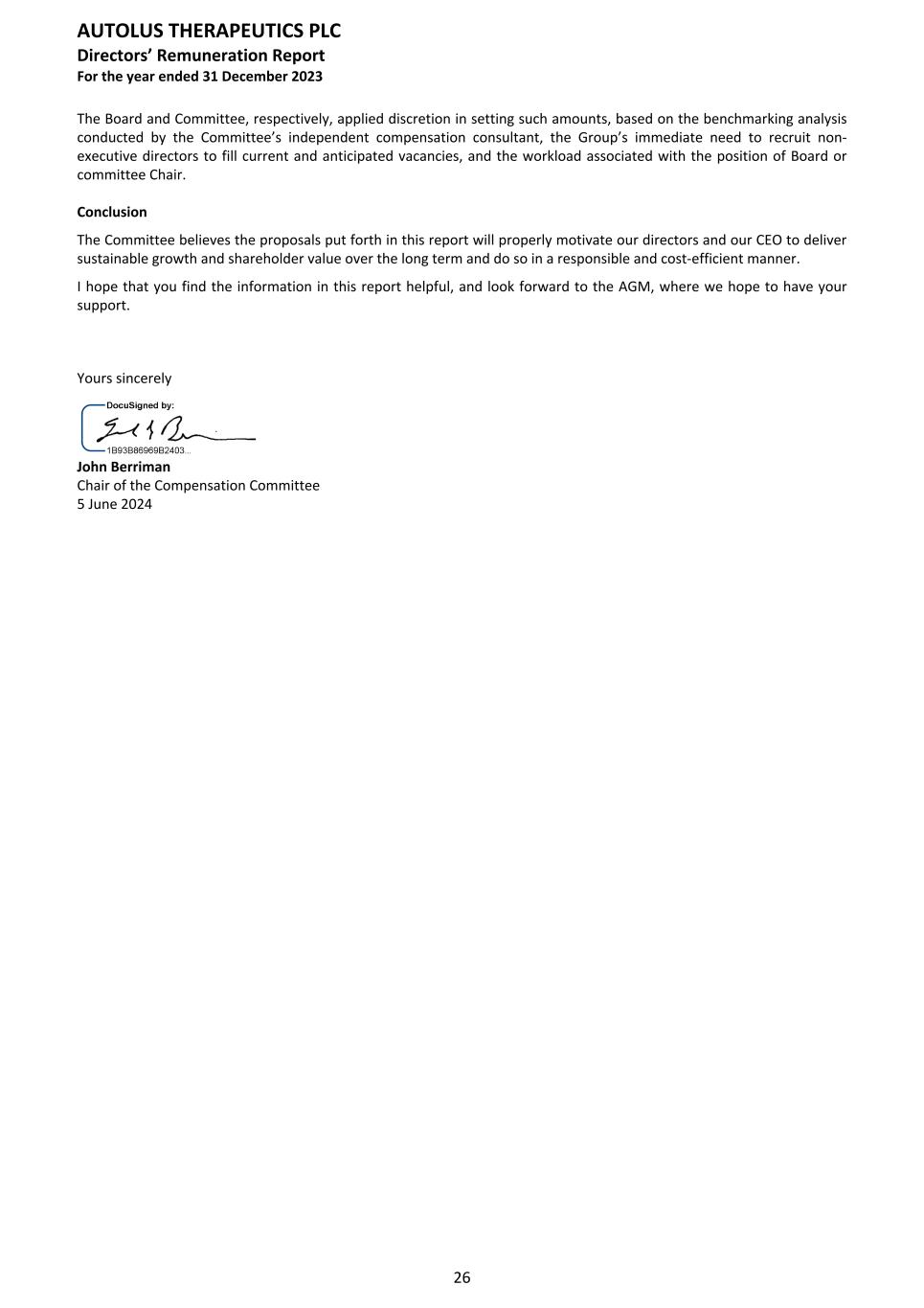 The Board and Committee, respectively, applied discretion in setting such amounts, based on the benchmarking analysis conducted by the Committee’s independent compensation consultant, the Group’s immediate need to recruit non- executive directors to fill current and anticipated vacancies, and the workload associated with the position of Board or committee Chair. Conclusion The Committee believes the proposals put forth in this report will properly motivate our directors and our CEO to deliver sustainable growth and shareholder value over the long term and do so in a responsible and cost-efficient manner. I hope that you find the information in this report helpful, and look forward to the AGM, where we hope to have your support. Yours sincerely John Berriman Chair of the Compensation Committee 5 June 2024 AUTOLUS THERAPEUTICS PLC Directors’ Remuneration Report For the year ended 31 December 2023 26