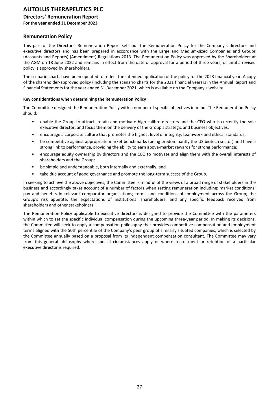 Remuneration Policy This part of the Directors’ Remuneration Report sets out the Remuneration Policy for the Company’s directors and executive directors and has been prepared in accordance with the Large and Medium-sized Companies and Groups (Accounts and Reports) (Amendment) Regulations 2013. The Remuneration Policy was approved by the Shareholders at the AGM on 18 June 2022 and remains in effect from the date of approval for a period of three years, or until a revised policy is approved by shareholders. The scenario charts have been updated to reflect the intended application of the policy for the 2023 financial year. A copy of the shareholder-approved policy (including the scenario charts for the 2021 financial year) is in the Annual Report and Financial Statements for the year ended 31 December 2021, which is available on the Company’s website. Key considerations when determining the Remuneration Policy The Committee designed the Remuneration Policy with a number of specific objectives in mind. The Remuneration Policy should: • enable the Group to attract, retain and motivate high calibre directors and the CEO who is currently the sole executive director, and focus them on the delivery of the Group's strategic and business objectives; • encourage a corporate culture that promotes the highest level of integrity, teamwork and ethical standards; • be competitive against appropriate market benchmarks (being predominantly the US biotech sector) and have a strong link to performance, providing the ability to earn above-market rewards for strong performance; • encourage equity ownership by directors and the CEO to motivate and align them with the overall interests of shareholders and the Group; • be simple and understandable, both internally and externally; and • take due account of good governance and promote the long-term success of the Group. In seeking to achieve the above objectives, the Committee is mindful of the views of a broad range of stakeholders in the business and accordingly takes account of a number of factors when setting remuneration including: market conditions; pay and benefits in relevant comparator organisations; terms and conditions of employment across the Group; the Group's risk appetite; the expectations of institutional shareholders; and any specific feedback received from shareholders and other stakeholders. The Remuneration Policy applicable to executive directors is designed to provide the Committee with the parameters within which to set the specific individual compensation during the upcoming three-year period. In making its decisions, the Committee will seek to apply a compensation philosophy that provides competitive compensation and employment terms aligned with the 50th percentile of the Company’s peer group of similarly situated companies, which is selected by the Committee annually based on a proposal from its independent compensation consultant. The Committee may vary from this general philosophy where special circumstances apply or where recruitment or retention of a particular executive director is required. AUTOLUS THERAPEUTICS PLC Directors’ Remuneration Report For the year ended 31 December 2023 27