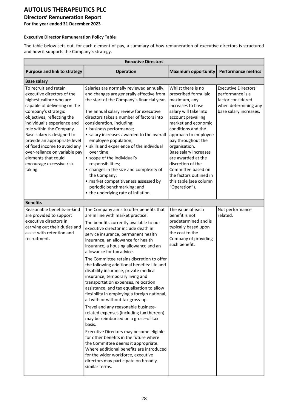 Executive Director Remuneration Policy Table The table below sets out, for each element of pay, a summary of how remuneration of executive directors is structured and how it supports the Company’s strategy. Base salary To recruit and retain executive directors of the highest calibre who are capable of delivering on the Company's strategic objectives, reflecting the individual’s experience and role within the Company. Base salary is designed to provide an appropriate level of fixed income to avoid any over-reliance on variable pay elements that could encourage excessive risk taking. Salaries are normally reviewed annually, and changes are generally effective from the start of the Company’s financial year. The annual salary review for executive directors takes a number of factors into consideration, including: • business performance; • salary increases awarded to the overall employee population; • skills and experience of the individual over time; • scope of the individual’s responsibilities; • changes in the size and complexity of the Company; • market competitiveness assessed by periodic benchmarking; and • the underlying rate of inflation. Whilst there is no prescribed formulaic maximum, any increases to base salary will take into account prevailing market and economic conditions and the approach to employee pay throughout the organisation. Base salary increases are awarded at the discretion of the Committee based on the factors outlined in this table (see column “Operation”). Executive Directors' performance is a factor considered when determining any base salary increases. Benefits Reasonable benefits-in-kind are provided to support executive directors in carrying out their duties and assist with retention and recruitment. The Company aims to offer benefits that are in line with market practice. The benefits currently available to our executive director include death in service insurance, permanent health insurance, an allowance for health insurance, a housing allowance and an allowance for tax advice. The Committee retains discretion to offer the following additional benefits: life and disability insurance, private medical insurance, temporary living and transportation expenses, relocation assistance, and tax equalisation to allow flexibility in employing a foreign national, all with or without tax gross-up. Travel and any reasonable business- related expenses (including tax thereon) may be reimbursed on a gross–of-tax basis. Executive Directors may become eligible for other benefits in the future where the Committee deems it appropriate. Where additional benefits are introduced for the wider workforce, executive directors may participate on broadly similar terms. The value of each benefit is not predetermined and is typically based upon the cost to the Company of providing such benefit. Not performance related. Executive Directors Purpose and link to strategy Operation Maximum opportunity Performance metrics AUTOLUS THERAPEUTICS PLC Directors’ Remuneration Report For the year ended 31 December 2023 28