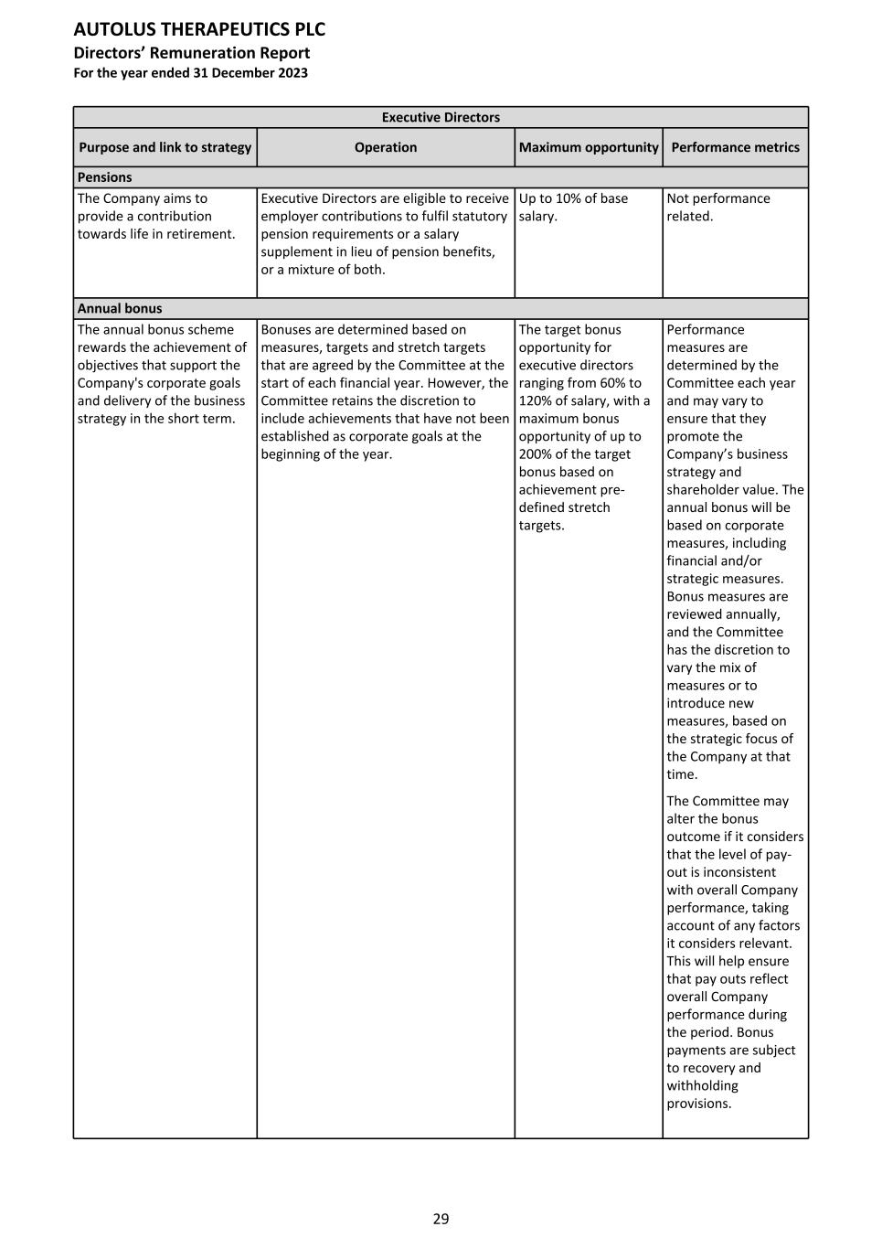 Pensions The Company aims to provide a contribution towards life in retirement. Executive Directors are eligible to receive employer contributions to fulfil statutory pension requirements or a salary supplement in lieu of pension benefits, or a mixture of both. Up to 10% of base salary. Not performance related. Annual bonus The annual bonus scheme rewards the achievement of objectives that support the Company's corporate goals and delivery of the business strategy in the short term. Bonuses are determined based on measures, targets and stretch targets that are agreed by the Committee at the start of each financial year. However, the Committee retains the discretion to include achievements that have not been established as corporate goals at the beginning of the year. The target bonus opportunity for executive directors ranging from 60% to 120% of salary, with a maximum bonus opportunity of up to 200% of the target bonus based on achievement pre- defined stretch targets. Performance measures are determined by the Committee each year and may vary to ensure that they promote the Company’s business strategy and shareholder value. The annual bonus will be based on corporate measures, including financial and/or strategic measures. Bonus measures are reviewed annually, and the Committee has the discretion to vary the mix of measures or to introduce new measures, based on the strategic focus of the Company at that time. The Committee may alter the bonus outcome if it considers that the level of pay- out is inconsistent with overall Company performance, taking account of any factors it considers relevant. This will help ensure that pay outs reflect overall Company performance during the period. Bonus payments are subject to recovery and withholding provisions. Executive Directors Purpose and link to strategy Operation Maximum opportunity Performance metrics AUTOLUS THERAPEUTICS PLC Directors’ Remuneration Report For the year ended 31 December 2023 29