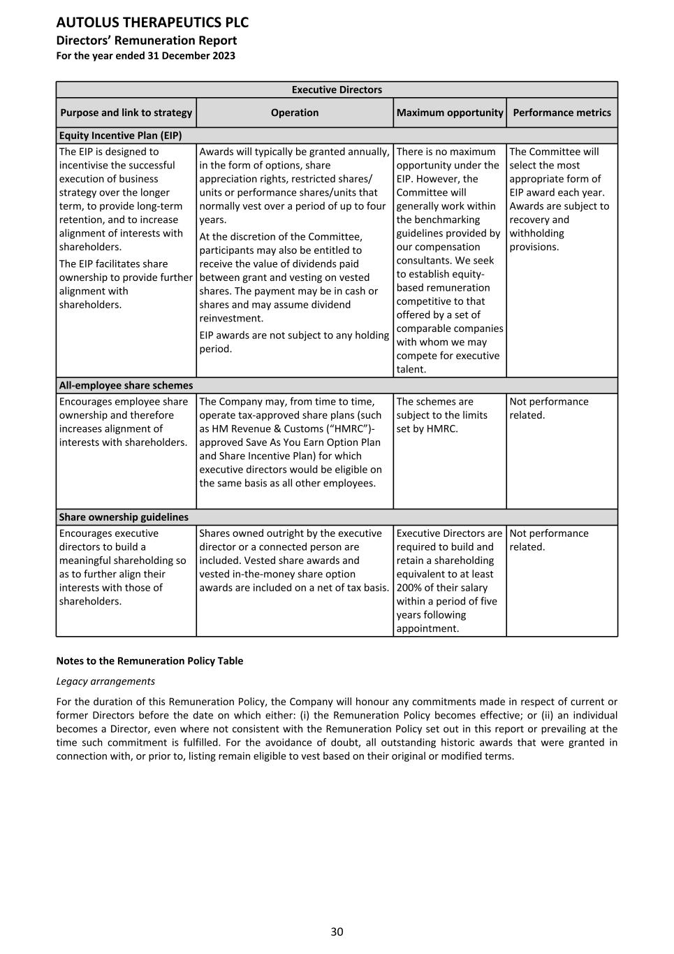 Equity Incentive Plan (EIP) The EIP is designed to incentivise the successful execution of business strategy over the longer term, to provide long-term retention, and to increase alignment of interests with shareholders. The EIP facilitates share ownership to provide further alignment with shareholders. Awards will typically be granted annually, in the form of options, share appreciation rights, restricted shares/ units or performance shares/units that normally vest over a period of up to four years. At the discretion of the Committee, participants may also be entitled to receive the value of dividends paid between grant and vesting on vested shares. The payment may be in cash or shares and may assume dividend reinvestment. EIP awards are not subject to any holding period. There is no maximum opportunity under the EIP. However, the Committee will generally work within the benchmarking guidelines provided by our compensation consultants. We seek to establish equity- based remuneration competitive to that offered by a set of comparable companies with whom we may compete for executive talent. The Committee will select the most appropriate form of EIP award each year. Awards are subject to recovery and withholding provisions. All-employee share schemes Encourages employee share ownership and therefore increases alignment of interests with shareholders. The Company may, from time to time, operate tax-approved share plans (such as HM Revenue & Customs (“HMRC”)- approved Save As You Earn Option Plan and Share Incentive Plan) for which executive directors would be eligible on the same basis as all other employees. The schemes are subject to the limits set by HMRC. Not performance related. Share ownership guidelines Encourages executive directors to build a meaningful shareholding so as to further align their interests with those of shareholders. Shares owned outright by the executive director or a connected person are included. Vested share awards and vested in-the-money share option awards are included on a net of tax basis. Executive Directors are required to build and retain a shareholding equivalent to at least 200% of their salary within a period of five years following appointment. Not performance related. Executive Directors Purpose and link to strategy Operation Maximum opportunity Performance metrics Notes to the Remuneration Policy Table Legacy arrangements For the duration of this Remuneration Policy, the Company will honour any commitments made in respect of current or former Directors before the date on which either: (i) the Remuneration Policy becomes effective; or (ii) an individual becomes a Director, even where not consistent with the Remuneration Policy set out in this report or prevailing at the time such commitment is fulfilled. For the avoidance of doubt, all outstanding historic awards that were granted in connection with, or prior to, listing remain eligible to vest based on their original or modified terms. AUTOLUS THERAPEUTICS PLC Directors’ Remuneration Report For the year ended 31 December 2023 30