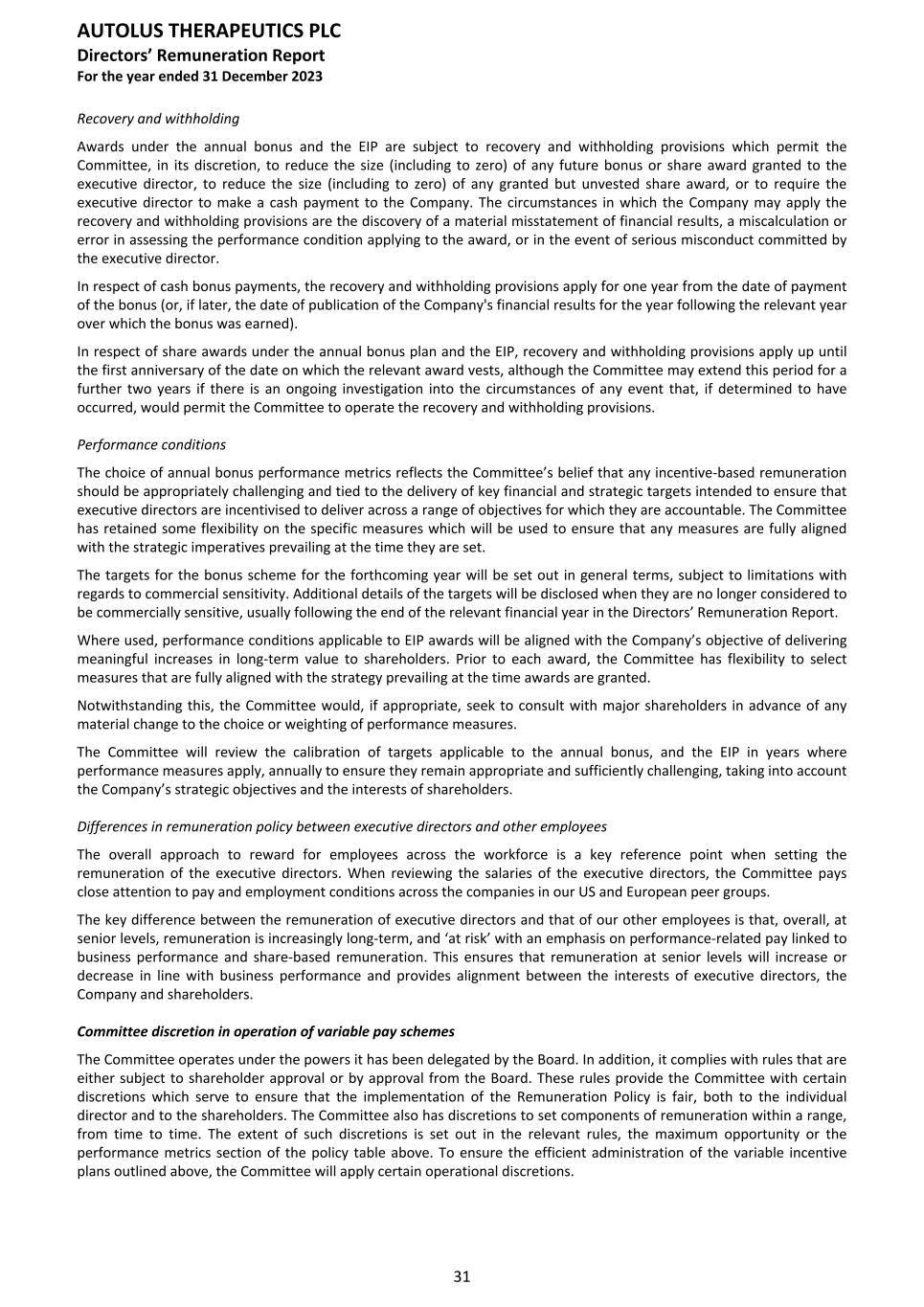Recovery and withholding Awards under the annual bonus and the EIP are subject to recovery and withholding provisions which permit the Committee, in its discretion, to reduce the size (including to zero) of any future bonus or share award granted to the executive director, to reduce the size (including to zero) of any granted but unvested share award, or to require the executive director to make a cash payment to the Company. The circumstances in which the Company may apply the recovery and withholding provisions are the discovery of a material misstatement of financial results, a miscalculation or error in assessing the performance condition applying to the award, or in the event of serious misconduct committed by the executive director. In respect of cash bonus payments, the recovery and withholding provisions apply for one year from the date of payment of the bonus (or, if later, the date of publication of the Company's financial results for the year following the relevant year over which the bonus was earned). In respect of share awards under the annual bonus plan and the EIP, recovery and withholding provisions apply up until the first anniversary of the date on which the relevant award vests, although the Committee may extend this period for a further two years if there is an ongoing investigation into the circumstances of any event that, if determined to have occurred, would permit the Committee to operate the recovery and withholding provisions. Performance conditions The choice of annual bonus performance metrics reflects the Committee’s belief that any incentive-based remuneration should be appropriately challenging and tied to the delivery of key financial and strategic targets intended to ensure that executive directors are incentivised to deliver across a range of objectives for which they are accountable. The Committee has retained some flexibility on the specific measures which will be used to ensure that any measures are fully aligned with the strategic imperatives prevailing at the time they are set. The targets for the bonus scheme for the forthcoming year will be set out in general terms, subject to limitations with regards to commercial sensitivity. Additional details of the targets will be disclosed when they are no longer considered to be commercially sensitive, usually following the end of the relevant financial year in the Directors’ Remuneration Report. Where used, performance conditions applicable to EIP awards will be aligned with the Company’s objective of delivering meaningful increases in long-term value to shareholders. Prior to each award, the Committee has flexibility to select measures that are fully aligned with the strategy prevailing at the time awards are granted. Notwithstanding this, the Committee would, if appropriate, seek to consult with major shareholders in advance of any material change to the choice or weighting of performance measures. The Committee will review the calibration of targets applicable to the annual bonus, and the EIP in years where performance measures apply, annually to ensure they remain appropriate and sufficiently challenging, taking into account the Company’s strategic objectives and the interests of shareholders. Differences in remuneration policy between executive directors and other employees The overall approach to reward for employees across the workforce is a key reference point when setting the remuneration of the executive directors. When reviewing the salaries of the executive directors, the Committee pays close attention to pay and employment conditions across the companies in our US and European peer groups. The key difference between the remuneration of executive directors and that of our other employees is that, overall, at senior levels, remuneration is increasingly long-term, and ‘at risk’ with an emphasis on performance-related pay linked to business performance and share-based remuneration. This ensures that remuneration at senior levels will increase or decrease in line with business performance and provides alignment between the interests of executive directors, the Company and shareholders. Committee discretion in operation of variable pay schemes The Committee operates under the powers it has been delegated by the Board. In addition, it complies with rules that are either subject to shareholder approval or by approval from the Board. These rules provide the Committee with certain discretions which serve to ensure that the implementation of the Remuneration Policy is fair, both to the individual director and to the shareholders. The Committee also has discretions to set components of remuneration within a range, from time to time. The extent of such discretions is set out in the relevant rules, the maximum opportunity or the performance metrics section of the policy table above. To ensure the efficient administration of the variable incentive plans outlined above, the Committee will apply certain operational discretions. AUTOLUS THERAPEUTICS PLC Directors’ Remuneration Report For the year ended 31 December 2023 31
