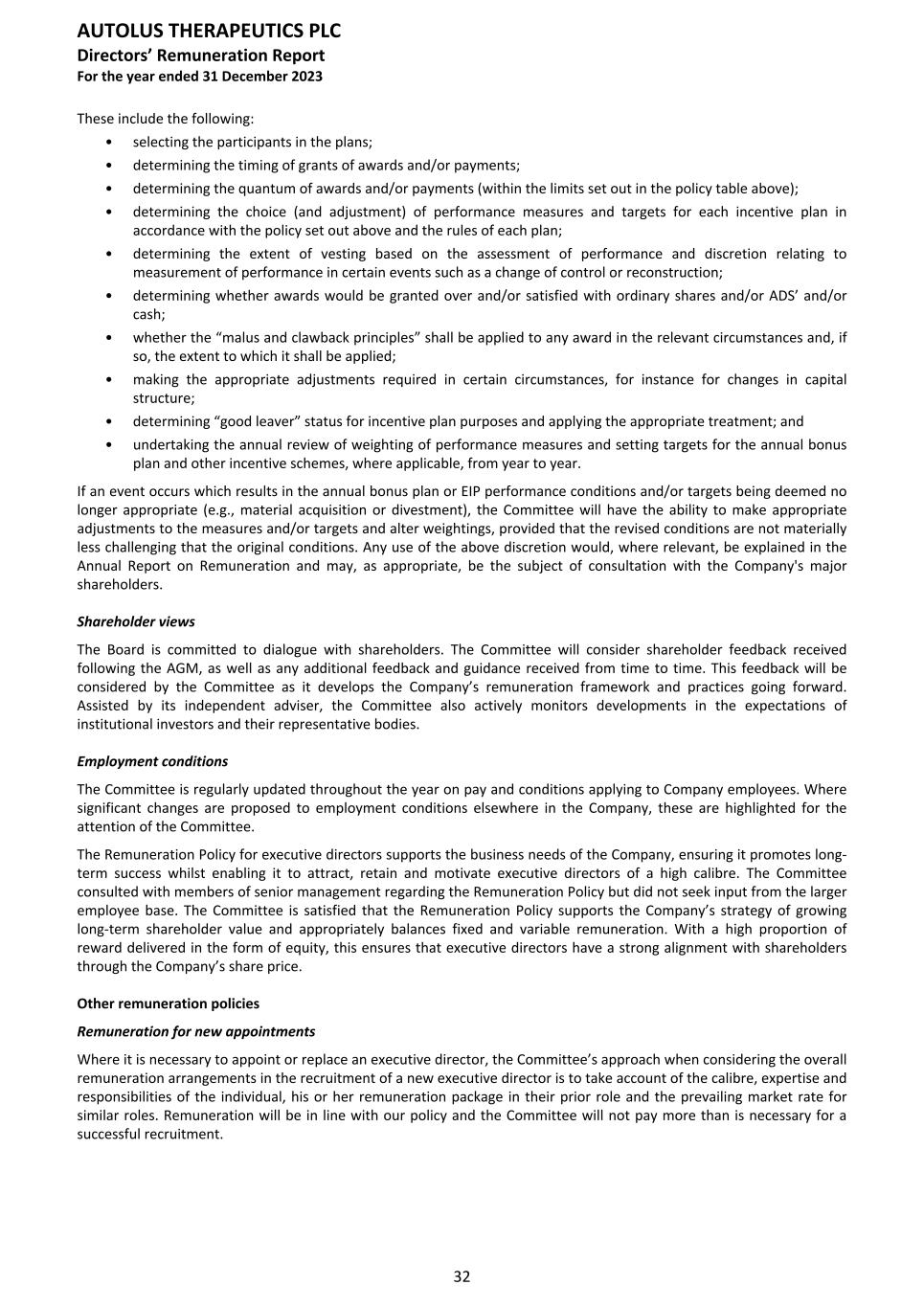These include the following: • selecting the participants in the plans; • determining the timing of grants of awards and/or payments; • determining the quantum of awards and/or payments (within the limits set out in the policy table above); • determining the choice (and adjustment) of performance measures and targets for each incentive plan in accordance with the policy set out above and the rules of each plan; • determining the extent of vesting based on the assessment of performance and discretion relating to measurement of performance in certain events such as a change of control or reconstruction; • determining whether awards would be granted over and/or satisfied with ordinary shares and/or ADS’ and/or cash; • whether the “malus and clawback principles” shall be applied to any award in the relevant circumstances and, if so, the extent to which it shall be applied; • making the appropriate adjustments required in certain circumstances, for instance for changes in capital structure; • determining “good leaver” status for incentive plan purposes and applying the appropriate treatment; and • undertaking the annual review of weighting of performance measures and setting targets for the annual bonus plan and other incentive schemes, where applicable, from year to year. If an event occurs which results in the annual bonus plan or EIP performance conditions and/or targets being deemed no longer appropriate (e.g., material acquisition or divestment), the Committee will have the ability to make appropriate adjustments to the measures and/or targets and alter weightings, provided that the revised conditions are not materially less challenging that the original conditions. Any use of the above discretion would, where relevant, be explained in the Annual Report on Remuneration and may, as appropriate, be the subject of consultation with the Company's major shareholders. Shareholder views The Board is committed to dialogue with shareholders. The Committee will consider shareholder feedback received following the AGM, as well as any additional feedback and guidance received from time to time. This feedback will be considered by the Committee as it develops the Company’s remuneration framework and practices going forward. Assisted by its independent adviser, the Committee also actively monitors developments in the expectations of institutional investors and their representative bodies. Employment conditions The Committee is regularly updated throughout the year on pay and conditions applying to Company employees. Where significant changes are proposed to employment conditions elsewhere in the Company, these are highlighted for the attention of the Committee. The Remuneration Policy for executive directors supports the business needs of the Company, ensuring it promotes long- term success whilst enabling it to attract, retain and motivate executive directors of a high calibre. The Committee consulted with members of senior management regarding the Remuneration Policy but did not seek input from the larger employee base. The Committee is satisfied that the Remuneration Policy supports the Company’s strategy of growing long-term shareholder value and appropriately balances fixed and variable remuneration. With a high proportion of reward delivered in the form of equity, this ensures that executive directors have a strong alignment with shareholders through the Company’s share price. Other remuneration policies Remuneration for new appointments Where it is necessary to appoint or replace an executive director, the Committee’s approach when considering the overall remuneration arrangements in the recruitment of a new executive director is to take account of the calibre, expertise and responsibilities of the individual, his or her remuneration package in their prior role and the prevailing market rate for similar roles. Remuneration will be in line with our policy and the Committee will not pay more than is necessary for a successful recruitment. AUTOLUS THERAPEUTICS PLC Directors’ Remuneration Report For the year ended 31 December 2023 32