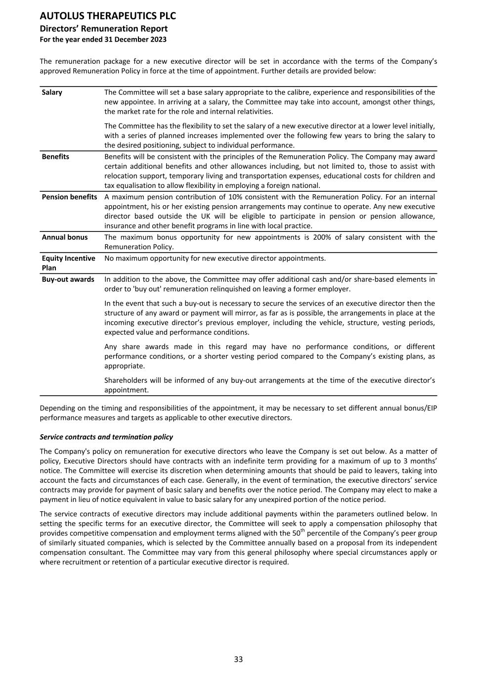 The remuneration package for a new executive director will be set in accordance with the terms of the Company’s approved Remuneration Policy in force at the time of appointment. Further details are provided below: Salary The Committee will set a base salary appropriate to the calibre, experience and responsibilities of the new appointee. In arriving at a salary, the Committee may take into account, amongst other things, the market rate for the role and internal relativities. The Committee has the flexibility to set the salary of a new executive director at a lower level initially, with a series of planned increases implemented over the following few years to bring the salary to the desired positioning, subject to individual performance. Benefits Benefits will be consistent with the principles of the Remuneration Policy. The Company may award certain additional benefits and other allowances including, but not limited to, those to assist with relocation support, temporary living and transportation expenses, educational costs for children and tax equalisation to allow flexibility in employing a foreign national. Pension benefits A maximum pension contribution of 10% consistent with the Remuneration Policy. For an internal appointment, his or her existing pension arrangements may continue to operate. Any new executive director based outside the UK will be eligible to participate in pension or pension allowance, insurance and other benefit programs in line with local practice. Annual bonus The maximum bonus opportunity for new appointments is 200% of salary consistent with the Remuneration Policy. Equity Incentive Plan No maximum opportunity for new executive director appointments. Buy-out awards In addition to the above, the Committee may offer additional cash and/or share-based elements in order to 'buy out' remuneration relinquished on leaving a former employer. In the event that such a buy-out is necessary to secure the services of an executive director then the structure of any award or payment will mirror, as far as is possible, the arrangements in place at the incoming executive director’s previous employer, including the vehicle, structure, vesting periods, expected value and performance conditions. Any share awards made in this regard may have no performance conditions, or different performance conditions, or a shorter vesting period compared to the Company’s existing plans, as appropriate. Shareholders will be informed of any buy-out arrangements at the time of the executive director’s appointment. Depending on the timing and responsibilities of the appointment, it may be necessary to set different annual bonus/EIP performance measures and targets as applicable to other executive directors. Service contracts and termination policy The Company's policy on remuneration for executive directors who leave the Company is set out below. As a matter of policy, Executive Directors should have contracts with an indefinite term providing for a maximum of up to 3 months’ notice. The Committee will exercise its discretion when determining amounts that should be paid to leavers, taking into account the facts and circumstances of each case. Generally, in the event of termination, the executive directors’ service contracts may provide for payment of basic salary and benefits over the notice period. The Company may elect to make a payment in lieu of notice equivalent in value to basic salary for any unexpired portion of the notice period. The service contracts of executive directors may include additional payments within the parameters outlined below. In setting the specific terms for an executive director, the Committee will seek to apply a compensation philosophy that provides competitive compensation and employment terms aligned with the 50th percentile of the Company’s peer group of similarly situated companies, which is selected by the Committee annually based on a proposal from its independent compensation consultant. The Committee may vary from this general philosophy where special circumstances apply or where recruitment or retention of a particular executive director is required. AUTOLUS THERAPEUTICS PLC Directors’ Remuneration Report For the year ended 31 December 2023 33