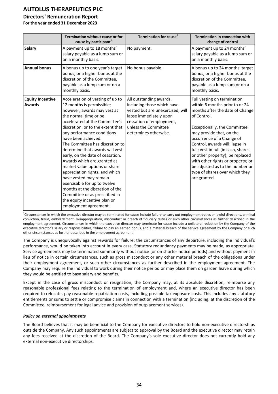Termination without cause or for cause by participant1 Termination for cause1 Termination in connection with change of control Salary A payment up to 18 months’ salary payable as a lump sum or on a monthly basis. No payment. A payment up to 24 months’ salary payable as a lump sum or on a monthly basis. Annual bonus A bonus up to one year’s target bonus, or a higher bonus at the discretion of the Committee, payable as a lump sum or on a monthly basis. No bonus payable. A bonus up to 24 months’ target bonus, or a higher bonus at the discretion of the Committee, payable as a lump sum or on a monthly basis. Equity Incentive Awards Acceleration of vesting of up to 12 months is permissible; however, awards may vest at the normal time or be accelerated at the Committee’s discretion, or to the extent that any performance conditions have been achieved. The Committee has discretion to determine that awards will vest early, on the date of cessation. Awards which are granted as market value options or share appreciation rights, and which have vested may remain exercisable for up to twelve months at the discretion of the Committee or as prescribed in the equity incentive plan or employment agreement. All outstanding awards, including those which have vested but are unexercised, will lapse immediately upon cessation of employment, unless the Committee determines otherwise. Full vesting on termination within 6 months prior to or 24 months after the date of Change of Control. Exceptionally, the Committee may provide that, on the occurrence of a Change of Control, awards will: lapse in full; vest in full (in cash, shares or other property); be replaced with other rights or property; or be adjusted as to the number or type of shares over which they are granted. 1Circumstances in which the executive director may be terminated for cause include failure to carry out employment duties or lawful directions, criminal conviction, fraud, embezzlement, misappropriation, misconduct or breach of fiduciary duties or such other circumstances as further described in the employment agreement. Circumstances in which the executive director may terminate for cause include a unilateral reduction by the Company of the executive director’s salary or responsibilities, failure to pay an earned bonus, and a material breach of the service agreement by the Company or such other circumstances as further described in the employment agreement. The Company is unequivocally against rewards for failure; the circumstances of any departure, including the individual’s performance, would be taken into account in every case. Statutory redundancy payments may be made, as appropriate. Service agreements may be terminated summarily without notice (or on shorter notice periods) and without payment in lieu of notice in certain circumstances, such as gross misconduct or any other material breach of the obligations under their employment agreement, or such other circumstances as further described in the employment agreement. The Company may require the individual to work during their notice period or may place them on garden leave during which they would be entitled to base salary and benefits. Except in the case of gross misconduct or resignation, the Company may, at its absolute discretion, reimburse any reasonable professional fees relating to the termination of employment and, where an executive director has been required to relocate, pay reasonable repatriation costs, including possible tax exposure costs. This includes any statutory entitlements or sums to settle or compromise claims in connection with a termination (including, at the discretion of the Committee, reimbursement for legal advice and provision of outplacement services). Policy on external appointments The Board believes that it may be beneficial to the Company for executive directors to hold non-executive directorships outside the Company. Any such appointments are subject to approval by the Board and the executive director may retain any fees received at the discretion of the Board. The Company’s sole executive director does not currently hold any external non-executive directorships. AUTOLUS THERAPEUTICS PLC Directors’ Remuneration Report For the year ended 31 December 2023 34
