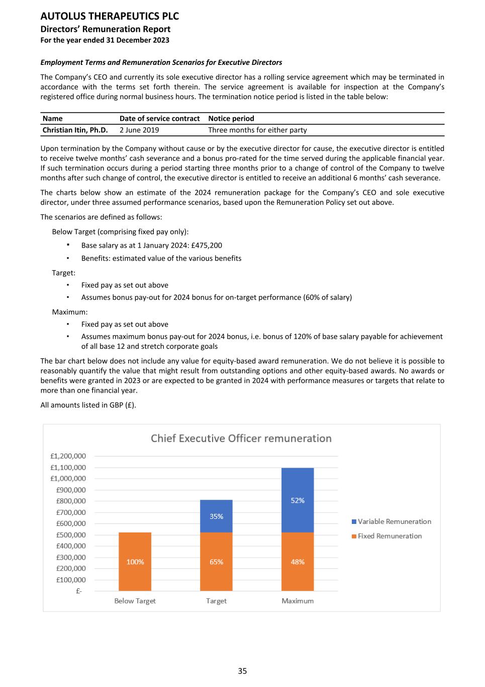 Employment Terms and Remuneration Scenarios for Executive Directors The Company’s CEO and currently its sole executive director has a rolling service agreement which may be terminated in accordance with the terms set forth therein. The service agreement is available for inspection at the Company’s registered office during normal business hours. The termination notice period is listed in the table below: Name Date of service contract Notice period Christian Itin, Ph.D. 2 June 2019 Three months for either party Upon termination by the Company without cause or by the executive director for cause, the executive director is entitled to receive twelve months’ cash severance and a bonus pro-rated for the time served during the applicable financial year. If such termination occurs during a period starting three months prior to a change of control of the Company to twelve months after such change of control, the executive director is entitled to receive an additional 6 months’ cash severance. The charts below show an estimate of the 2024 remuneration package for the Company’s CEO and sole executive director, under three assumed performance scenarios, based upon the Remuneration Policy set out above. The scenarios are defined as follows: Below Target (comprising fixed pay only): ▪ Base salary as at 1 January 2024: £475,200 ▪ Benefits: estimated value of the various benefits Target: ▪ Fixed pay as set out above ▪ Assumes bonus pay-out for 2024 bonus for on-target performance (60% of salary) Maximum: ▪ Fixed pay as set out above ▪ Assumes maximum bonus pay-out for 2024 bonus, i.e. bonus of 120% of base salary payable for achievement of all base 12 and stretch corporate goals The bar chart below does not include any value for equity-based award remuneration. We do not believe it is possible to reasonably quantify the value that might result from outstanding options and other equity-based awards. No awards or benefits were granted in 2023 or are expected to be granted in 2024 with performance measures or targets that relate to more than one financial year. All amounts listed in GBP (£). AUTOLUS THERAPEUTICS PLC Directors’ Remuneration Report For the year ended 31 December 2023 35