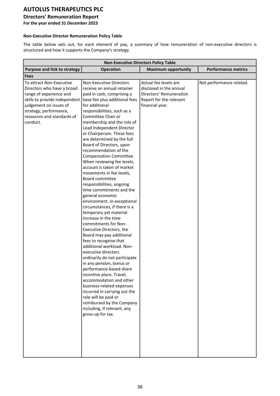 Non-Executive Director Remuneration Policy Table The table below sets out, for each element of pay, a summary of how remuneration of non-executive directors is structured and how it supports the Company’s strategy. Fees To attract Non-Executive Directors who have a broad range of experience and skills to provide independent judgement on issues of strategy, performance, resources and standards of conduct. Non-Executive Directors receive an annual retainer paid in cash, comprising a base fee plus additional fees for additional responsibilities, such as a Committee Chair or membership and the role of Lead Independent Director or Chairperson. These fees are determined by the full Board of Directors, upon recommendation of the Compensation Committee. When reviewing fee levels, account is taken of market movements in fee levels, Board committee responsibilities, ongoing time commitments and the general economic environment. In exceptional circumstances, if there is a temporary yet material increase in the time commitments for Non- Executive Directors, the Board may pay additional fees to recognise that additional workload. Non- executive directors ordinarily do not participate in any pension, bonus or performance-based share incentive plans. Travel, accommodation and other business-related expenses incurred in carrying out the role will be paid or reimbursed by the Company including, if relevant, any gross-up for tax. Actual fee levels are disclosed in the annual Directors’ Remuneration Report for the relevant financial year. Not performance related. Non-Executive Directors Policy Table Purpose and link to strategy Operation Maximum opportunity Performance metrics AUTOLUS THERAPEUTICS PLC Directors’ Remuneration Report For the year ended 31 December 2023 36