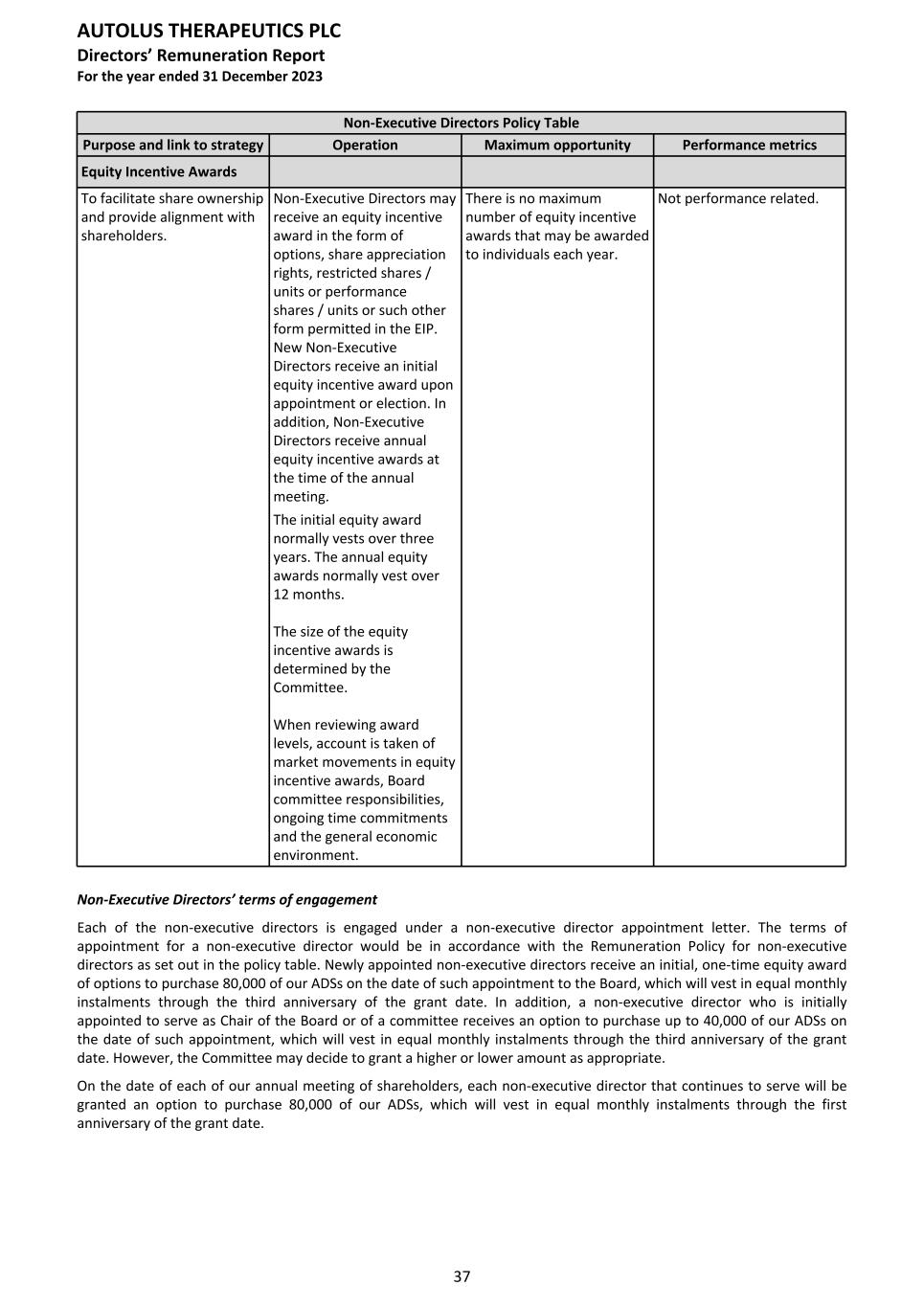 Equity Incentive Awards To facilitate share ownership and provide alignment with shareholders. Non-Executive Directors may receive an equity incentive award in the form of options, share appreciation rights, restricted shares / units or performance shares / units or such other form permitted in the EIP. New Non-Executive Directors receive an initial equity incentive award upon appointment or election. In addition, Non-Executive Directors receive annual equity incentive awards at the time of the annual meeting. There is no maximum number of equity incentive awards that may be awarded to individuals each year. Not performance related. The initial equity award normally vests over three years. The annual equity awards normally vest over 12 months. The size of the equity incentive awards is determined by the Committee. When reviewing award levels, account is taken of market movements in equity incentive awards, Board committee responsibilities, ongoing time commitments and the general economic environment. Non-Executive Directors Policy Table Purpose and link to strategy Operation Maximum opportunity Performance metrics Non-Executive Directors’ terms of engagement Each of the non-executive directors is engaged under a non-executive director appointment letter. The terms of appointment for a non-executive director would be in accordance with the Remuneration Policy for non-executive directors as set out in the policy table. Newly appointed non-executive directors receive an initial, one-time equity award of options to purchase 80,000 of our ADSs on the date of such appointment to the Board, which will vest in equal monthly instalments through the third anniversary of the grant date. In addition, a non-executive director who is initially appointed to serve as Chair of the Board or of a committee receives an option to purchase up to 40,000 of our ADSs on the date of such appointment, which will vest in equal monthly instalments through the third anniversary of the grant date. However, the Committee may decide to grant a higher or lower amount as appropriate. On the date of each of our annual meeting of shareholders, each non-executive director that continues to serve will be granted an option to purchase 80,000 of our ADSs, which will vest in equal monthly instalments through the first anniversary of the grant date. AUTOLUS THERAPEUTICS PLC Directors’ Remuneration Report For the year ended 31 December 2023 37