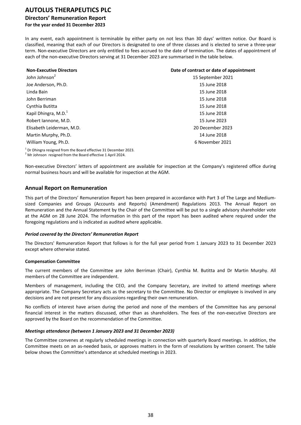 In any event, each appointment is terminable by either party on not less than 30 days’ written notice. Our Board is classified, meaning that each of our Directors is designated to one of three classes and is elected to serve a three-year term. Non-executive Directors are only entitled to fees accrued to the date of termination. The dates of appointment of each of the non-executive Directors serving at 31 December 2023 are summarised in the table below. Non-Executive Directors Date of contract or date of appointment John Johnson2 15 September 2021 Joe Anderson, Ph.D. 15 June 2018 Linda Bain 15 June 2018 John Berriman 15 June 2018 Cynthia Butitta 15 June 2018 Kapil Dhingra, M.D.1 15 June 2018 Robert Iannone, M.D. 15 June 2023 Elisabeth Leiderman, M.D. 20 December 2023 Martin Murphy, Ph.D. 14 June 2018 William Young, Ph.D. 6 November 2021 1 Dr Dhingra resigned from the Board effective 31 December 2023. 2 Mr Johnson resigned from the Board effective 1 April 2024. Non-executive Directors’ letters of appointment are available for inspection at the Company’s registered office during normal business hours and will be available for inspection at the AGM. Annual Report on Remuneration This part of the Directors’ Remuneration Report has been prepared in accordance with Part 3 of The Large and Medium- sized Companies and Groups (Accounts and Reports) (Amendment) Regulations 2013. The Annual Report on Remuneration and the Annual Statement by the Chair of the Committee will be put to a single advisory shareholder vote at the AGM on 28 June 2024. The information in this part of the report has been audited where required under the foregoing regulations and is indicated as audited where applicable. Period covered by the Directors’ Remuneration Report The Directors' Remuneration Report that follows is for the full year period from 1 January 2023 to 31 December 2023 except where otherwise stated. Compensation Committee The current members of the Committee are John Berriman (Chair), Cynthia M. Butitta and Dr Martin Murphy. All members of the Committee are independent. Members of management, including the CEO, and the Company Secretary, are invited to attend meetings where appropriate. The Company Secretary acts as the secretary to the Committee. No Director or employee is involved in any decisions and are not present for any discussions regarding their own remuneration. No conflicts of interest have arisen during the period and none of the members of the Committee has any personal financial interest in the matters discussed, other than as shareholders. The fees of the non-executive Directors are approved by the Board on the recommendation of the Committee. Meetings attendance (between 1 January 2023 and 31 December 2023) The Committee convenes at regularly scheduled meetings in connection with quarterly Board meetings. In addition, the Committee meets on an as-needed basis, or approves matters in the form of resolutions by written consent. The table below shows the Committee’s attendance at scheduled meetings in 2023. AUTOLUS THERAPEUTICS PLC Directors’ Remuneration Report For the year ended 31 December 2023 38
