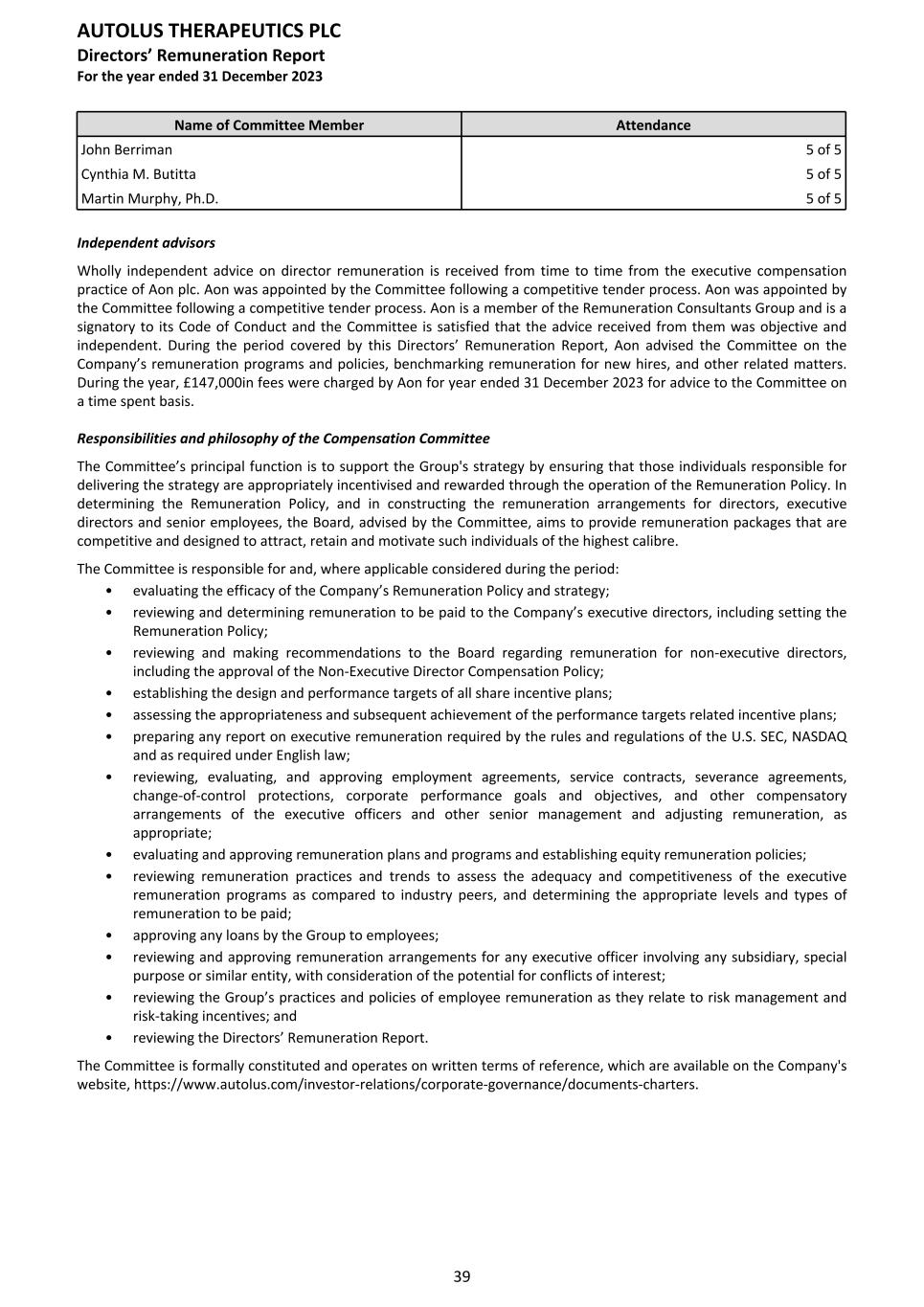 Name of Committee Member Attendance John Berriman 5 of 5 Cynthia M. Butitta 5 of 5 Martin Murphy, Ph.D. 5 of 5 Independent advisors Wholly independent advice on director remuneration is received from time to time from the executive compensation practice of Aon plc. Aon was appointed by the Committee following a competitive tender process. Aon was appointed by the Committee following a competitive tender process. Aon is a member of the Remuneration Consultants Group and is a signatory to its Code of Conduct and the Committee is satisfied that the advice received from them was objective and independent. During the period covered by this Directors’ Remuneration Report, Aon advised the Committee on the Company’s remuneration programs and policies, benchmarking remuneration for new hires, and other related matters. During the year, £147,000in fees were charged by Aon for year ended 31 December 2023 for advice to the Committee on a time spent basis. Responsibilities and philosophy of the Compensation Committee The Committee’s principal function is to support the Group's strategy by ensuring that those individuals responsible for delivering the strategy are appropriately incentivised and rewarded through the operation of the Remuneration Policy. In determining the Remuneration Policy, and in constructing the remuneration arrangements for directors, executive directors and senior employees, the Board, advised by the Committee, aims to provide remuneration packages that are competitive and designed to attract, retain and motivate such individuals of the highest calibre. The Committee is responsible for and, where applicable considered during the period: • evaluating the efficacy of the Company’s Remuneration Policy and strategy; • reviewing and determining remuneration to be paid to the Company’s executive directors, including setting the Remuneration Policy; • reviewing and making recommendations to the Board regarding remuneration for non-executive directors, including the approval of the Non-Executive Director Compensation Policy; • establishing the design and performance targets of all share incentive plans; • assessing the appropriateness and subsequent achievement of the performance targets related incentive plans; • preparing any report on executive remuneration required by the rules and regulations of the U.S. SEC, NASDAQ and as required under English law; • reviewing, evaluating, and approving employment agreements, service contracts, severance agreements, change-of-control protections, corporate performance goals and objectives, and other compensatory arrangements of the executive officers and other senior management and adjusting remuneration, as appropriate; • evaluating and approving remuneration plans and programs and establishing equity remuneration policies; • reviewing remuneration practices and trends to assess the adequacy and competitiveness of the executive remuneration programs as compared to industry peers, and determining the appropriate levels and types of remuneration to be paid; • approving any loans by the Group to employees; • reviewing and approving remuneration arrangements for any executive officer involving any subsidiary, special purpose or similar entity, with consideration of the potential for conflicts of interest; • reviewing the Group’s practices and policies of employee remuneration as they relate to risk management and risk-taking incentives; and • reviewing the Directors’ Remuneration Report. The Committee is formally constituted and operates on written terms of reference, which are available on the Company's website, https://www.autolus.com/investor-relations/corporate-governance/documents-charters. AUTOLUS THERAPEUTICS PLC Directors’ Remuneration Report For the year ended 31 December 2023 39