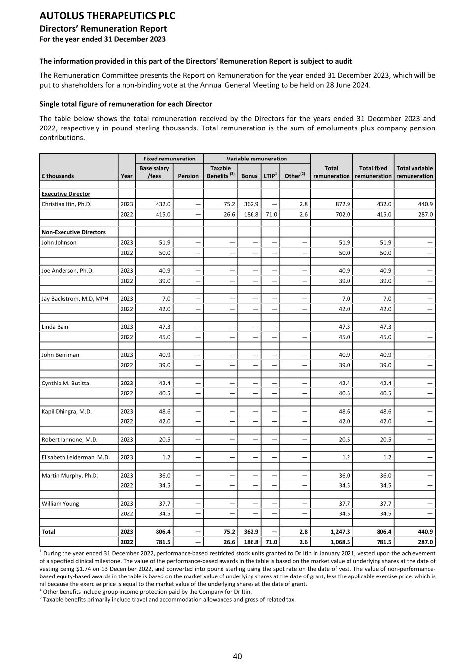 The information provided in this part of the Directors' Remuneration Report is subject to audit The Remuneration Committee presents the Report on Remuneration for the year ended 31 December 2023, which will be put to shareholders for a non-binding vote at the Annual General Meeting to be held on 28 June 2024. Single total figure of remuneration for each Director The table below shows the total remuneration received by the Directors for the years ended 31 December 2023 and 2022, respectively in pound sterling thousands. Total remuneration is the sum of emoluments plus company pension contributions. Fixed remuneration Variable remuneration Total remuneration Total fixed remuneration Total variable remuneration£ thousands Year Base salary /fees Pension Taxable Benefits (3) Bonus LTIP1 Other(2) Executive Director Christian Itin, Ph.D. 2023 432.0 — 75.2 362.9 — 2.8 872.9 432.0 440.9 2022 415.0 — 26.6 186.8 71.0 2.6 702.0 415.0 287.0 Non-Executive Directors John Johnson 2023 51.9 — — — — — 51.9 51.9 — 2022 50.0 — — — — — 50.0 50.0 — Joe Anderson, Ph.D. 2023 40.9 — — — — — 40.9 40.9 — 2022 39.0 — — — — — 39.0 39.0 — Jay Backstrom, M.D, MPH 2023 7.0 — — — — — 7.0 7.0 — 2022 42.0 — — — — — 42.0 42.0 — Linda Bain 2023 47.3 — — — — — 47.3 47.3 — 2022 45.0 — — — — — 45.0 45.0 — John Berriman 2023 40.9 — — — — — 40.9 40.9 — 2022 39.0 — — — — — 39.0 39.0 — Cynthia M. Butitta 2023 42.4 — — — — — 42.4 42.4 — 2022 40.5 — — — — — 40.5 40.5 — Kapil Dhingra, M.D. 2023 48.6 — — — — — 48.6 48.6 — 2022 42.0 — — — — — 42.0 42.0 — Robert Iannone, M.D. 2023 20.5 — — — — — 20.5 20.5 — Elisabeth Leiderman, M.D. 2023 1.2 — — — — — 1.2 1.2 — Martin Murphy, Ph.D. 2023 36.0 — — — — — 36.0 36.0 — 2022 34.5 — — — — — 34.5 34.5 — William Young 2023 37.7 — — — — — 37.7 37.7 — 2022 34.5 — — — — — 34.5 34.5 — Total 2023 806.4 — 75.2 362.9 — 2.8 1,247.3 806.4 440.9 2022 781.5 — 26.6 186.8 71.0 2.6 1,068.5 781.5 287.0 1 During the year ended 31 December 2022, performance-based restricted stock units granted to Dr Itin in January 2021, vested upon the achievement of a specified clinical milestone. The value of the performance-based awards in the table is based on the market value of underlying shares at the date of vesting being $1.74 on 13 December 2022, and converted into pound sterling using the spot rate on the date of vest. The value of non-performance- based equity-based awards in the table is based on the market value of underlying shares at the date of grant, less the applicable exercise price, which is nil because the exercise price is equal to the market value of the underlying shares at the date of grant. 2 Other benefits include group income protection paid by the Company for Dr Itin. 3 Taxable benefits primarily include travel and accommodation allowances and gross of related tax. AUTOLUS THERAPEUTICS PLC Directors’ Remuneration Report For the year ended 31 December 2023 40