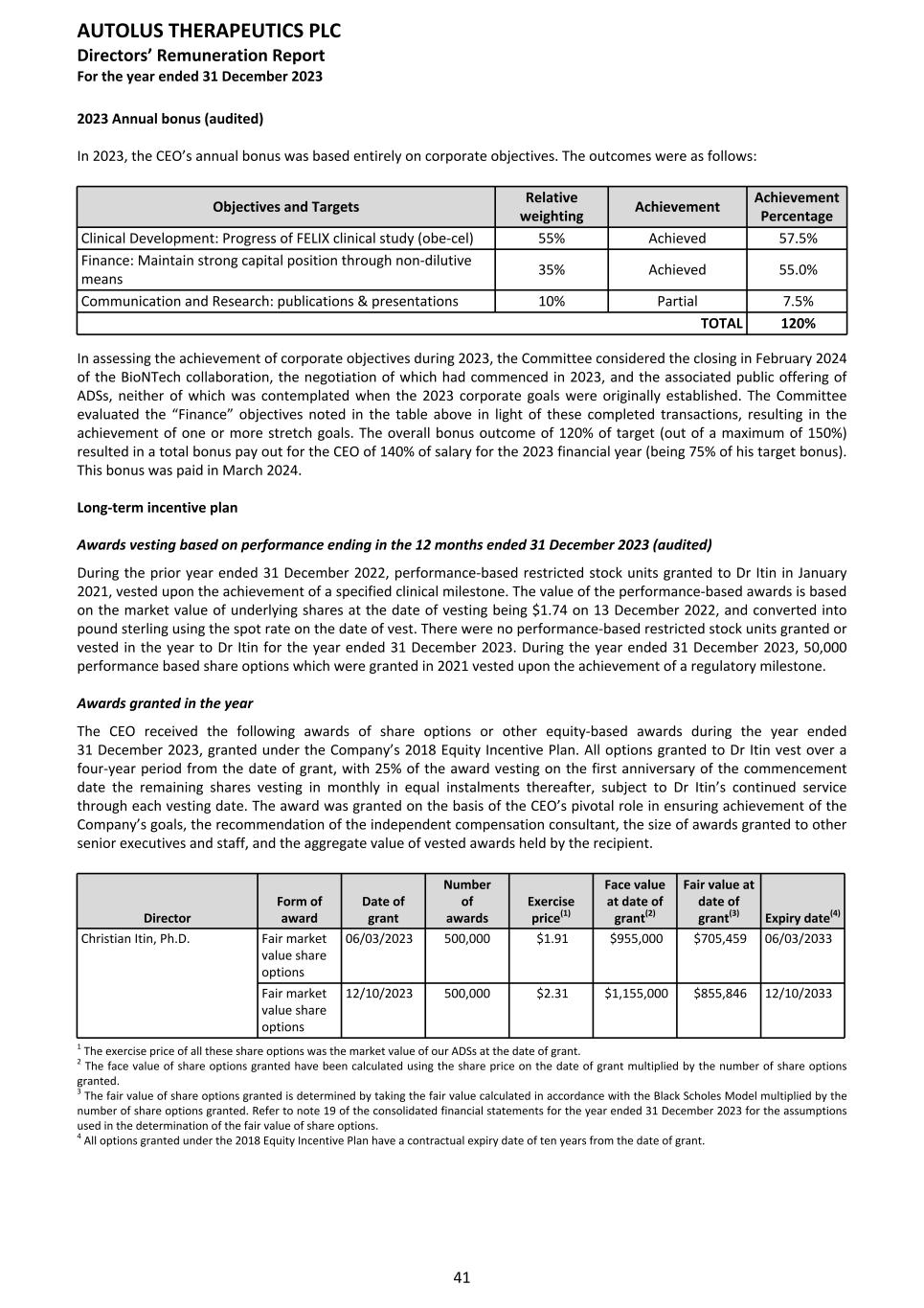 2023 Annual bonus (audited) In 2023, the CEO’s annual bonus was based entirely on corporate objectives. The outcomes were as follows: Objectives and Targets Relative weighting Achievement Achievement Percentage Clinical Development: Progress of FELIX clinical study (obe-cel) 55% Achieved 57.5% Finance: Maintain strong capital position through non-dilutive means 35% Achieved 55.0% Communication and Research: publications & presentations 10% Partial 7.5% TOTAL 120% In assessing the achievement of corporate objectives during 2023, the Committee considered the closing in February 2024 of the BioNTech collaboration, the negotiation of which had commenced in 2023, and the associated public offering of ADSs, neither of which was contemplated when the 2023 corporate goals were originally established. The Committee evaluated the “Finance” objectives noted in the table above in light of these completed transactions, resulting in the achievement of one or more stretch goals. The overall bonus outcome of 120% of target (out of a maximum of 150%) resulted in a total bonus pay out for the CEO of 140% of salary for the 2023 financial year (being 75% of his target bonus). This bonus was paid in March 2024. Long-term incentive plan Awards vesting based on performance ending in the 12 months ended 31 December 2023 (audited) During the prior year ended 31 December 2022, performance-based restricted stock units granted to Dr Itin in January 2021, vested upon the achievement of a specified clinical milestone. The value of the performance-based awards is based on the market value of underlying shares at the date of vesting being $1.74 on 13 December 2022, and converted into pound sterling using the spot rate on the date of vest. There were no performance-based restricted stock units granted or vested in the year to Dr Itin for the year ended 31 December 2023. During the year ended 31 December 2023, 50,000 performance based share options which were granted in 2021 vested upon the achievement of a regulatory milestone. Awards granted in the year The CEO received the following awards of share options or other equity-based awards during the year ended 31 December 2023, granted under the Company’s 2018 Equity Incentive Plan. All options granted to Dr Itin vest over a four-year period from the date of grant, with 25% of the award vesting on the first anniversary of the commencement date the remaining shares vesting in monthly in equal instalments thereafter, subject to Dr Itin’s continued service through each vesting date. The award was granted on the basis of the CEO’s pivotal role in ensuring achievement of the Company’s goals, the recommendation of the independent compensation consultant, the size of awards granted to other senior executives and staff, and the aggregate value of vested awards held by the recipient. Director Form of award Date of grant Number of awards Exercise price(1) Face value at date of grant(2) Fair value at date of grant(3) Expiry date(4) Christian Itin, Ph.D. Fair market value share options 06/03/2023 500,000 $1.91 $955,000 $705,459 06/03/2033 Fair market value share options 12/10/2023 500,000 $2.31 $1,155,000 $855,846 12/10/2033 1 The exercise price of all these share options was the market value of our ADSs at the date of grant. 2 The face value of share options granted have been calculated using the share price on the date of grant multiplied by the number of share options granted. 3 The fair value of share options granted is determined by taking the fair value calculated in accordance with the Black Scholes Model multiplied by the number of share options granted. Refer to note 19 of the consolidated financial statements for the year ended 31 December 2023 for the assumptions used in the determination of the fair value of share options. 4 All options granted under the 2018 Equity Incentive Plan have a contractual expiry date of ten years from the date of grant. AUTOLUS THERAPEUTICS PLC Directors’ Remuneration Report For the year ended 31 December 2023 41