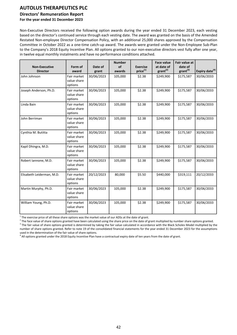 Non-Executive Directors received the following option awards during the year ended 31 December 2023, each vesting based on the director’s continued service through each vesting date. The award was granted on the basis of the Amended Restated Non-employee Director Compensation Policy, with an additional 25,000 shares approved by the Compensation Committee in October 2022 as a one-time catch-up award. The awards were granted under the Non-Employee Sub-Plan to the Company’s 2018 Equity Incentive Plan. All options granted to our non-executive directors vest fully after one year, in twelve equal monthly instalments and have no performance conditions attached. Non-Executive Director Form of award Date of grant Number of awards Exercise price(1) Face value at date of grant(2) Fair value at date of grant(3) Expiry date(4) John Johnson Fair market value share options 30/06/2023 105,000 $2.38 $249,900 $175,587 30/06/2033 Joseph Anderson, Ph.D. Fair market value share options 30/06/2023 105,000 $2.38 $249,900 $175,587 30/06/2033 Linda Bain Fair market value share options 30/06/2023 105,000 $2.38 $249,900 $175,587 30/06/2033 John Berriman Fair market value share options 30/06/2023 105,000 $2.38 $249,900 $175,587 30/06/2033 Cynthia M. Butitta Fair market value share options 30/06/2023 105,000 $2.38 $249,900 $175,587 30/06/2033 Kapil Dhingra, M.D. Fair market value share options 30/06/2023 105,000 $2.38 $249,900 $175,587 30/06/2033 Robert Iannone, M.D. Fair market value share options 30/06/2023 105,000 $2.38 $249,900 $175,587 30/06/2033 Elisabeth Leiderman, M.D. Fair market value share options 20/12/2023 80,000 $5.50 $440,000 $319,111 20/12/2033 Martin Murphy, Ph.D. Fair market value share options 30/06/2023 105,000 $2.38 $249,900 $175,587 30/06/2033 William Young, Ph.D. Fair market value share options 30/06/2023 105,000 $2.38 $249,900 $175,587 30/06/2033 1 The exercise price of all these share options was the market value of our ADSs at the date of grant. 2 The face value of share options granted have been calculated using the share price on the date of grant multiplied by number share options granted. 3 The fair value of share options granted is determined by taking the fair value calculated in accordance with the Black Scholes Model multiplied by the number of share options granted. Refer to note 19 of the consolidated financial statements for the year ended 31 December 2023 for the assumptions used in the determination of the fair value of share options. 4 All options granted under the 2018 Equity Incentive Plan have a contractual expiry date of ten years from the date of grant. AUTOLUS THERAPEUTICS PLC Directors’ Remuneration Report For the year ended 31 December 2023 42