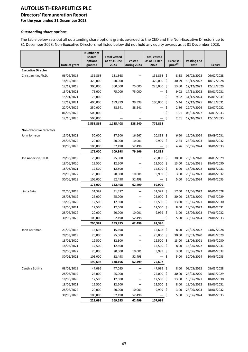 Outstanding share options The table below sets out all outstanding share options grants awarded to the CEO and the Non-Executive Directors up to 31 December 2023. Non-Executive Directors not listed below did not hold any equity awards as at 31 December 2023. Date of grant Number of shares options granted Total vested as at 31 Dec 2023 Vested during 2023 Total vested as at 31 Dec 2022 Exercise price(1) Vesting end date Expiry Executive Director Christian Itin, Ph.D. 06/02/2018 131,868 131,868 — 131,868 $ 8.38 06/02/2022 06/02/2028 18/12/2018 320,000 320,000 — 320,000 $ 30.29 18/12/2022 18/12/2028 12/12/2019 300,000 300,000 75,000 225,000 $ 13.00 12/12/2023 12/12/2029 15/01/2021 75,000 75,000 75,000 — $ 9.02 17/11/2023 15/01/2031 15/01/2021 75,000 — — — $ 9.02 31/12/2024 15/01/2031 17/12/2021 400,000 199,999 99,999 100,000 $ 5.44 17/12/2025 18/12/2031 22/07/2022 250,000 88,541 88,541 — $ 2.86 22/07/2026 22/07/2032 06/03/2023 500,000 — — — $ 1.91 06/03/2027 06/03/2033 12/10/2023 500,000 — — — $ 2.31 12/10/2027 12/10/2033 2,551,868 1,115,408 338,540 776,868 Non-Executive Directors John Johnson 15/09/2021 50,000 37,500 16,667 20,833 $ 6.60 15/09/2024 15/09/2031 28/06/2022 20,000 20,000 10,001 9,999 $ 2.84 28/06/2023 28/06/2032 30/06/2023 105,000 52,498 52,498 — $ 4.76 30/06/2024 30/06/2033 175,000 109,998 79,166 30,832 Joe Anderson, Ph.D. 28/03/2019 25,000 25,000 — 25,000 $ 30.00 28/03/2020 28/03/2029 18/06/2020 12,500 12,500 — 12,500 $ 13.00 18/06/2021 18/06/2030 18/06/2021 12,500 12,500 — 12,500 $ 8.00 18/06/2022 18/06/2031 28/06/2022 20,000 20,000 10,001 9,999 $ 3.00 28/06/2023 28/06/2032 30/06/2023 105,000 52,498 52,498 — $ 5.00 30/06/2024 30/06/2033 175,000 122,498 62,499 59,999 Linda Bain 21/06/2018 31,397 31,397 — 31,397 $ 17.00 21/06/2022 20/06/2028 28/03/2019 25,000 25,000 — 25,000 $ 30.00 28/03/2020 27/03/2029 18/06/2020 12,500 12,500 — 12,500 $ 13.00 18/06/2021 18/06/2030 18/06/2021 12,500 12,500 — 12,500 $ 8.00 18/06/2022 18/06/2031 28/06/2022 20,000 20,000 10,001 9,999 $ 3.00 28/06/2023 27/06/2032 30/06/2023 105,000 52,498 52,498 — $ 5.00 30/06/2024 29/06/2033 206,397 153,895 62,499 91,396 John Berriman 23/02/2018 15,698 15,698 — 15,698 $ 8.00 23/02/2022 23/02/2028 28/03/2019 25,000 25,000 — 25,000 $ 30.00 28/03/2020 28/03/2029 18/06/2020 12,500 12,500 — 12,500 $ 13.00 18/06/2021 18/06/2030 18/06/2021 12,500 12,500 — 12,500 $ 8.00 18/06/2022 18/06/2031 28/06/2022 20,000 20,000 10,001 9,999 $ 3.00 28/06/2023 28/06/2032 30/06/2023 105,000 52,498 52,498 — $ 5.00 30/06/2024 30/06/2033 190,698 138,196 62,499 75,697 Cynthia Butitta 08/03/2018 47,095 47,095 — 47,095 $ 8.00 08/03/2022 08/03/2028 28/03/2019 25,000 25,000 — 25,000 $ 30.00 28/03/2020 28/03/2029 18/06/2020 12,500 12,500 — 12,500 $ 13.00 18/06/2021 18/06/2030 18/06/2021 12,500 12,500 — 12,500 $ 8.00 18/06/2022 18/06/2031 28/06/2022 20,000 20,000 10,001 9,999 $ 3.00 28/06/2023 28/06/2032 30/06/2023 105,000 52,498 52,498 — $ 5.00 30/06/2024 30/06/2033 222,095 169,593 62,499 107,094 AUTOLUS THERAPEUTICS PLC Directors’ Remuneration Report For the year ended 31 December 2023 43