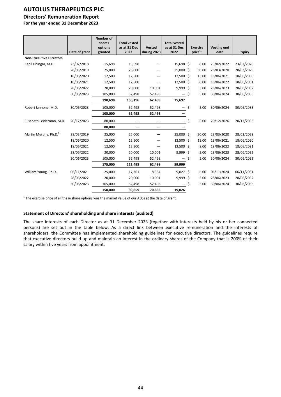 Date of grant Number of shares options granted Total vested as at 31 Dec 2023 Vested during 2023 Total vested as at 31 Dec 2022 Exercise price(1) Vesting end date Expiry Non-Executive Directors Kapil Dhingra, M.D. 23/02/2018 15,698 15,698 — 15,698 $ 8.00 23/02/2022 23/02/2028 28/03/2019 25,000 25,000 — 25,000 $ 30.00 28/03/2020 28/03/2029 18/06/2020 12,500 12,500 — 12,500 $ 13.00 18/06/2021 18/06/2030 18/06/2021 12,500 12,500 — 12,500 $ 8.00 18/06/2022 18/06/2031 28/06/2022 20,000 20,000 10,001 9,999 $ 3.00 28/06/2023 28/06/2032 30/06/2023 105,000 52,498 52,498 — $ 5.00 30/06/2024 30/06/2033 190,698 138,196 62,499 75,697 Robert Iannone, M.D. 30/06/2023 105,000 52,498 52,498 — $ 5.00 30/06/2024 30/06/2033 105,000 52,498 52,498 — Elisabeth Leiderman, M.D. 20/12/2023 80,000 — — — $ 6.00 20/12/2026 20/12/2033 80,000 — — — Martin Murphy, Ph.D.5 28/03/2019 25,000 25,000 — 25,000 $ 30.00 28/03/2020 28/03/2029 18/06/2020 12,500 12,500 — 12,500 $ 13.00 18/06/2021 18/06/2030 18/06/2021 12,500 12,500 — 12,500 $ 8.00 18/06/2022 18/06/2031 28/06/2022 20,000 20,000 10,001 9,999 $ 3.00 28/06/2023 28/06/2032 30/06/2023 105,000 52,498 52,498 — $ 5.00 30/06/2024 30/06/2033 175,000 122,498 62,499 59,999 William Young, Ph.D. 06/11/2021 25,000 17,361 8,334 9,027 $ 6.00 06/11/2024 06/11/2031 28/06/2022 20,000 20,000 10,001 9,999 $ 3.00 28/06/2023 28/06/2032 30/06/2023 105,000 52,498 52,498 — $ 5.00 30/06/2024 30/06/2033 150,000 89,859 70,833 19,026 1 The exercise price of all these share options was the market value of our ADSs at the date of grant. Statement of Directors’ shareholding and share interests (audited) The share interests of each Director as at 31 December 2023 (together with interests held by his or her connected persons) are set out in the table below. As a direct link between executive remuneration and the interests of shareholders, the Committee has implemented shareholding guidelines for executive directors. The guidelines require that executive directors build up and maintain an interest in the ordinary shares of the Company that is 200% of their salary within five years from appointment. AUTOLUS THERAPEUTICS PLC Directors’ Remuneration Report For the year ended 31 December 2023 44