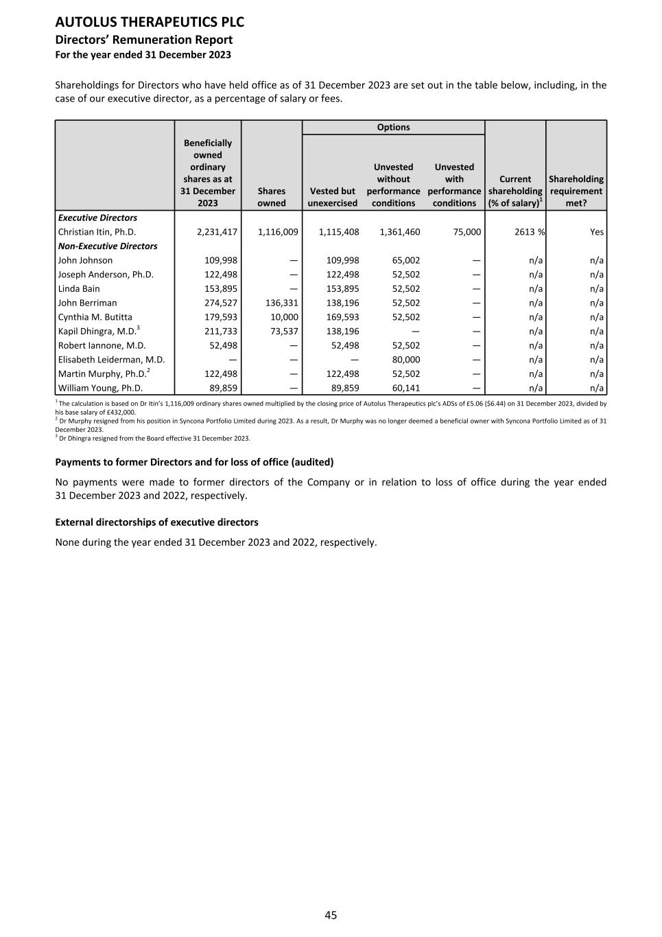 Shareholdings for Directors who have held office as of 31 December 2023 are set out in the table below, including, in the case of our executive director, as a percentage of salary or fees. Shares owned Options Beneficially owned ordinary shares as at 31 December 2023 Vested but unexercised Unvested without performance conditions Unvested with performance conditions Current shareholding (% of salary)1 Shareholding requirement met? Executive Directors Christian Itin, Ph.D. 2,231,417 1,116,009 1,115,408 1,361,460 75,000 2613 % Yes Non-Executive Directors John Johnson 109,998 — 109,998 65,002 — n/a n/a Joseph Anderson, Ph.D. 122,498 — 122,498 52,502 — n/a n/a Linda Bain 153,895 — 153,895 52,502 — n/a n/a John Berriman 274,527 136,331 138,196 52,502 — n/a n/a Cynthia M. Butitta 179,593 10,000 169,593 52,502 — n/a n/a Kapil Dhingra, M.D.3 211,733 73,537 138,196 — — n/a n/a Robert Iannone, M.D. 52,498 — 52,498 52,502 — n/a n/a Elisabeth Leiderman, M.D. — — — 80,000 — n/a n/a Martin Murphy, Ph.D.2 122,498 — 122,498 52,502 — n/a n/a William Young, Ph.D. 89,859 — 89,859 60,141 — n/a n/a 1 The calculation is based on Dr Itin’s 1,116,009 ordinary shares owned multiplied by the closing price of Autolus Therapeutics plc’s ADSs of £5.06 ($6.44) on 31 December 2023, divided by his base salary of £432,000. 2 Dr Murphy resigned from his position in Syncona Portfolio Limited during 2023. As a result, Dr Murphy was no longer deemed a beneficial owner with Syncona Portfolio Limited as of 31 December 2023. 3 Dr Dhingra resigned from the Board effective 31 December 2023. Payments to former Directors and for loss of office (audited) No payments were made to former directors of the Company or in relation to loss of office during the year ended 31 December 2023 and 2022, respectively. External directorships of executive directors None during the year ended 31 December 2023 and 2022, respectively. AUTOLUS THERAPEUTICS PLC Directors’ Remuneration Report For the year ended 31 December 2023 45