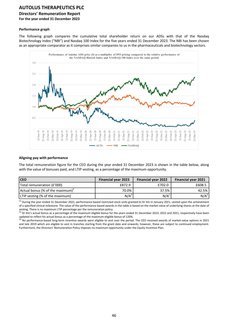 Performance graph The following graph compares the cumulative total shareholder return on our ADSs with that of the Nasdaq Biotechnology Index (“NBI”) and Nasdaq 100 Index for the five years ended 31 December 2023. The NBI has been chosen as an appropriate comparator as it comprises similar companies to us in the pharmaceuticals and biotechnology sectors. Aligning pay with performance The total remuneration figure for the CEO during the year ended 31 December 2023 is shown in the table below, along with the value of bonuses paid, and LTIP vesting, as a percentage of the maximum opportunity. CEO Financial year 2023 Financial year 2022 Financial year 2021 Total remuneration (£’000) £872.9 £702.0 £608.5 Actual bonus (% of the maximum)2 70.0% 37.5% 42.5% LTIP vesting (% of the maximum) N/A3 N/A1 N/A3 (1) During the year ended 31 December 2022, performance-based restricted stock units granted to Dr Itin in January 2021, vested upon the achievement of a specified clinical milestone. The value of the performance-based awards in the table is based on the market value of underlying shares at the date of vesting. There is no maximum LTIP percentage per the remuneration policy. (2) Dr Itin’s actual bonus as a percentage of the maximum eligible bonus for the years ended 31 December 2023, 2022 and 2021, respectively have been updated to reflect his actual bonus as a percentage of the maximum eligible bonus of 120%. (3) No performance-based long-term incentive awards were eligible to vest over the period. The CEO received awards of market-value options in 2021 and late 2019 which are eligible to vest in tranches starting from the grant date and onwards; however, these are subject to continued employment. Furthermore, the Directors’ Remuneration Policy imposes no maximum opportunity under the Equity Incentive Plan. AUTOLUS THERAPEUTICS PLC Directors’ Remuneration Report For the year ended 31 December 2023 46