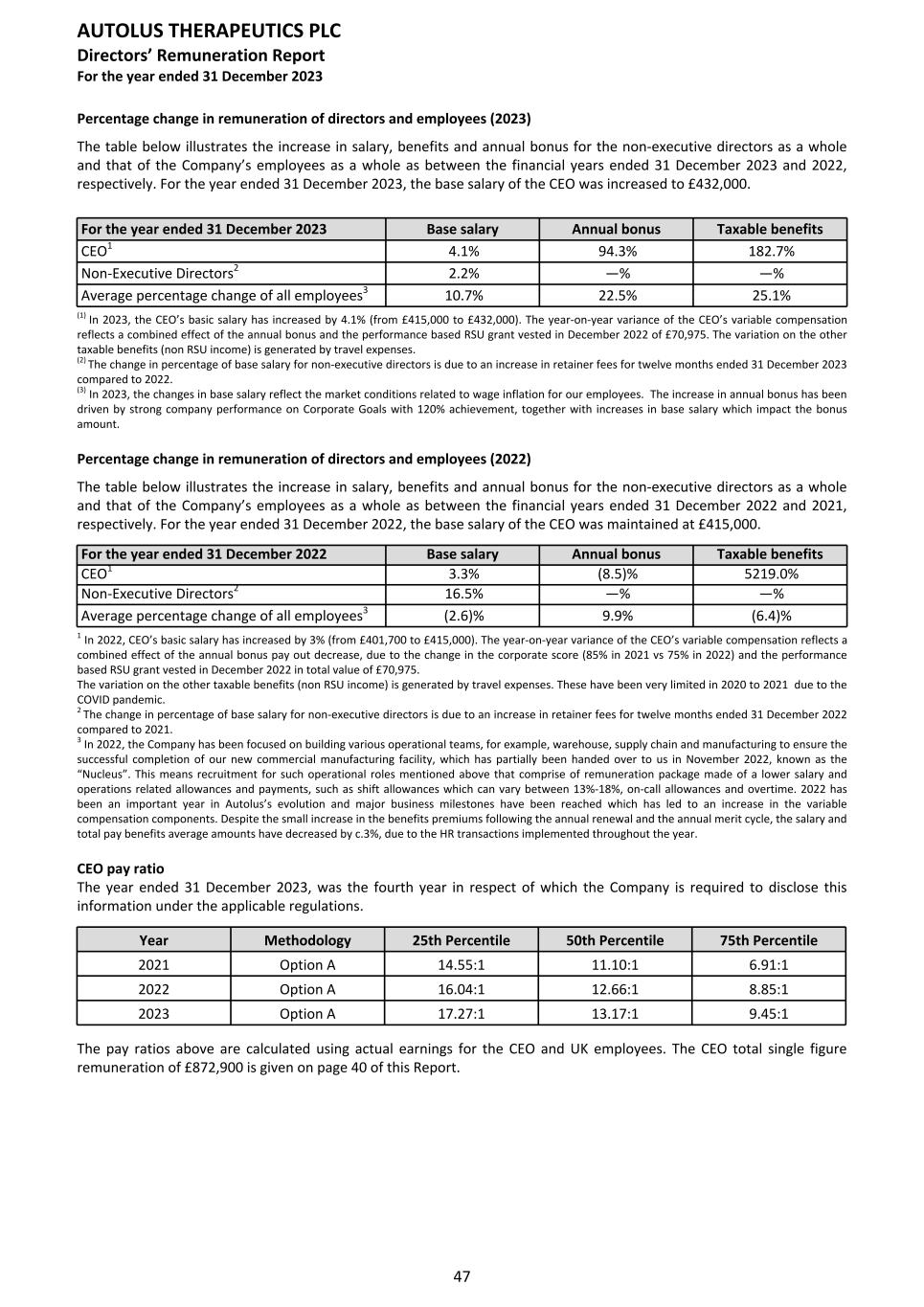 Percentage change in remuneration of directors and employees (2023) The table below illustrates the increase in salary, benefits and annual bonus for the non-executive directors as a whole and that of the Company’s employees as a whole as between the financial years ended 31 December 2023 and 2022, respectively. For the year ended 31 December 2023, the base salary of the CEO was increased to £432,000. For the year ended 31 December 2023 Base salary Annual bonus Taxable benefits CEO1 4.1% 94.3% 182.7% Non-Executive Directors2 2.2% —% —% Average percentage change of all employees3 10.7% 22.5% 25.1% (1) In 2023, the CEO’s basic salary has increased by 4.1% (from £415,000 to £432,000). The year-on-year variance of the CEO’s variable compensation reflects a combined effect of the annual bonus and the performance based RSU grant vested in December 2022 of £70,975. The variation on the other taxable benefits (non RSU income) is generated by travel expenses. (2) The change in percentage of base salary for non-executive directors is due to an increase in retainer fees for twelve months ended 31 December 2023 compared to 2022. (3) In 2023, the changes in base salary reflect the market conditions related to wage inflation for our employees. The increase in annual bonus has been driven by strong company performance on Corporate Goals with 120% achievement, together with increases in base salary which impact the bonus amount. Percentage change in remuneration of directors and employees (2022) The table below illustrates the increase in salary, benefits and annual bonus for the non-executive directors as a whole and that of the Company’s employees as a whole as between the financial years ended 31 December 2022 and 2021, respectively. For the year ended 31 December 2022, the base salary of the CEO was maintained at £415,000. For the year ended 31 December 2022 Base salary Annual bonus Taxable benefits CEO1 3.3% (8.5)% 5219.0% Non-Executive Directors2 16.5% —% —% Average percentage change of all employees3 (2.6)% 9.9% (6.4)% 1 In 2022, CEO’s basic salary has increased by 3% (from £401,700 to £415,000). The year-on-year variance of the CEO’s variable compensation reflects a combined effect of the annual bonus pay out decrease, due to the change in the corporate score (85% in 2021 vs 75% in 2022) and the performance based RSU grant vested in December 2022 in total value of £70,975. The variation on the other taxable benefits (non RSU income) is generated by travel expenses. These have been very limited in 2020 to 2021 due to the COVID pandemic. 2 The change in percentage of base salary for non-executive directors is due to an increase in retainer fees for twelve months ended 31 December 2022 compared to 2021. 3 In 2022, the Company has been focused on building various operational teams, for example, warehouse, supply chain and manufacturing to ensure the successful completion of our new commercial manufacturing facility, which has partially been handed over to us in November 2022, known as the “Nucleus”. This means recruitment for such operational roles mentioned above that comprise of remuneration package made of a lower salary and operations related allowances and payments, such as shift allowances which can vary between 13%-18%, on-call allowances and overtime. 2022 has been an important year in Autolus’s evolution and major business milestones have been reached which has led to an increase in the variable compensation components. Despite the small increase in the benefits premiums following the annual renewal and the annual merit cycle, the salary and total pay benefits average amounts have decreased by c.3%, due to the HR transactions implemented throughout the year. CEO pay ratio The year ended 31 December 2023, was the fourth year in respect of which the Company is required to disclose this information under the applicable regulations. Year Methodology 25th Percentile 50th Percentile 75th Percentile 2021 Option A 14.55:1 11.10:1 6.91:1 2022 Option A 16.04:1 12.66:1 8.85:1 2023 Option A 17.27:1 13.17:1 9.45:1 The pay ratios above are calculated using actual earnings for the CEO and UK employees. The CEO total single figure remuneration of £872,900 is given on page 40 of this Report. AUTOLUS THERAPEUTICS PLC Directors’ Remuneration Report For the year ended 31 December 2023 47