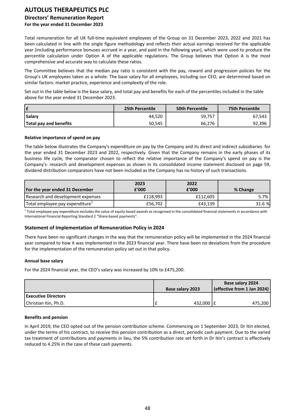 Total remuneration for all UK full-time equivalent employees of the Group on 31 December 2023, 2022 and 2021 has been calculated in line with the single figure methodology and reflects their actual earnings received for the applicable year (including performance bonuses accrued in a year, and paid in the following year), which were used to produce the percentile calculation under Option A of the applicable regulations. The Group believes that Option A is the most comprehensive and accurate way to calculate these ratios. The Committee believes that the median pay ratio is consistent with the pay, reward and progression policies for the Group’s UK employees taken as a whole. The base salary for all employees, including our CEO, are determined based on similar factors: market practice, experience and complexity of the role. Set out in the table below is the base salary, and total pay and benefits for each of the percentiles included in the table above for the year ended 31 December 2023. £ 25th Percentile 50th Percentile 75th Percentile Salary 44,520 59,757 67,543 Total pay and benefits 50,545 66,276 92,396 Relative importance of spend on pay The table below illustrates the Company's expenditure on pay by the Company and its direct and indirect subsidiaries for the year ended 31 December 2023 and 2022, respectively. Given that the Company remains in the early phases of its business life cycle, the comparator chosen to reflect the relative importance of the Company’s spend on pay is the Company's· research and development expenses as shown in its consolidated income statement disclosed on page 59, dividend distribution comparators have not been included as the Company has no history of such transactions. For the year ended 31 December 2023 £’000 2022 £’000 % Change Research and development expenses £118,993 £112,605 5.7% Total employee pay expenditure1 £56,702 £43,139 31.6 % 1 Total employee pay expenditure excludes the value of equity based awards as recognised in the consolidated financial statements in accordance with International Financial Reporting Standard 2 “Share-based payments”. Statement of Implementation of Remuneration Policy in 2024 There have been no significant changes in the way that the remuneration policy will be implemented in the 2024 financial year compared to how it was implemented in the 2023 financial year. There have been no deviations from the procedure for the implementation of the remuneration policy set out in that policy. Annual base salary For the 2024 financial year, the CEO’s salary was increased by 10% to £475,200. Base salary 2023 Base salary 2024 (effective from 1 Jan 2024) Executive Directors Christian Itin, Ph.D. £ 432,000 £ 475,200 Benefits and pension In April 2019, the CEO opted out of the pension contribution scheme. Commencing on 1 September 2023, Dr Itin elected, under the terms of his contract, to receive this pension contribution as a direct, periodic cash payment. Due to the varied tax treatment of contributions and payments in lieu, the 5% contribution rate set forth in Dr Itin’s contract is effectively reduced to 4.25% in the case of these cash payments. AUTOLUS THERAPEUTICS PLC Directors’ Remuneration Report For the year ended 31 December 2023 48
