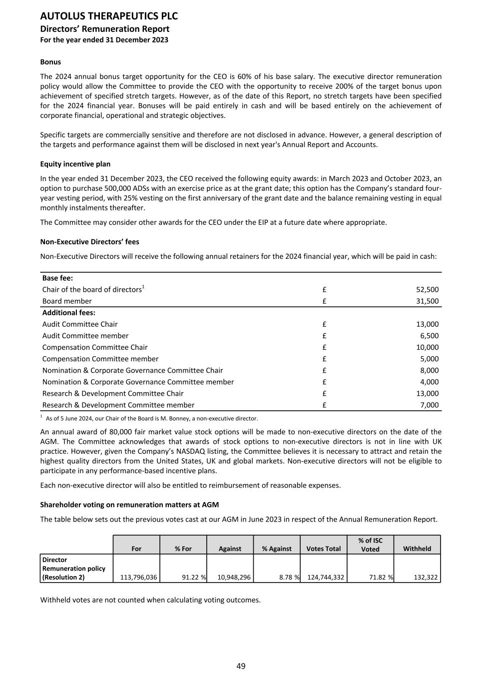 Bonus The 2024 annual bonus target opportunity for the CEO is 60% of his base salary. The executive director remuneration policy would allow the Committee to provide the CEO with the opportunity to receive 200% of the target bonus upon achievement of specified stretch targets. However, as of the date of this Report, no stretch targets have been specified for the 2024 financial year. Bonuses will be paid entirely in cash and will be based entirely on the achievement of corporate financial, operational and strategic objectives. Specific targets are commercially sensitive and therefore are not disclosed in advance. However, a general description of the targets and performance against them will be disclosed in next year's Annual Report and Accounts. Equity incentive plan In the year ended 31 December 2023, the CEO received the following equity awards: in March 2023 and October 2023, an option to purchase 500,000 ADSs with an exercise price as at the grant date; this option has the Company’s standard four- year vesting period, with 25% vesting on the first anniversary of the grant date and the balance remaining vesting in equal monthly instalments thereafter. The Committee may consider other awards for the CEO under the EIP at a future date where appropriate. Non-Executive Directors’ fees Non-Executive Directors will receive the following annual retainers for the 2024 financial year, which will be paid in cash: Base fee: Chair of the board of directors1 £ 52,500 Board member £ 31,500 Additional fees: Audit Committee Chair £ 13,000 Audit Committee member £ 6,500 Compensation Committee Chair £ 10,000 Compensation Committee member £ 5,000 Nomination & Corporate Governance Committee Chair £ 8,000 Nomination & Corporate Governance Committee member £ 4,000 Research & Development Committee Chair £ 13,000 Research & Development Committee member £ 7,000 1 As of 5 June 2024, our Chair of the Board is M. Bonney, a non-executive director. An annual award of 80,000 fair market value stock options will be made to non-executive directors on the date of the AGM. The Committee acknowledges that awards of stock options to non-executive directors is not in line with UK practice. However, given the Company’s NASDAQ listing, the Committee believes it is necessary to attract and retain the highest quality directors from the United States, UK and global markets. Non-executive directors will not be eligible to participate in any performance-based incentive plans. Each non-executive director will also be entitled to reimbursement of reasonable expenses. Shareholder voting on remuneration matters at AGM The table below sets out the previous votes cast at our AGM in June 2023 in respect of the Annual Remuneration Report. For % For Against % Against Votes Total % of ISC Voted Withheld Director Remuneration policy (Resolution 2) 113,796,036 91.22 % 10,948,296 8.78 % 124,744,332 71.82 % 132,322 Withheld votes are not counted when calculating voting outcomes. AUTOLUS THERAPEUTICS PLC Directors’ Remuneration Report For the year ended 31 December 2023 49