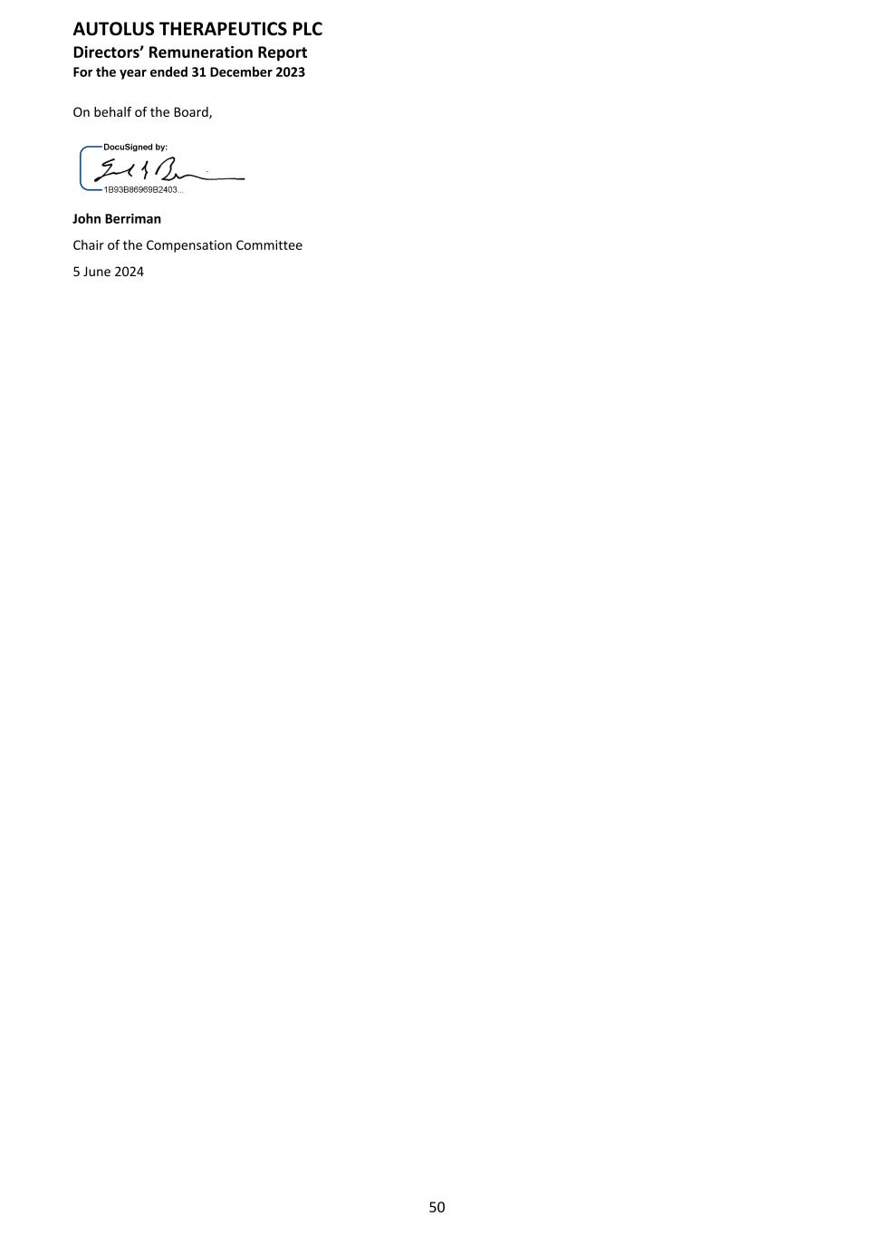 On behalf of the Board, John Berriman Chair of the Compensation Committee 5 June 2024 AUTOLUS THERAPEUTICS PLC Directors’ Remuneration Report For the year ended 31 December 2023 50
