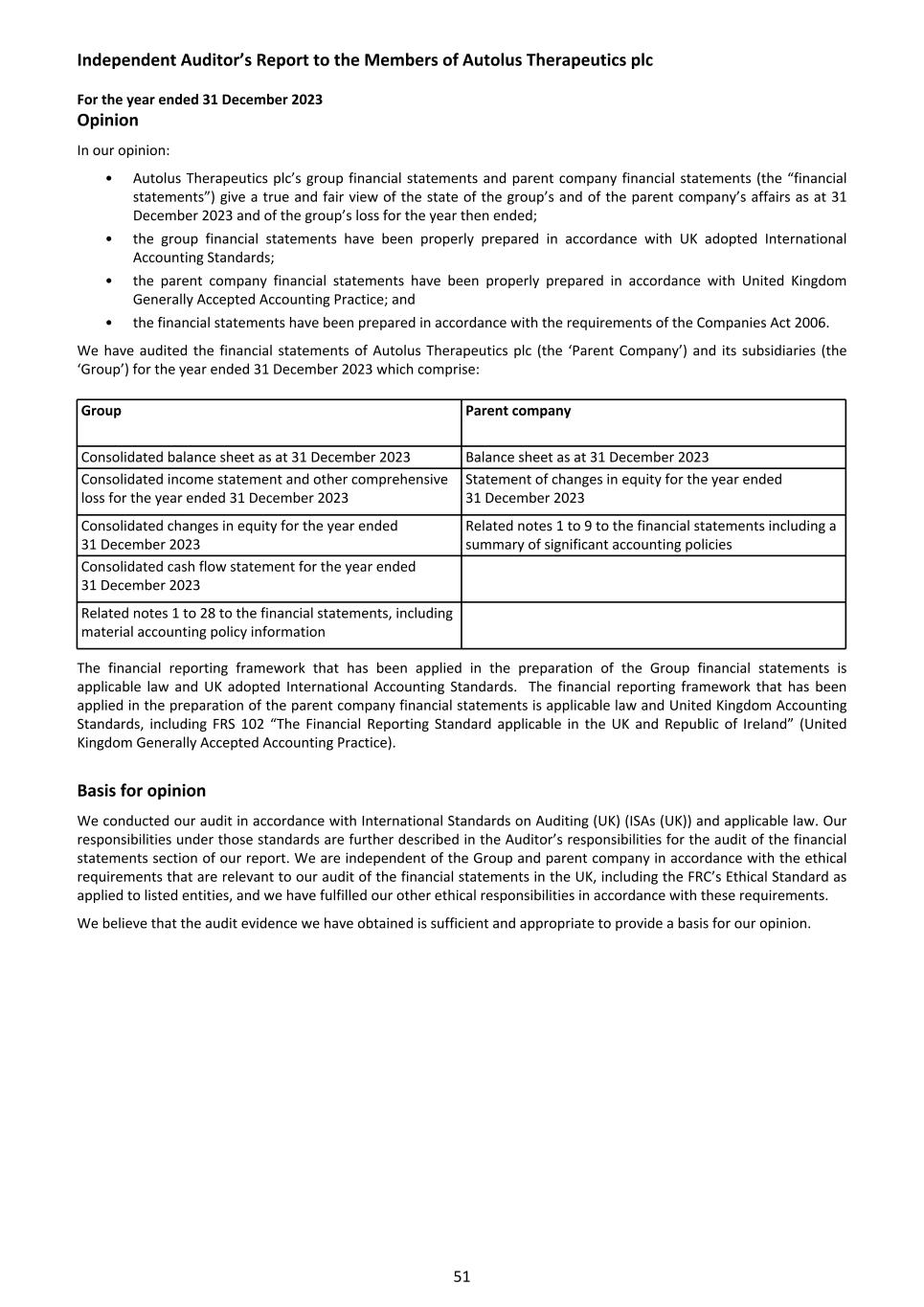 Opinion In our opinion: • Autolus Therapeutics plc’s group financial statements and parent company financial statements (the “financial statements”) give a true and fair view of the state of the group’s and of the parent company’s affairs as at 31 December 2023 and of the group’s loss for the year then ended; • the group financial statements have been properly prepared in accordance with UK adopted International Accounting Standards; • the parent company financial statements have been properly prepared in accordance with United Kingdom Generally Accepted Accounting Practice; and • the financial statements have been prepared in accordance with the requirements of the Companies Act 2006. We have audited the financial statements of Autolus Therapeutics plc (the ‘Parent Company’) and its subsidiaries (the ‘Group’) for the year ended 31 December 2023 which comprise: Group Parent company Consolidated balance sheet as at 31 December 2023 Balance sheet as at 31 December 2023 Consolidated income statement and other comprehensive loss for the year ended 31 December 2023 Statement of changes in equity for the year ended 31 December 2023 Consolidated changes in equity for the year ended 31 December 2023 Related notes 1 to 9 to the financial statements including a summary of significant accounting policies Consolidated cash flow statement for the year ended 31 December 2023 Related notes 1 to 28 to the financial statements, including material accounting policy information The financial reporting framework that has been applied in the preparation of the Group financial statements is applicable law and UK adopted International Accounting Standards. The financial reporting framework that has been applied in the preparation of the parent company financial statements is applicable law and United Kingdom Accounting Standards, including FRS 102 “The Financial Reporting Standard applicable in the UK and Republic of Ireland” (United Kingdom Generally Accepted Accounting Practice). Basis for opinion We conducted our audit in accordance with International Standards on Auditing (UK) (ISAs (UK)) and applicable law. Our responsibilities under those standards are further described in the Auditor’s responsibilities for the audit of the financial statements section of our report. We are independent of the Group and parent company in accordance with the ethical requirements that are relevant to our audit of the financial statements in the UK, including the FRC’s Ethical Standard as applied to listed entities, and we have fulfilled our other ethical responsibilities in accordance with these requirements. We believe that the audit evidence we have obtained is sufficient and appropriate to provide a basis for our opinion. Independent Auditor’s Report to the Members of Autolus Therapeutics plc For the year ended 31 December 2023 51