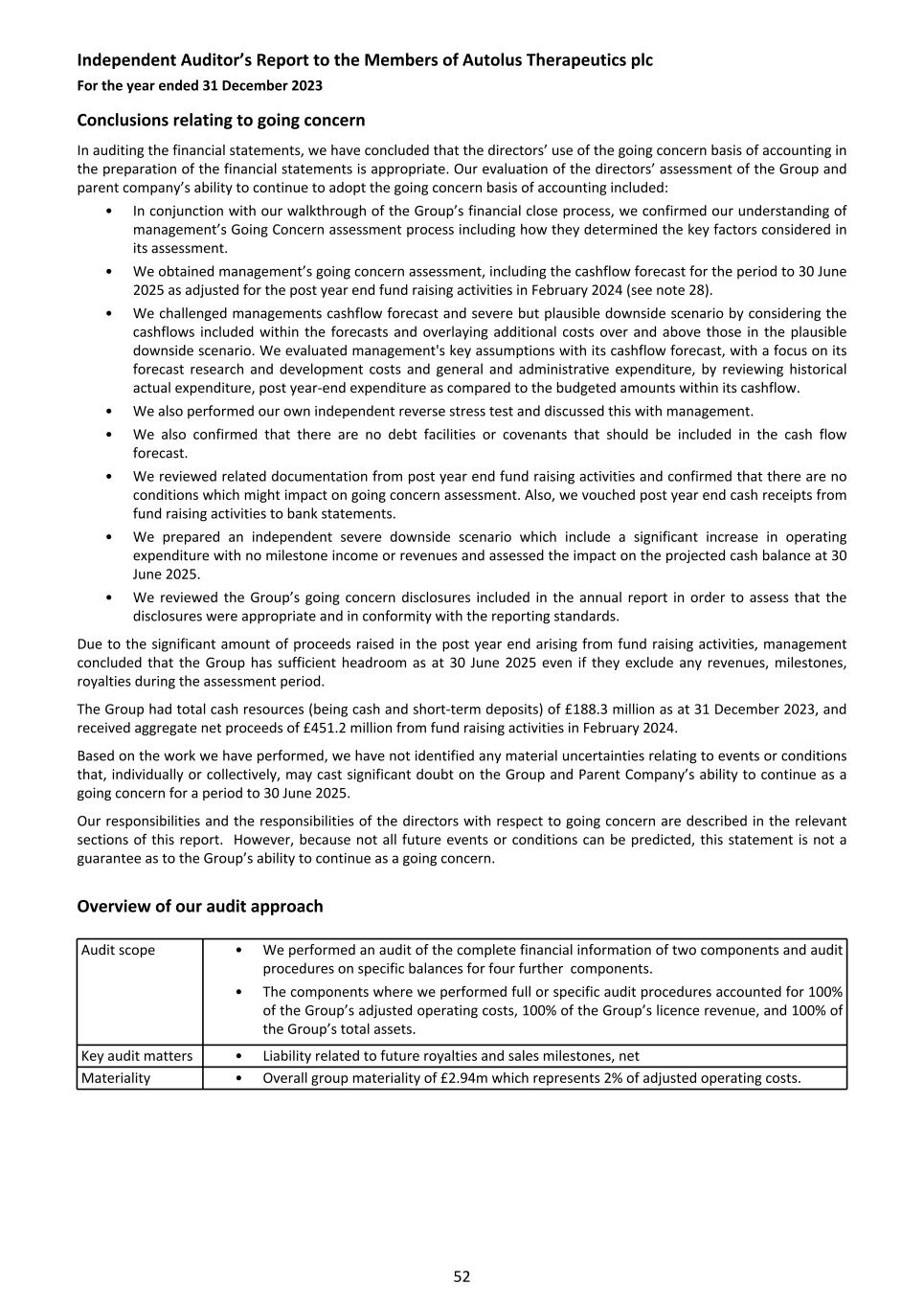 Conclusions relating to going concern In auditing the financial statements, we have concluded that the directors’ use of the going concern basis of accounting in the preparation of the financial statements is appropriate. Our evaluation of the directors’ assessment of the Group and parent company’s ability to continue to adopt the going concern basis of accounting included: • In conjunction with our walkthrough of the Group’s financial close process, we confirmed our understanding of management’s Going Concern assessment process including how they determined the key factors considered in its assessment. • We obtained management’s going concern assessment, including the cashflow forecast for the period to 30 June 2025 as adjusted for the post year end fund raising activities in February 2024 (see note 28). • We challenged managements cashflow forecast and severe but plausible downside scenario by considering the cashflows included within the forecasts and overlaying additional costs over and above those in the plausible downside scenario. We evaluated management's key assumptions with its cashflow forecast, with a focus on its forecast research and development costs and general and administrative expenditure, by reviewing historical actual expenditure, post year-end expenditure as compared to the budgeted amounts within its cashflow. • We also performed our own independent reverse stress test and discussed this with management. • We also confirmed that there are no debt facilities or covenants that should be included in the cash flow forecast. • We reviewed related documentation from post year end fund raising activities and confirmed that there are no conditions which might impact on going concern assessment. Also, we vouched post year end cash receipts from fund raising activities to bank statements. • We prepared an independent severe downside scenario which include a significant increase in operating expenditure with no milestone income or revenues and assessed the impact on the projected cash balance at 30 June 2025. • We reviewed the Group’s going concern disclosures included in the annual report in order to assess that the disclosures were appropriate and in conformity with the reporting standards. Due to the significant amount of proceeds raised in the post year end arising from fund raising activities, management concluded that the Group has sufficient headroom as at 30 June 2025 even if they exclude any revenues, milestones, royalties during the assessment period. The Group had total cash resources (being cash and short-term deposits) of £188.3 million as at 31 December 2023, and received aggregate net proceeds of £451.2 million from fund raising activities in February 2024. Based on the work we have performed, we have not identified any material uncertainties relating to events or conditions that, individually or collectively, may cast significant doubt on the Group and Parent Company’s ability to continue as a going concern for a period to 30 June 2025. Our responsibilities and the responsibilities of the directors with respect to going concern are described in the relevant sections of this report. However, because not all future events or conditions can be predicted, this statement is not a guarantee as to the Group’s ability to continue as a going concern. Overview of our audit approach Audit scope • We performed an audit of the complete financial information of two components and audit procedures on specific balances for four further components. • The components where we performed full or specific audit procedures accounted for 100% of the Group’s adjusted operating costs, 100% of the Group’s licence revenue, and 100% of the Group’s total assets. Key audit matters • Liability related to future royalties and sales milestones, net Materiality • Overall group materiality of £2.94m which represents 2% of adjusted operating costs. Independent Auditor’s Report to the Members of Autolus Therapeutics plc For the year ended 31 December 2023 52