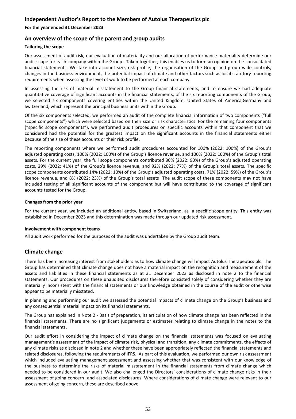 An overview of the scope of the parent and group audits Tailoring the scope Our assessment of audit risk, our evaluation of materiality and our allocation of performance materiality determine our audit scope for each company within the Group. Taken together, this enables us to form an opinion on the consolidated financial statements. We take into account size, risk profile, the organisation of the Group and group wide controls, changes in the business environment, the potential impact of climate and other factors such as local statutory reporting requirements when assessing the level of work to be performed at each company. In assessing the risk of material misstatement to the Group financial statements, and to ensure we had adequate quantitative coverage of significant accounts in the financial statements, of the six reporting components of the Group, we selected six components covering entities within the United Kingdom, United States of America,Germany and Switzerland, which represent the principal business units within the Group. Of the six components selected, we performed an audit of the complete financial information of two components (“full scope components”) which were selected based on their size or risk characteristics. For the remaining four components (“specific scope components”), we performed audit procedures on specific accounts within that component that we considered had the potential for the greatest impact on the significant accounts in the financial statements either because of the size of these accounts or their risk profile. The reporting components where we performed audit procedures accounted for 100% (2022: 100%) of the Group’s adjusted operating costs, 100% (2022: 100%) of the Group’s licence revenue, and 100% (2022: 100%) of the Group’s total assets. For the current year, the full scope components contributed 86% (2022: 90%) of the Group’s adjusted operating costs, 29% (2022: 41%) of the Group’s licence revenue, and 92% (2022: 77%) of the Group’s total assets. The specific scope components contributed 14% (2022: 10%) of the Group’s adjusted operating costs, 71% (2022: 59%) of the Group’s licence revenue, and 8% (2022: 23%) of the Group’s total assets The audit scope of these components may not have included testing of all significant accounts of the component but will have contributed to the coverage of significant accounts tested for the Group. Changes from the prior year For the current year, we included an additional entity, based in Switzerland, as a specific scope entity. This entity was established in December 2023 and this determination was made through our updated risk assessment. Involvement with component teams All audit work performed for the purposes of the audit was undertaken by the Group audit team. Climate change There has been increasing interest from stakeholders as to how climate change will impact Autolus Therapeutics plc. The Group has determined that climate change does not have a material impact on the recognition and measurement of the assets and liabilities in these financial statements as at 31 December 2023 as disclosed in note 2 to the financial statements. Our procedures on these unaudited disclosures therefore consisted solely of considering whether they are materially inconsistent with the financial statements or our knowledge obtained in the course of the audit or otherwise appear to be materially misstated. In planning and performing our audit we assessed the potential impacts of climate change on the Group’s business and any consequential material impact on its financial statements. The Group has explained in Note 2 - Basis of preparation, its articulation of how climate change has been reflected in the financial statements. There are no significant judgements or estimates relating to climate change in the notes to the financial statements. Our audit effort in considering the impact of climate change on the financial statements was focused on evaluating management’s assessment of the impact of climate risk, physical and transition, any climate commitments, the effects of any climate risks as disclosed in note 2 and whether these have been appropriately reflected the financial statements and related disclosures, following the requirements of IFRS. As part of this evaluation, we performed our own risk assessment which included evaluating management assessment and assessing whether that was consistent with our knowledge of the business to determine the risks of material misstatement in the financial statements from climate change which needed to be considered in our audit. We also challenged the Directors’ considerations of climate change risks in their assessment of going concern and associated disclosures. Where considerations of climate change were relevant to our assessment of going concern, these are described above. Independent Auditor’s Report to the Members of Autolus Therapeutics plc For the year ended 31 December 2023 53
