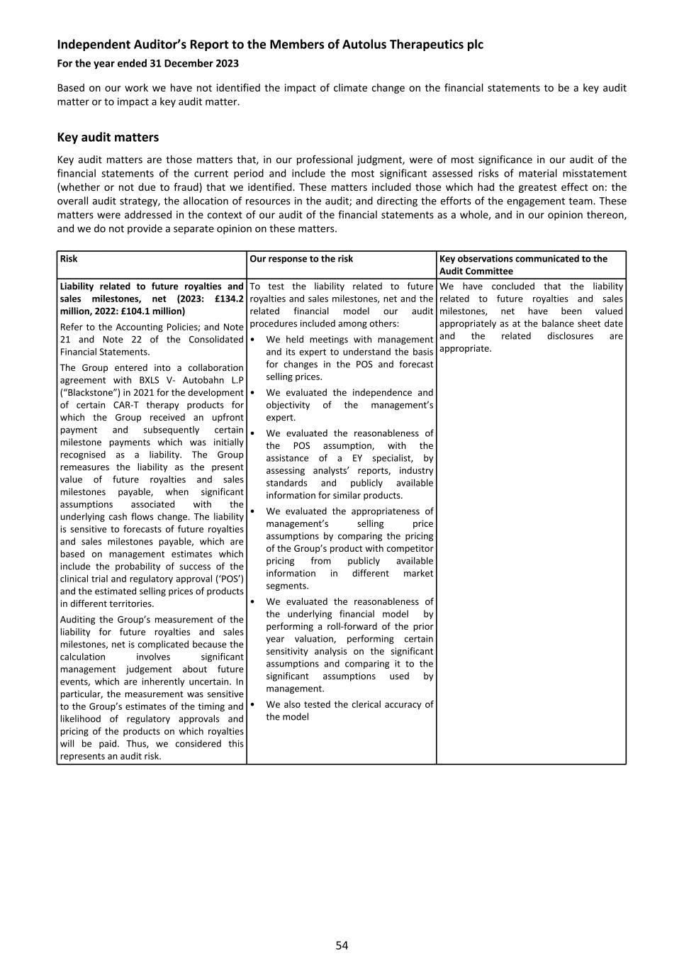 Based on our work we have not identified the impact of climate change on the financial statements to be a key audit matter or to impact a key audit matter. Key audit matters Key audit matters are those matters that, in our professional judgment, were of most significance in our audit of the financial statements of the current period and include the most significant assessed risks of material misstatement (whether or not due to fraud) that we identified. These matters included those which had the greatest effect on: the overall audit strategy, the allocation of resources in the audit; and directing the efforts of the engagement team. These matters were addressed in the context of our audit of the financial statements as a whole, and in our opinion thereon, and we do not provide a separate opinion on these matters. Risk Our response to the risk Key observations communicated to the Audit Committee Liability related to future royalties and sales milestones, net (2023: £134.2 million, 2022: £104.1 million) Refer to the Accounting Policies; and Note 21 and Note 22 of the Consolidated Financial Statements. The Group entered into a collaboration agreement with BXLS V- Autobahn L.P (“Blackstone”) in 2021 for the development of certain CAR-T therapy products for which the Group received an upfront payment and subsequently certain milestone payments which was initially recognised as a liability. The Group remeasures the liability as the present value of future royalties and sales milestones payable, when significant assumptions associated with the underlying cash flows change. The liability is sensitive to forecasts of future royalties and sales milestones payable, which are based on management estimates which include the probability of success of the clinical trial and regulatory approval (‘POS’) and the estimated selling prices of products in different territories. Auditing the Group’s measurement of the liability for future royalties and sales milestones, net is complicated because the calculation involves significant management judgement about future events, which are inherently uncertain. In particular, the measurement was sensitive to the Group’s estimates of the timing and likelihood of regulatory approvals and pricing of the products on which royalties will be paid. Thus, we considered this represents an audit risk. To test the liability related to future royalties and sales milestones, net and the related financial model our audit procedures included among others: • We held meetings with management and its expert to understand the basis for changes in the POS and forecast selling prices. • We evaluated the independence and objectivity of the management’s expert. • We evaluated the reasonableness of the POS assumption, with the assistance of a EY specialist, by assessing analysts’ reports, industry standards and publicly available information for similar products. • We evaluated the appropriateness of management’s selling price assumptions by comparing the pricing of the Group’s product with competitor pricing from publicly available information in different market segments. • We evaluated the reasonableness of the underlying financial model by performing a roll-forward of the prior year valuation, performing certain sensitivity analysis on the significant assumptions and comparing it to the significant assumptions used by management. • We also tested the clerical accuracy of the model We have concluded that the liability related to future royalties and sales milestones, net have been valued appropriately as at the balance sheet date and the related disclosures are appropriate. Independent Auditor’s Report to the Members of Autolus Therapeutics plc For the year ended 31 December 2023 54