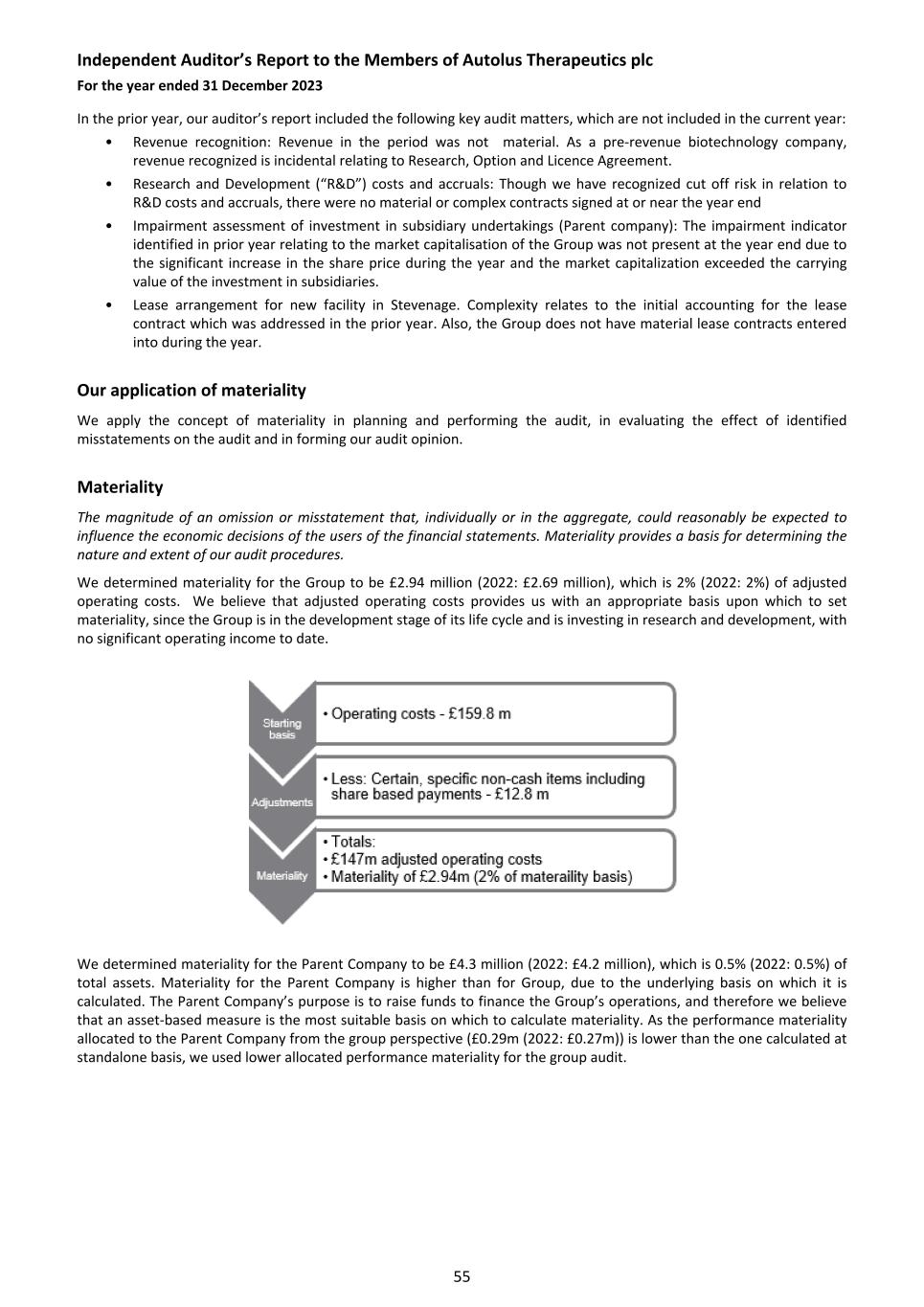 In the prior year, our auditor’s report included the following key audit matters, which are not included in the current year: • Revenue recognition: Revenue in the period was not material. As a pre-revenue biotechnology company, revenue recognized is incidental relating to Research, Option and Licence Agreement. • Research and Development (“R&D”) costs and accruals: Though we have recognized cut off risk in relation to R&D costs and accruals, there were no material or complex contracts signed at or near the year end • Impairment assessment of investment in subsidiary undertakings (Parent company): The impairment indicator identified in prior year relating to the market capitalisation of the Group was not present at the year end due to the significant increase in the share price during the year and the market capitalization exceeded the carrying value of the investment in subsidiaries. • Lease arrangement for new facility in Stevenage. Complexity relates to the initial accounting for the lease contract which was addressed in the prior year. Also, the Group does not have material lease contracts entered into during the year. Our application of materiality We apply the concept of materiality in planning and performing the audit, in evaluating the effect of identified misstatements on the audit and in forming our audit opinion. Materiality The magnitude of an omission or misstatement that, individually or in the aggregate, could reasonably be expected to influence the economic decisions of the users of the financial statements. Materiality provides a basis for determining the nature and extent of our audit procedures. We determined materiality for the Group to be £2.94 million (2022: £2.69 million), which is 2% (2022: 2%) of adjusted operating costs. We believe that adjusted operating costs provides us with an appropriate basis upon which to set materiality, since the Group is in the development stage of its life cycle and is investing in research and development, with no significant operating income to date. We determined materiality for the Parent Company to be £4.3 million (2022: £4.2 million), which is 0.5% (2022: 0.5%) of total assets. Materiality for the Parent Company is higher than for Group, due to the underlying basis on which it is calculated. The Parent Company’s purpose is to raise funds to finance the Group’s operations, and therefore we believe that an asset-based measure is the most suitable basis on which to calculate materiality. As the performance materiality allocated to the Parent Company from the group perspective (£0.29m (2022: £0.27m)) is lower than the one calculated at standalone basis, we used lower allocated performance materiality for the group audit. Independent Auditor’s Report to the Members of Autolus Therapeutics plc For the year ended 31 December 2023 55