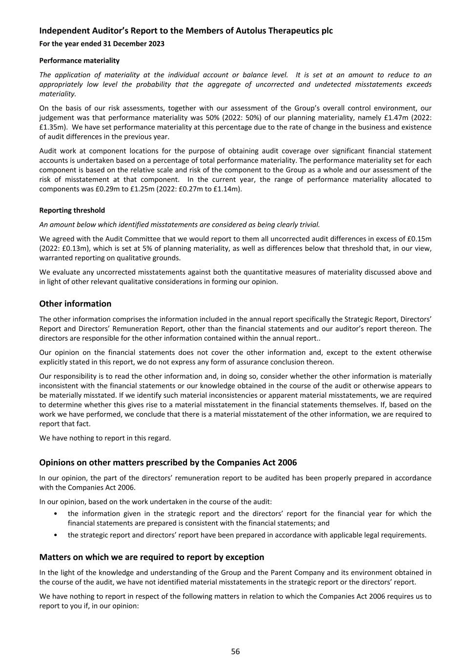 Performance materiality The application of materiality at the individual account or balance level. It is set at an amount to reduce to an appropriately low level the probability that the aggregate of uncorrected and undetected misstatements exceeds materiality. On the basis of our risk assessments, together with our assessment of the Group’s overall control environment, our judgement was that performance materiality was 50% (2022: 50%) of our planning materiality, namely £1.47m (2022: £1.35m). We have set performance materiality at this percentage due to the rate of change in the business and existence of audit differences in the previous year. Audit work at component locations for the purpose of obtaining audit coverage over significant financial statement accounts is undertaken based on a percentage of total performance materiality. The performance materiality set for each component is based on the relative scale and risk of the component to the Group as a whole and our assessment of the risk of misstatement at that component. In the current year, the range of performance materiality allocated to components was £0.29m to £1.25m (2022: £0.27m to £1.14m). Reporting threshold An amount below which identified misstatements are considered as being clearly trivial. We agreed with the Audit Committee that we would report to them all uncorrected audit differences in excess of £0.15m (2022: £0.13m), which is set at 5% of planning materiality, as well as differences below that threshold that, in our view, warranted reporting on qualitative grounds. We evaluate any uncorrected misstatements against both the quantitative measures of materiality discussed above and in light of other relevant qualitative considerations in forming our opinion. Other information The other information comprises the information included in the annual report specifically the Strategic Report, Directors’ Report and Directors’ Remuneration Report, other than the financial statements and our auditor’s report thereon. The directors are responsible for the other information contained within the annual report.. Our opinion on the financial statements does not cover the other information and, except to the extent otherwise explicitly stated in this report, we do not express any form of assurance conclusion thereon. Our responsibility is to read the other information and, in doing so, consider whether the other information is materially inconsistent with the financial statements or our knowledge obtained in the course of the audit or otherwise appears to be materially misstated. If we identify such material inconsistencies or apparent material misstatements, we are required to determine whether this gives rise to a material misstatement in the financial statements themselves. If, based on the work we have performed, we conclude that there is a material misstatement of the other information, we are required to report that fact. We have nothing to report in this regard. Opinions on other matters prescribed by the Companies Act 2006 In our opinion, the part of the directors’ remuneration report to be audited has been properly prepared in accordance with the Companies Act 2006. In our opinion, based on the work undertaken in the course of the audit: • the information given in the strategic report and the directors’ report for the financial year for which the financial statements are prepared is consistent with the financial statements; and • the strategic report and directors’ report have been prepared in accordance with applicable legal requirements. Matters on which we are required to report by exception In the light of the knowledge and understanding of the Group and the Parent Company and its environment obtained in the course of the audit, we have not identified material misstatements in the strategic report or the directors’ report. We have nothing to report in respect of the following matters in relation to which the Companies Act 2006 requires us to report to you if, in our opinion: Independent Auditor’s Report to the Members of Autolus Therapeutics plc For the year ended 31 December 2023 56