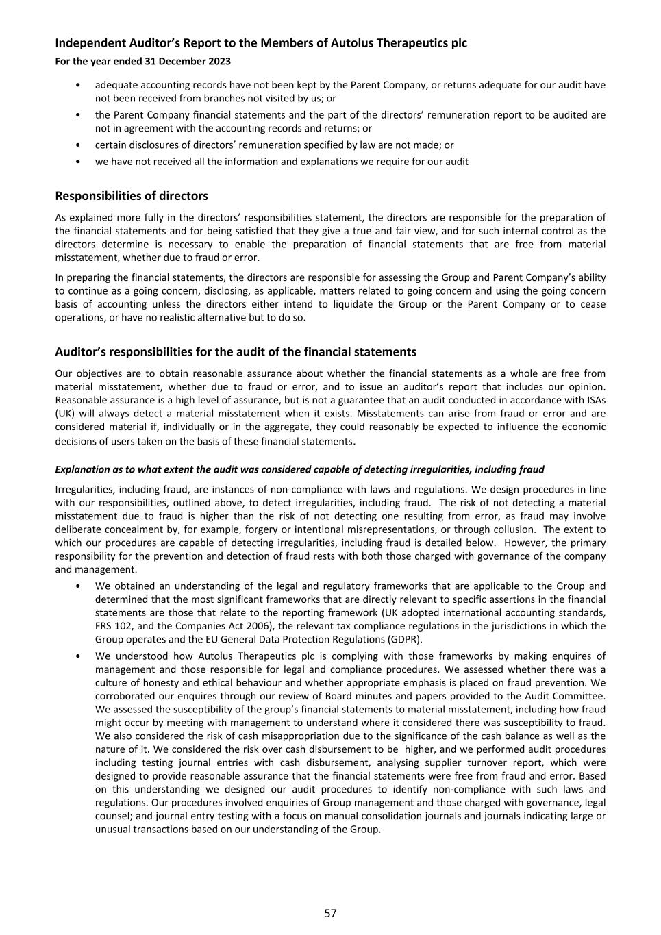 • adequate accounting records have not been kept by the Parent Company, or returns adequate for our audit have not been received from branches not visited by us; or • the Parent Company financial statements and the part of the directors’ remuneration report to be audited are not in agreement with the accounting records and returns; or • certain disclosures of directors’ remuneration specified by law are not made; or • we have not received all the information and explanations we require for our audit Responsibilities of directors As explained more fully in the directors’ responsibilities statement, the directors are responsible for the preparation of the financial statements and for being satisfied that they give a true and fair view, and for such internal control as the directors determine is necessary to enable the preparation of financial statements that are free from material misstatement, whether due to fraud or error. In preparing the financial statements, the directors are responsible for assessing the Group and Parent Company’s ability to continue as a going concern, disclosing, as applicable, matters related to going concern and using the going concern basis of accounting unless the directors either intend to liquidate the Group or the Parent Company or to cease operations, or have no realistic alternative but to do so. Auditor’s responsibilities for the audit of the financial statements Our objectives are to obtain reasonable assurance about whether the financial statements as a whole are free from material misstatement, whether due to fraud or error, and to issue an auditor’s report that includes our opinion. Reasonable assurance is a high level of assurance, but is not a guarantee that an audit conducted in accordance with ISAs (UK) will always detect a material misstatement when it exists. Misstatements can arise from fraud or error and are considered material if, individually or in the aggregate, they could reasonably be expected to influence the economic decisions of users taken on the basis of these financial statements. Explanation as to what extent the audit was considered capable of detecting irregularities, including fraud Irregularities, including fraud, are instances of non-compliance with laws and regulations. We design procedures in line with our responsibilities, outlined above, to detect irregularities, including fraud. The risk of not detecting a material misstatement due to fraud is higher than the risk of not detecting one resulting from error, as fraud may involve deliberate concealment by, for example, forgery or intentional misrepresentations, or through collusion. The extent to which our procedures are capable of detecting irregularities, including fraud is detailed below. However, the primary responsibility for the prevention and detection of fraud rests with both those charged with governance of the company and management. • We obtained an understanding of the legal and regulatory frameworks that are applicable to the Group and determined that the most significant frameworks that are directly relevant to specific assertions in the financial statements are those that relate to the reporting framework (UK adopted international accounting standards, FRS 102, and the Companies Act 2006), the relevant tax compliance regulations in the jurisdictions in which the Group operates and the EU General Data Protection Regulations (GDPR). • We understood how Autolus Therapeutics plc is complying with those frameworks by making enquires of management and those responsible for legal and compliance procedures. We assessed whether there was a culture of honesty and ethical behaviour and whether appropriate emphasis is placed on fraud prevention. We corroborated our enquires through our review of Board minutes and papers provided to the Audit Committee. We assessed the susceptibility of the group’s financial statements to material misstatement, including how fraud might occur by meeting with management to understand where it considered there was susceptibility to fraud. We also considered the risk of cash misappropriation due to the significance of the cash balance as well as the nature of it. We considered the risk over cash disbursement to be higher, and we performed audit procedures including testing journal entries with cash disbursement, analysing supplier turnover report, which were designed to provide reasonable assurance that the financial statements were free from fraud and error. Based on this understanding we designed our audit procedures to identify non-compliance with such laws and regulations. Our procedures involved enquiries of Group management and those charged with governance, legal counsel; and journal entry testing with a focus on manual consolidation journals and journals indicating large or unusual transactions based on our understanding of the Group. Independent Auditor’s Report to the Members of Autolus Therapeutics plc For the year ended 31 December 2023 57